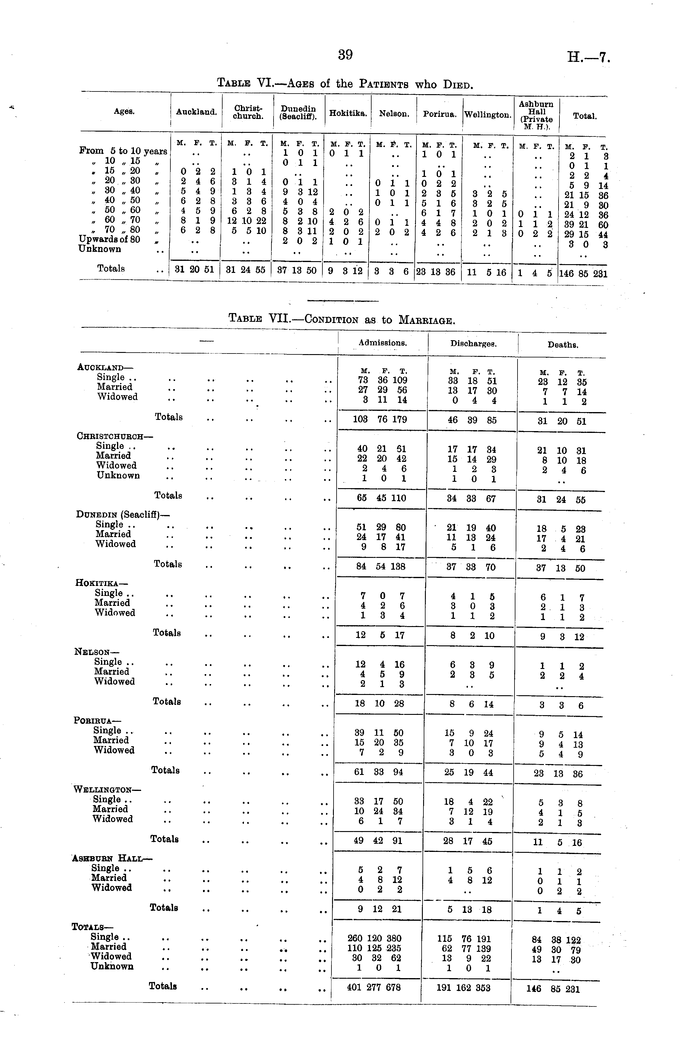 | Admissions. Discharges. ~~ I Deaths. Auckland— Single Married Widowed M. F. T. 73 36 109 27 29 56 3 11 14 M. F. T. 33 18 51 13 17 30 0 4 4 M. F. T. 23 12 35 7 7 14 1 1 2 Totals 103 76 179 46 39 85 31 20 51 Christchurch— Single Married Widowed Unknown 40 21 61 22 20 42 2 4 6 10 1 17 17 34 15 14 29 12 3 10 1 21 10 31 8 10 18 2 4 6 Totals 65 45 110 34 33 67 31 24 55 Dunedin (Seacliff) — Single Married Widowed 51 29 80 24 17 41 9 8 17 21 19 40 11 13 24 5 16 18 17 2 5 23 4 21 4 6 Totals 84 54 138 37 33 70 37 13 50 Hokitika— Single Married Widowed 7 4 1 0 2 3 7 6 4 4 3 1 1 0 1 5 3 2 6 2 1 1 1 1 7 3 2 Totals 12 5 17 8 2 10 9 3 12 Nelson— Single Married Widowed 12 4 2 4 16 5 9 1 3 6 2 3 3 9 5 1 2 1 2 2 4 Totals 18 10 28 8 6 14 3 3 0 Porirua — Single Married Widowed 39 11 50 15 20 35 7 2 9 15 9 24 7 10 17 3 0 3 9 y 5 5 14 4 13 4 9 Totals 61 33 94 25 19 44 23 13 36 Wellington— Single Married Widowed 33 17 50 10 24 34 6 17 18 4 22 7 12 19 3 1 4 5 4 2 3 1 1 8 5 3 Totals 49 42 91 28 17 45 11 5 16 Ashburn Hall— Single Married Widowed 5 4 0 2 7 8 12 2 2 1 4 5 6 8 12 1 0 0 1 1 2 2 1 2 Totals 9 12 21 5 13 18 1 4 5 Totals— Single Married Widowed Unknown 260 120 380 110 125 235 30 32 62 10 1 115 76 191 62 77 139 13 9 22 10 1 84 38 122 49 30 79 13 17 30 Totals 401 277 678 191 162 353 146 85 231