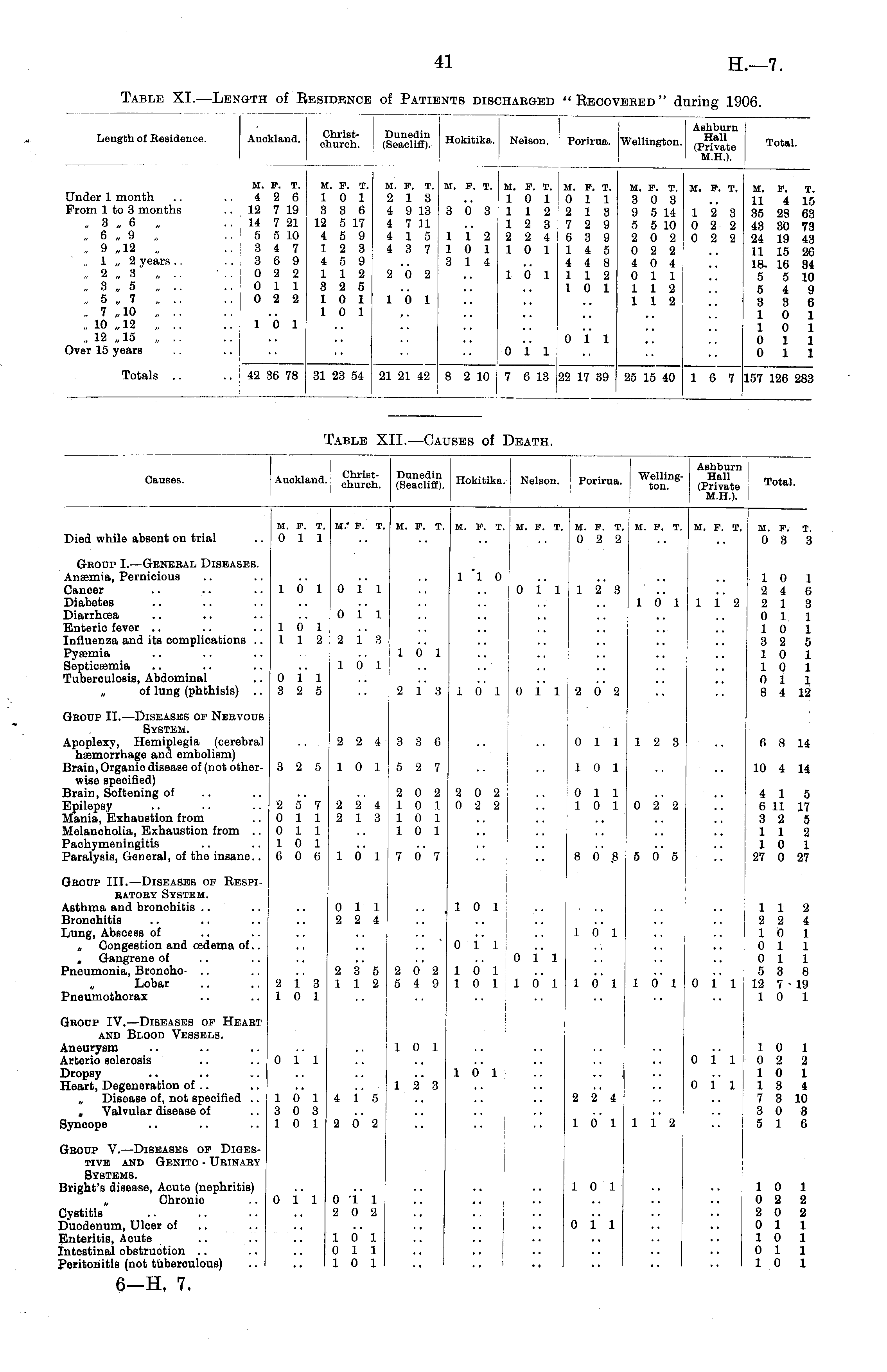 Length of Eesidence. Auckland. Christchurch. Dunedin ... ,_,. (Seacliff). Hokitika. Ashburn Nelson. Porirua. Wellington. M.H.). Total. Under 1 month From 1 to 3 months . 3 „ 6 „ .. 6 „ 9 „ „ 9 „12 „ „ 1 „ 2 years .. „ 2 „ 3 „ .. „ 3 „ 5 „ .. „ 5 „ 7 „ .. „ 7 „10 „ .. „ 10 „ 12 „ .. „ 12 „ 15 „ .. Over 15 years M. F. T. 4 2 6 12 7 19 14 7 21 5 5 10 3 4 7 3 6 9 0 2 2 0 11 0 2 2 10 1 M. F. T. 1 0 1 3 3 6 12 5 17 4 5 9 12 3 4 5 9 112 3 2 5 1 0 1 1 0 1 M. F. T. 2 13 4 9 13 4 7 11 4 15 4 3 7 2 0 2 M. F. T. 3 0 3 112 1 0 1 3 14 M. F. T. 10 1 112 12 3 2 2 4 1 0 1 1 0 1 M. F. T. Oil 2 13 7 2 9 6 3 9 14 5 4 4 8 112 1 0 1 M. F. T. 3 0 3 9 5 14 5 5 10 2 0 2 0 2 2 4 0 4 0 11 112 112 M. F. T. 12 3 0 2 2 0 2 2 M. F. T. 11 4 15 35 28 63 43 30 73 24 19 43 11 15 26 18. 16 34 5 5 10 5 4 9 3 3 6 10 1 10 1 0 11 0 1 1 10 1 0 i' 1 0 1 1 Totals .. 42 36 78 42 36 78 31 23 54 21 21 42 157 126 283 8 2 10 7 6 13 22 17 39 25 15 40 16 7
