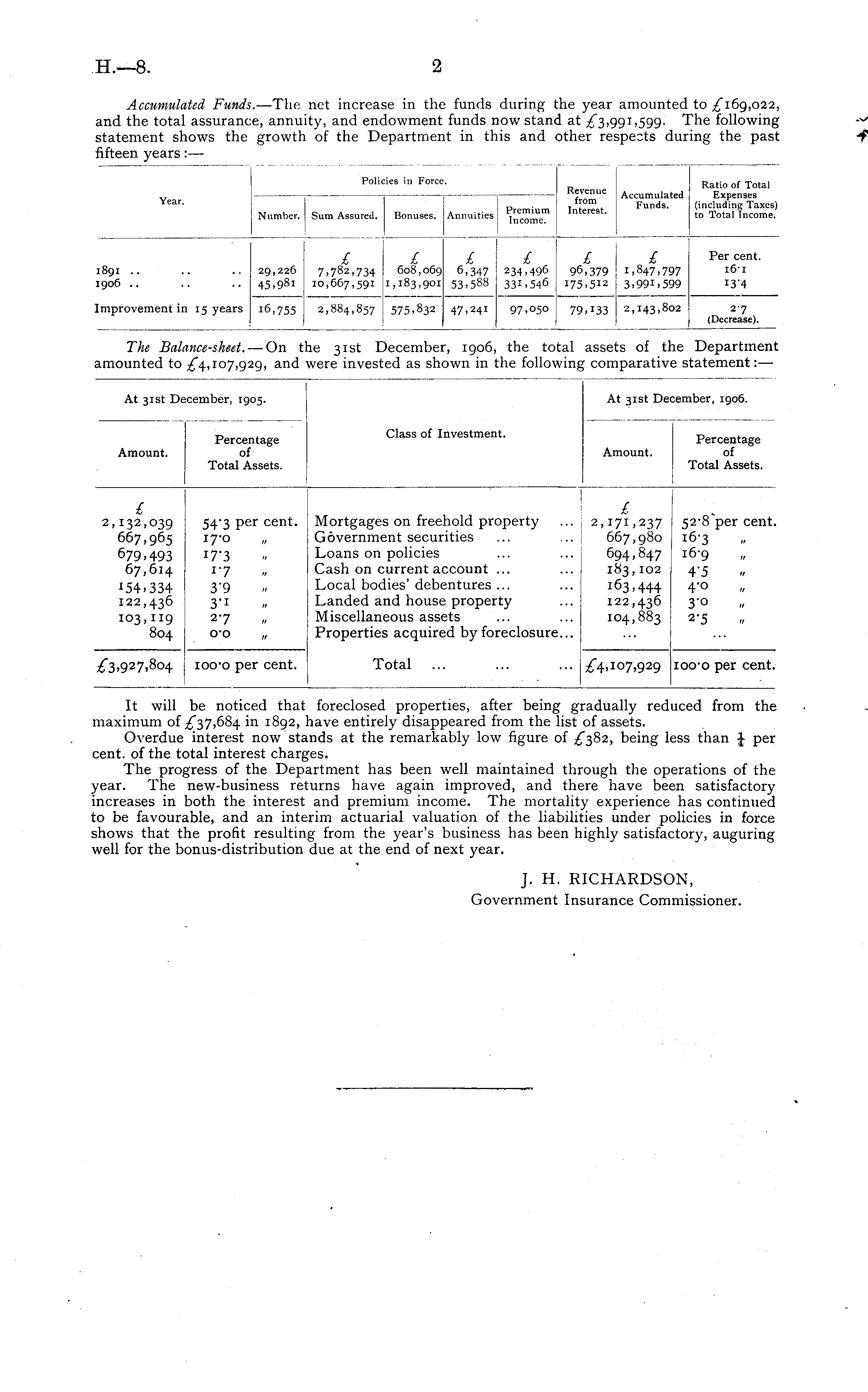 The Balance-sheet. —On the 31st December, 1906, the total assets of the Department amounted to £4,107,929, and were invested as shown in the following comparative statement: —