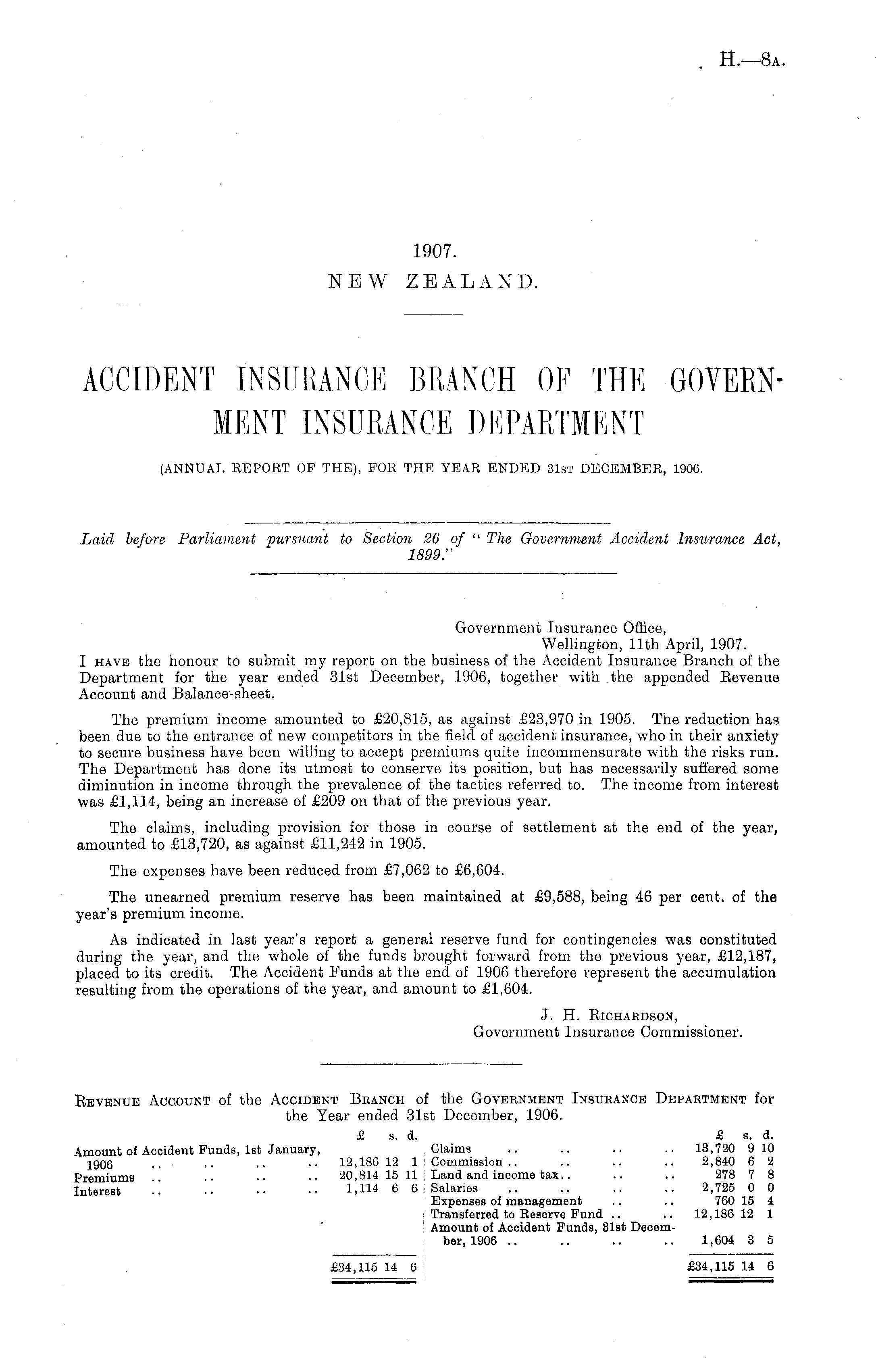 ACCIDENT INSURANCE BRANCH OF THE GOVERNMENT INSURANCE DEPARTMENT (ANNUAL REPORT OF THE), FOR THE YEAR ENDED 31st DECEMBER, 1906.