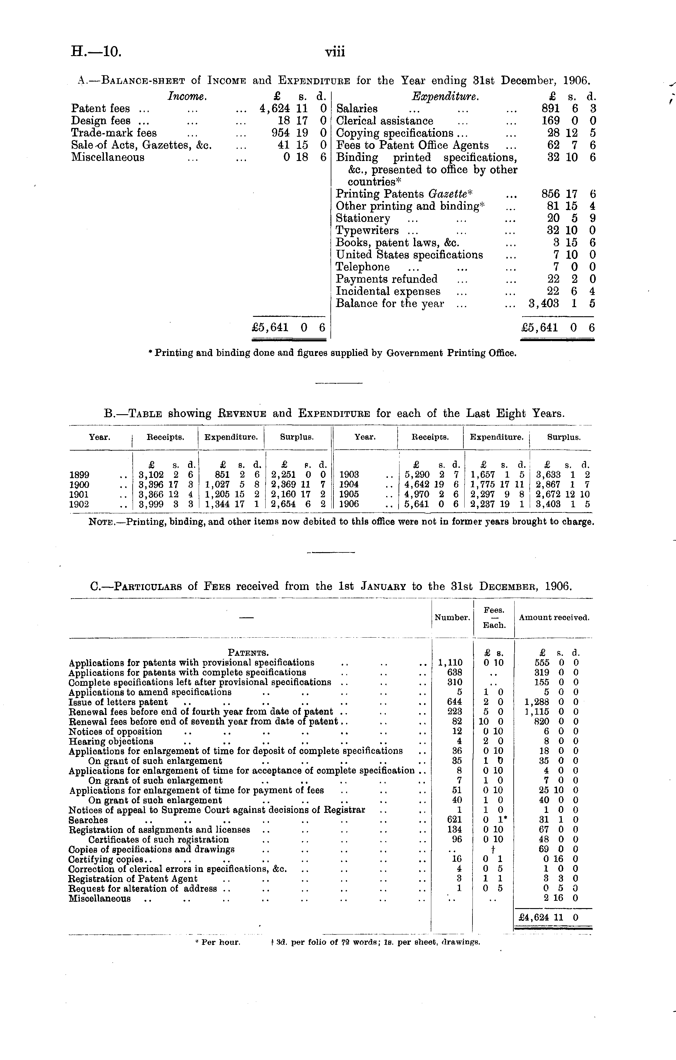A.—Balance-sheet of Income and Expenditure for the Year ending 31st December, 1906. Income. £ s. d. Expenditure. £ s. d. Patent fees ... ... ... 4,624 11 0 Salaries ... ... ... 891 6 3 Design fees ... ... ... 18 17 0 Clerical assistance ... ... 169 0 0 Trade-mark fees ... ... 954 19 01 Copying specifications... ... 28 12 5 Sale-of Acts, Gazettes, &c. ... 4115 0 Fees to Patent Office Agents ... 62 7 6 Miscellaneous ... ... 018 6 Binding printed specifications, 32 10 6 &c, presented to office by other countries* Printing Patents Gazette* ... 856 17 6 Other printing and binding* ... 81 15 4 Stationery ... ... ' ... 20 5 9 Typewriters ... ... ... 32 10 0 Books, patent laws, &c. ... 3 15 6 United States specifications ... 7 10 0 Telephone ... ... ... 7 0 0 Payments refunded ... ... 22 2 0 Incidental expenses ... ... 22 6 4 Balance for the year ... ... 3,403 1 5 £5,641 0 6 j £5,641 0 6 • Printing and binding done and figures supplied by Government Printing Office.