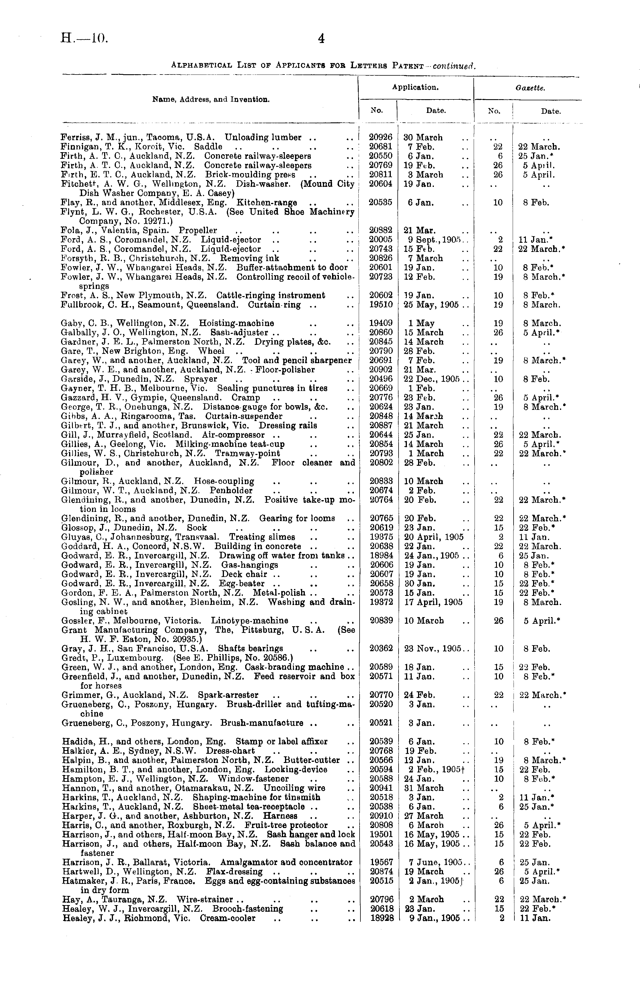 m> lical ;ion. l azette. Name, Address, and Invention. No. Date. No. Date. Ferriss, J. M., jun., Taooma, U.S.A. Unloading lumber .. Finnigan, T. K., Koroit, Vic Saddle .. Firth, A. T. C, Auckland, N.Z. Concrete railway-sleepers Firth, A- T. 0., Auckland, N.Z. Concrete railway-sleepers Firth, E. T. C, Auckland, N.Z. Brick-moulding press Fitohett, A. W. G., Wellington, N.Z. Dish-washer. (Mound City Dish Washer Company, E. A. Casey) Flay, R., and another, Middlesex, Eng. Kitohen-range Flynt, L. W. G., Rochester, U.S.A. (See United Shoe Machinery Company, No. 19271.) Fola, J., Valentia, Spain. Propeller Ford, A. S., Coromandel, N.Z. Liquid-ejeotor Ford, A. S, Coromandel, N.Z. Liquid-ejector .. Forsyth, R. B., Christchureh, N.Z. Removing ink Fowler, J. W., Whangarei Heads, N.Z. Buffer-attaohment to door Fowler, J. W., Whangarei Heads, N.Z. Controlling reooil of vehiclesprings Frost, A. S., New Plymouth, N.Z. Cattle-ringing instrument Fullbrook, C. H., Seamount, Queensland. Curtain ring .. 20926 20681 20550 20769 20811 20604 30 Maroh 7 Feb. 6 Jan. 19 Ptb. 3 March 19 Jan. 22 6 26 26 22 March. 25 Jan.* 5 Apiil. 5 April. 20535 6 Jan. 10 8 Feb. 20382 20005 20743 20826 20601 20723 21 Mar. 9 Sept., 1905.. 15 Feb. 7 March 19 Jan. 12 Feb. 2 22 11 Jan.* 22 March. , 10 19 8 Feb.'* 8 March.* 20602 19510 19 Jan. 25 May, 1905 .. 10 19 8 Feb.* 8 March. Gaby, C. B., Wellington, N.Z. Hoisting-machine Galbally, J. O., Wellington, N.Z. Sash-adjuster.. Gardner, J. E. L., Palmerston North, N.Z. Drying plates, &c Gare, T., New Brighton, Eng. Wheel .. Garey, W., and another, Auckland, N.Z. Tool and pencil sharpener Garey, W. E., and another, Auckland, N.Z. Floor-polisher Garside, J., Dunedin, N.Z. Sprayer Gayner, T. H. B., Melbourne, Vic. Sealing punctures in tires Gazzard, H. V., Gympie, Queensland. Cramp George, T. R., Onehunga, N.Z. Distance gauge for bowls, &c Gibbs, A. A., Ringarooma, Tas. Curtain-suspender Gilbi-rt, T. J,, and another, Brunswick, Vic Dressing rails Gill, J., Murrayfield, Scotland. Air-compressor .. Gillies, A., Geelong, Vic. Milking-machine teat-cup Gillies, W. S, Christchuich, N.Z. Tramway-point Gilrnour, D., and another, Auckland, N.Z. Floor cleaner and polisher Gilmour, R., Auckland, N.Z. Hose-coupling Gilmour, W. T., Auckland, N.Z. Penholder Glendining, B., and another, Dunedin, N.Z. Positive take-up motion in looms Glendining, R., and another, Dunedin, N.Z. Gearing for looms Glossop, J., Dunodin, N.Z. Sock Gluyas, C, Johannesburg, Transvaal. Treating slimes Goddard, H. A., Concord, N.S.W. Building in concrete .. Godward, E. R., Invercargill, N.Z. Drawing off water from tanks .. Godward, E. R., Inveroargill, N.Z. Gas-hangings Godward, E. R., Invercargill, N.Z. Deck chair .. Godward, E. R., Invercargill, N.Z. Egg-beater .. Gordon, F. E. A., Palmerston North, N.Z. Metal-polish Gosling, N. W., and another, Blenheim, N.Z. Washing and draining cabinet Gossler, F., Melbourne, Viotoria. Linotype-machine Grant Manufacturing Company, The, Pittsburg, U. S. A. (See H. W. F. Eaton, No. 20935.) Gray, J. H., San Franciso, U.S.A. Shafts bearings Gredt, P., Luxembourg. (See E. Phillips, No. 20586.) Green, W. J., and another, London, Eng. Cask-branding machine .. Greenfield, J., and another, Dunedin, N.Z. Feed reservoir and box for horses Grimmer, G., Auckland, N.Z. Spark-arrester Grueneberg, C., Poszony, Hungary. Brush-driller and tufting-ma-chine Grueneberg, C, Poszony, Hungary. Brush-manufaoture .. 19409 20860 20845 20790 20691 20902 20496 20669 20776 20624 20848 20887 20644 20854 20793 20802 1 May 15 March 14 March 28 Feb. 7 Feb. 21 Mar. 22 Dec, 1905 .. 1 Feb. 23 Feb. 23 Jan. 14 Marsh 21 March 25 Jan. ] 4 Maroh 1 March 28 Feb. 19 26 19 io 26 19 8 March. 5 April.* 8 March.* 8Fei>! 5 April.* 8 March.' 22 26 22 22 March. 5 April.* 22 March." 20833 20674 20764 10 March 2 Feb. 20 Feb. 22 22 March.* 20765 20619 19375 20638 18984 20606 20607 20658 20573 19372 20 Feb. 23 Jan. 20 April, 1905 22 Jan. 24 Jan., 1905 .. 19 Jan. 19 Jan. 30 Jan. 15 Jan. 17 April, 1905 22 15 2 22 6 10 10 15 15 19 22 March.* 22 Feb.* 11 Jan. 22 March. 25 Jan. 8 Feb.* 8 Feb.* 22 Feb.* 22 Feb.* 8 March. 20839 10 Maroh 26 5 April.* 20362 23 Nov., 1905.. 10 8 Feb. 20589 20571 18 Jan. 11 Jan. 15 10 22 Feb. 8 Feb.* 20770 20520 24 Feb. 3 Jan. 22 22 March.* 20521 3 Jan. Hadida, H., and others, London, Eng. Stamp or label affixer Halkier, A. E., Sydney, N.S.W. Dress-chart Halpin, B., and another, Palmerston North, N.Z. Butter-cutter .. Hamilton, B. T., and another, London, Eng. Locking-device Hampton, E. J., Wellington, N.Z. Window-fastener Hannon, T., and another, Otamarakau, N.Z. Uncoiling wire Harkins, T., Auckland, N.Z. Shaping-machine for tinsmith Haikins, T., Auckland, N.Z. Sheet-metal tea-reoeptacle .. Harper, J. G., and another, Ashburton, N.Z. Harness Harris, C, and another, Roxburgh, N.Z. Fruit-tree proteotor Harrison, J., and others, Half-moon Bay, N.Z. Sash hanger and lock Harrison, J., and others, Half-moon Bay, N.Z. Sash balanoe and fastener Harrison, J. R., Ballarat, Victoria. Amalgamator and concentrator Hartwell, D., Wellington, N.Z. Flax-dressing .. Hatmaker, J. R,, Paris, France. Eggs and egg-containing substanoes in dry form Hay, A., Tauranga, N.Z. Wire-strainer Healey, W. J., Inveroargill, N.Z. Brooch-fastening Healey, J. J., Riohmond, Vic. Cream-cooler 20539 20768 20566 20594 20588 20941 20518 20538 20910 20808 19501 20543 6 Jan. 19 Feb. 12 Jan. 2 Feb., 1905f 24 Jan. 31 March 3 Jan. 6 Jan. 27 March 6 March 16 May, 1905 .. 16 May, 1905 .. 10 19 15 10 2 6 8 Feb.* 8 March.* 22 Feb. 8 Feb.* 11 Jan.* 25 Jan.* 26 15 15 5 April.* 22 Feb. 22 Feb. 19567 20874 20515 7 June, 1905.. 19 March 2 Jan., 19051 6 26 6 25 Jan. 5 April.* 25 Jan. 20796 20618 18928 2 Maroh 23 Jan. 9 Jan., 1905 .. 22 15 2 22 March.* 22 Feb.* 11 Jan.