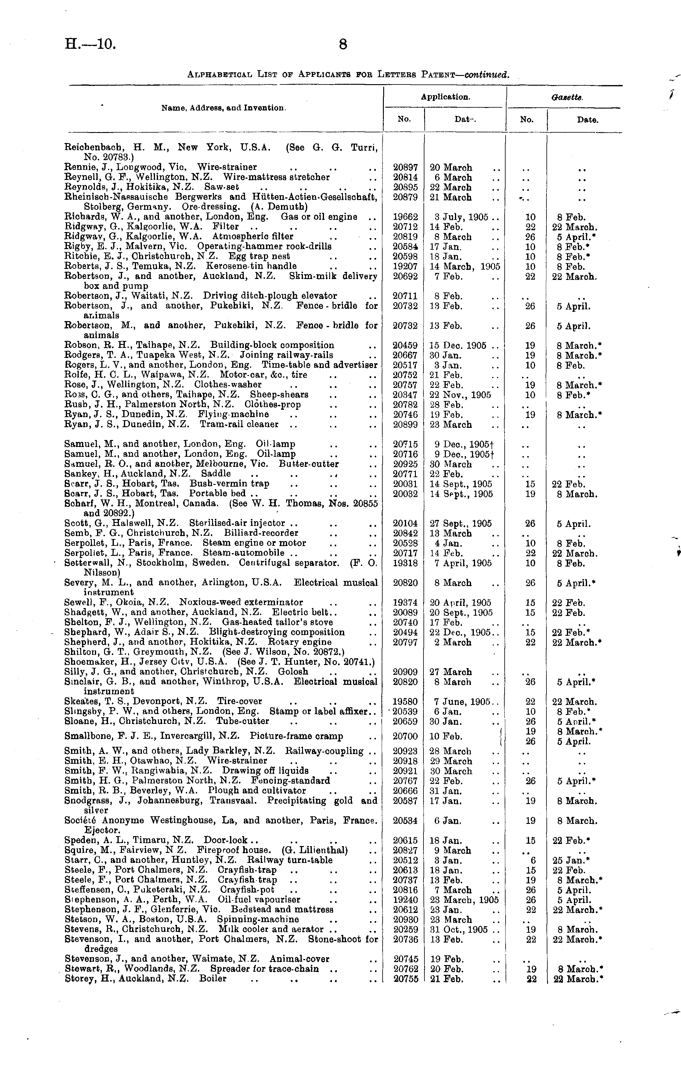 .pp] Ileal iion. izei Name, Address, and Invention No. Dat-. No. Date. Reichenbach, H. M., New York, U.S.A. (See G. G. Turri, No. 20783.) Rennie, J., Longwood, Vie. Wire-strainer Eeynell, G. F., Wellington, N.Z. Wire-mattress stretoher Reynolds, J., Hokitika, N.Z. Saw-set Rheinisch-Nassauische Bergwerks and Hutten-Actien-Gesellschaft, Stolberg, Germany. Ore-dressing. (A. Demuth) Richards, W. A., and another, London, Eng. Gas or oil engine Ridgway, G., Kalgoorlie, W.A. Filter .. Ridgwav, G., Kalgoorlie, W.A. Atmospherio filter Rigby, E. J., Malvern, Vic. Operating-hammer rook-drills Ritchie, E. J., Christchurch, N Z. Egg trap nest Roberts, J. S., Temuka, N.Z. Kerosene-tin handle Robertson, J., and another, Auckland, N.Z. Skim-milk delivery box and pump Robertson, J., Waitati, N.Z. Driving ditch-plough elevator Robertson, J., and another, Pukehiki, N.Z. Fence - bridle for animals Robertson, M., and another, Pukehiki, N.Z. Fence - bridle for animals Robson, R. H., Taihapa, N.Z. Building-block composition Rodgers, T. A., Tuapeka West, N.Z. Joining railway-rails Rogers, L. V., and another, London, Eng. Time-table and advertiser Rolfe, H. C. L., Waipawa, N.Z. Motor-car, &c, tire Rose, J., Wellington, N.Z. Clothes-washer Ro.?s, C. G., and others, Taihapo, N.Z. Sheep-shears Rush, J. H., Palmerston North, N.Z. Clothes-prop Ryan, J. S., Dunedin, N.Z. Flying machine Ryan, J. S., Dunedin, N.Z. Tram-rail cleaner .. 20897 20814 20895 20879 19662 20712 20819 20584 20598 19207 20692 20711 20732 20 March 6 March 22 Maroh 21 March 3 July, 1905 .. 14 Feb. 8 March 17 Jan. 18 Jan. 14 March, 1905 7 Feb. 8 Feb. 13 Feb. 10 22 26 10 10 10 22 8 Feb. 22 March. 5 April. , 8 Feb.* 8 Feb.* 8 Feb. 22 Maroh. 26 5 April. 20732 13 Feb. 26 5 April. 20459 20667 20517 20752 20757 20347 20782 20746 20899 15 Dec. 1905 .. 30 Jan. 3 Jim. 21 Feb. 22 Feb. 22 Nov., 1905 28 Feb. 19 Feb. 23 Maroh 19 19 10 8 Maroh. , 8 March. , 8 Feb. 19 10 8 March. , 8 Feb. , 19 8 March. , Samuel, M., and another, London, Eng. Oil-lamp Samuel, M., and another, London, Eng. Oil-lamp Srnnuel, R. O., and another, Melbourne, Vic Butter-outter Sankey, H., Auckland, N.Z. Saddle Searr, J. S., Hobart, Tas. Bush-vermin trap Scarr, J. S., Hobart, Tas. Portable bed .. Scharf, W. H., Montreal, Canada. (See W. H. Thomas, Nos. 20855 and 20892.) Scott, G., Halswell, N.Z. Sterilised-air injector .. Semb, F. G., Christchurch, N.Z. Billiard-recorder Serpollet, L., Paris, France. Steam engine or motor Serpollet, L., Paris, France. Steam-automobile .. Setterwall, N., Stockholm, Sweden. Centrifugal separator. (F. O. Nilsson) Severy, M. L., and another, Arlington, U.S.A. Electrical musical instrument Sewell, F., Okoia, N.Z. Noxious-weed exterminator Shadgett, W., and another, Auckland, N.Z. Electric belt.. Shelton, F. J., Wellington, N.Z. Gas-heated tailor's stove Shephard, W., Adair S., N.Z. Blight-destroying composition Shepherd, J., and another, Hokitika, N.Z. Rotary engine Shilton, G. T., Greymouth, N.Z. (See J. Wilson, No. 20872.) Shoemaker, H., Jersey Citv, U.S.A. (See J. T. Hunter, No. 20741.) Silly, J. G., and another, Christchuroh, N.Z. Golosh Sinclair, G. B., and another, Winthrop, U.S.A. Electrical musical instrument Skeates, T. S., Devonport, N.Z. Tire-cover Slingsby, P. W., and others, London, Eng. Stamp or label affixer.. Sloane, H., Christchurch, N.Z. Tube-cutter 20715 20716 20925 20771 20031 20032 9 Dec, 1905f 9 Dec, 1905t 30 Maroh 2-2 Feb. 14 Sept., 1905 14 Sfpt., 1905 15 19 22 Feb! 8 March. 20104 20842 20528 20717 19318 27 Sept., 1905 13 March 4 Jan. 14 Feb. 7 April, 1905 26 5 April. 10 22 10 8 Feb. 22 March. 8 Feb. 20820 8 Maroh 26 5 April.* 19374 20089 20740 20494 20797 20 April, 1905 20 Sept., 1905 17 Feb. 22 Deo., 1905.. 2 Muroh 15 15 22 Feb. 22 Feb. 15 22 22 Feb.' , 22 March. , 20909 20820 27 March 8 March 26 5 April.* 19580 ■ 20539 20659 7 June, 1905.. 6 Jan. 30 Jan. 10 Feb. 22 10 26 19 26 22 March. 8 Feb.* 5 April.* 8 March. , 5 April. Smallbone, F. J. E., Invercargill, N.Z. Pioture-frame cramp Smith, A. W., and others, Lady Barkley, N.Z. Railway-coupling .. Smith, E. H., Otawbao, N.Z. Wire-strainer Smith, F. W., Kangiwahia, N.Z. Drawing off liquids Smith, H. G., Palmerston North, N.Z. Fencing-standard Smith, R. B., Beverley, W.A. Plough and cultivator Snodgrass, J., Johannesburg, Transvaal. Precipitating gold and silver Societe Anonyme Westinghouse, La, and another, Paris, France. Ejector. Speden, A. L., Timaru, N.Z. Door-lock Squire, M., Fairview, N Z. Fireproof house. (G. Lilienthal) Starr, C, and another, Huntley, N.Z. Railway turn-table Steele, F., Port Chalmers, N.Z. Crayfish-trap Steele, F., Port Chalmers, N.Z. Crayfish trap .. Steffensen, 0., Puketeraki, N.Z. Crayfish-pot S'ephenson, A. A., Perth, W.A. Oil-fuel vapouriser Stephenson, J. F., Glenferrie, Vic Bedstead and mattress Stetson, W. A., Boston, U.S.A. Spinning-machine Stevens, R., Christchuroh, N.Z. Milk cooler and aerator .. Stevenson, I., and another, Port Chalmers, N.Z. Stone-shoot for dredges Stevenson, J., and another, Waimate, N.Z. Animal-cover Stewart, R,, Woodlands, N.Z. Spreader for trace-chain .. Storey, H., Auokland, N.Z. Boiler 20700 20923 20918 20921 20767 20666 20587 20534 20615 20827 20512 20613 20737 20816 19240 20612 20930 20259 20736 28 March 29 March 30 March 22 Feb. 31 Jan. 17 Jan. 0 Jan. 18 Jan. 9 Maroh 3 Jan. 18 Jan. 13 Feb. 7 March 23 March, 1905 23 Jan. 23 March 31 Oct., 1905 .. 13 Feb. 26 19 19 15 6 15 19 26 26 22 5 April.* 8 Maroh. 8 March. 22 Feb.* 25 Jan.* 22 Feb. 8 March. , 5 April. 6 April. 22 March. , "l9 22 8 Maroh. 22 March. , 20745 20762 20755 19 Feb. 20 Feb. 21 Feb. 19 22 8 March. , 22 March. ,