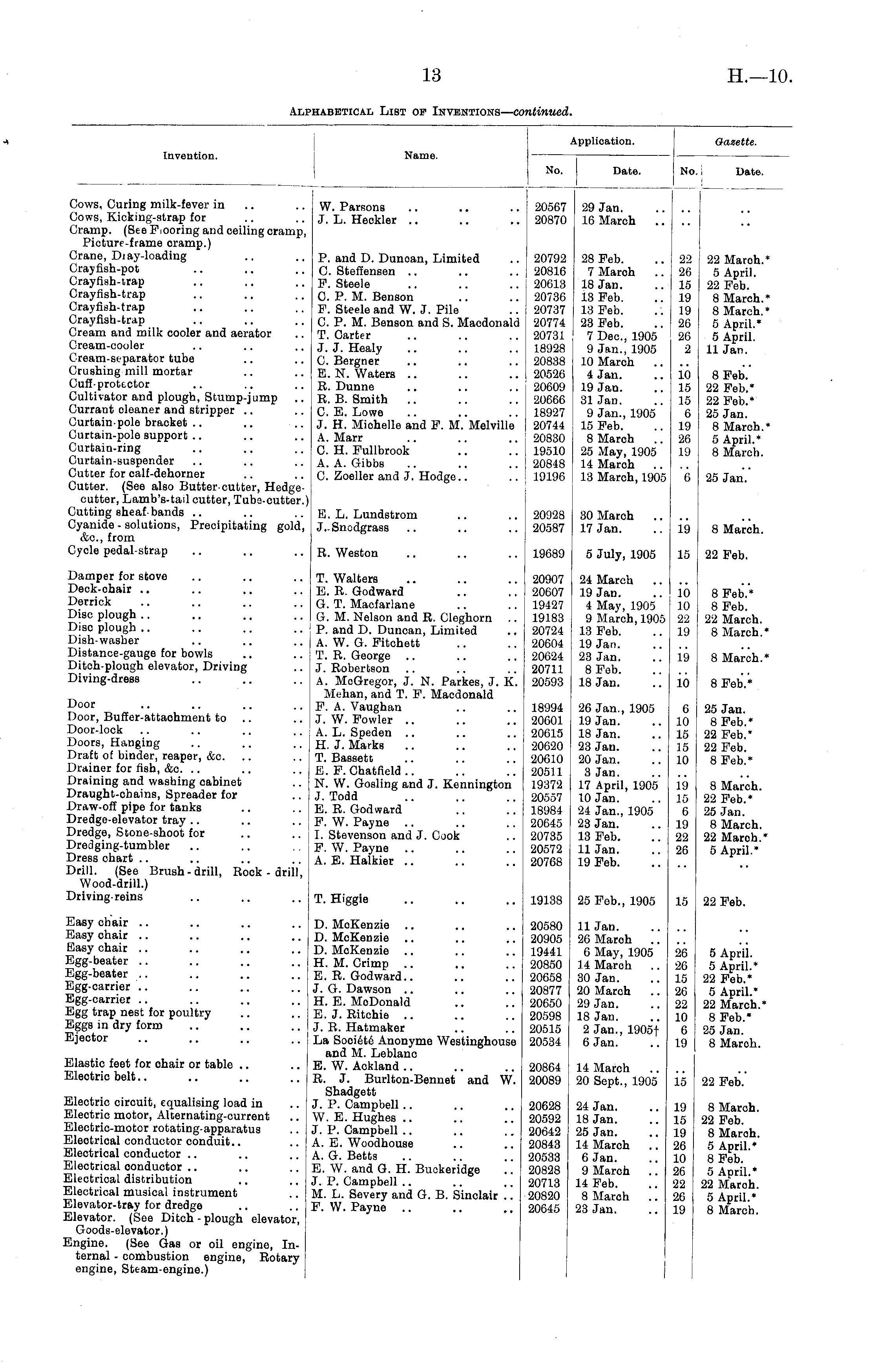 Invention. Name. A] No. Application. Gazette. Date. No. Date. I Cows, Curing milk-fever in Cows, Kicking-strap for Cramp. (See Flooring arid ceiling cramp, Picture-frame cramp.) Crane, Diay-loading Crayfish-pot Crayfiah-trap Crayfish-trap Crayfish-trap Crayfish-trap Cream and milk cooler and aerator Cream-cooler Cream-separator tube Crushing mill mortar Cuff-protector Cultivator and plough, Stump-jump Currant cleaner and stripper Curtain-pole bracket Curtain-pole support Curtain-ring Curtain-suspender Cutter for calf-dehorner Cutter. (See also Butter-cutter, Hedgecatter, Lamb's-tail cutter, Tubo-cutter.) Cutting sheaf-bands .. Cyanide - solutions, Precipitating gold, &c, from Cycle pedal-strap W. Parsons J. L. Heckler .. P. and D. Dunoan, Limited C. Steffensen .. P. Steele 0. P. M. Benson F. Steele and W. J. Pile 0. P. M. Benson and S. Macdonald T. Carter J. J. Healy G. Bergner E. N. Waters .. R. Dunne R. B. 8mith C. E. Lowe J. H. Michelle and F. M. Melville A. Marr C. H. Fullbrook A. A. Gibbs C. Zoeller and J. Hodge.. 20567 20870 20792 20816 20613 20736 20737 20774 20731 18928 20838 20526 20609 20666 18927 20744 20830 19510 20848 19196 29 Jan. 16 March .. 28 Feb. 7 March 18 Jan. 13 Feb. 13 Feb. 23 Feb. 7 Deo., 1905 9 Jan., 1905 10 March 4 Jan. 19 Jan. 31 Jan. 9 Jan., 1905 15 Feb. 8 March 25 May, 1905 14 March 13 March, 1905 22 26 15 V.) 1>J 26 26 2 10 15 15 6 19 26 1' J 22 Maroh.* 5 April. 22 Feb. 8 March.* 8 March.* 5 April.* 5 April. 11 Jan. 8 Feb. 22 Feb.* 22 Feb.* 25 Jan. 8 March.* 5 April.* 8 March. '('; 25 Jan. E. L. Lundstrom J. Snodgrass 20928 20587 30 March 17 Jan. 19 8 March. R. Weston 19689 5 July, 1905 15 22 Feb. Damper for stove Deck-chair Derrick Disc plough Disc plough .. .. .. .. ! Dish-wasner .. .. Distance-gauge for bowls .. Ditch-plough elevator, Driving Diving-dress T. Walters E. R. Godward G. T. Maofarlane G. M. Nelson and R. Cleghorn ' P. and D. Dunoan, Limited i A. W. G. Fitchett T. R. George .. J. Robertson A. MoGregor, J. N. Parkes, J. K. Mehan, and T. F. Macdonald F. A. Vaughan J. W. Fowler .. A. L. Speden .. H. J. Marks .. T. Bassett E. F. Chatfield.. N. W. Gosling and J. Kennington J. Todd E. R. Godward F. W. Payne I. Stevenson and J. Cook F. W. Payne A. E. Halkier 20907 20607 19427 19183 20724 20604 20024 20711 20593 24 March 19 Jan. 4 May, 1905 9 March, 1905 13 Feb. 19 Jan. 23 Jan. 8 Feb. 18 Jan. 10 10 22 19 8 Feb.* 8 Feb. 22 March. 8 March.* 19 8 March.* io 8 Fob'.'* Door Door, Buffer-attachment to Door-lock Doors, Hanging .. .. Draft of binder, reaper, &c. .. .. I Drainer for fish, &c. .. .. Draining and washing cabinet .. j Draught-chains, Spreader for .. j Draw-off pipe for tanks .. Dredge-elevator tray .. .. .. ' Dredge, Stone-shoot for .. .. j Dredging-tumbler Dress chart Drill. (See Brush-drill, Rock-drill, Wood-drill.) Driving reins 18994 20601 20615 20620 20610 20511 19372 20557 18984 20645 20735 20572 20768 26 Jan., 1905 19 Jan. 18 Jan. 23 Jan. 20 Jan. 3 Jan. 17 April, 1905 10 Jan. 24 Jan., 1905 23 Jan. 13 Feb. 11 Jan. 19 Feb. 6 10 15 16 10 1!) 15 6 19 '2-2 26 25 Jan. 8 Feb.* 22 Feb.' 22 Feb. 8 Feb.* 8 March. 22 Feb.* 25 Jan. 8 March. 22 March.* 5 April.* T. Higgle 19138 25 Feb., 1905 22 Feb. 15 Easy chair Easy chair Easy chair Egg-beater Egg-beater .. .. .. .. | Egg-carrier .. .. .. Egg-carrier .. .. .. .. | Egg trap nest for poultry .. Eggs in dry form .. .. .. Ejector D. MoKenzie D. McKenzie .. D. MoKenzie H. M. Crimp E. R. Godward.. J. G. Dawson H. E. MoDonald E. J. Ritchie .. J. R. Hatmaker La Sooiete Anonyme Westinghouse and M. Leblano E. W. Ackland .. R. J. Burlton-Bennet and W. Shadgett J. P. Campbell .. W. E. Hughes .. J. P. Campbell A. E. Woodhouse A. G. Betts E. W. and G. H. Buekeridge J. P. Campbell M. L. Severy and G. B. Sinclair .. F. W. Payne .. 20580 20905 19441 20850 20C58 20877 20650 20598 20515 20534 11 Jan. 26 Maroh 6 May, 1905 14 March .. 30 Jan. 20 March .. 29 Jan. 18 Jan. 2 Jan., 1905f 6 Jan. 26 26 15 26 2-2 10 6 19 5 April. 5 April.* 22 Feb.* 5 April.* 22 March.* 8 Feb.* 25 Jan. 8 March. Elastic feet for ohair or table Eleotric belt 20864 20089 14 March 20 Sept., 1905 22 Feb.' 15 Electric circuit, equalising load in Electric motor, Alternating-current Electric-motor rotating-apparatus Electrical conductor conduit.. Electrical conductor Electrical oonductor .. Electrical distribution Electrical musical instrument Elevator-tray for dredge Elevator. (See Ditch-plough elevator, Goods-elevator.) Engine. (See Gas or oil engine, Internal - combustion engine, Rotary engine, Steam-engine.) 20628 20592 20642 20843 20533 20828 20713 20820 20645 24 Jan. 18 Jan. 25 Jan. 14 March .. 6 Jan. 9 March .. 14 Feb. 8 March .. 23 Jan. 19 IS 19 ■26 10 26 26 19 8 Maroh. 22 Feb. 8 March. 5 April.* 8 Feb. 5 April.* 22 Maroh. 5 April.* 8 March.