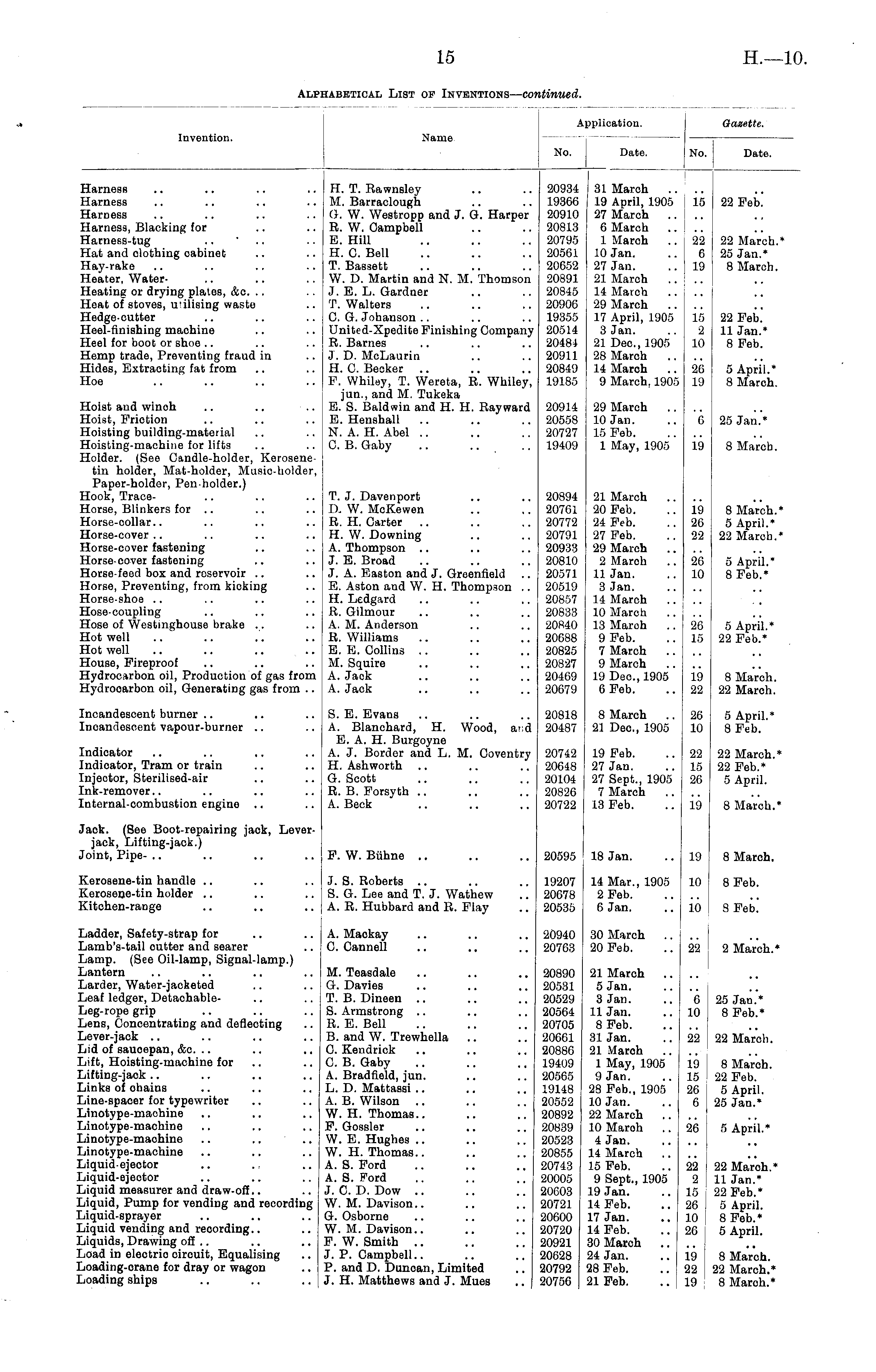 Application. Gazette. Invention. Name No. Date. No. Date. Harness Harness Harness Harness, Blacking for Harness-tug .. - .. Hat and clothing cabinet Hay-rake Heater, WaterHeating or drying plates, &c. Heat of stoves, utilising waste Hedge-cutter Heel-finishing machine Heel for boot or shoe Hemp trade, Preventing fraud in Hides, Extracting fat from Hoe II. T. Rawnsley M. Barraclough (). W. Westropp and J. G. Harper R. W. Campbell E. Hill H. C. Bell T. Bassett W. D. Martin and N. M. Thomson J. E. L. Gardner T. Walters C. G. Johanson United-Xpedite Finishing Company R. Barnes i J. D. McLaurin j H. C. Beaker .. F. Whiley, T. Wereta, R. Whiley, jun., and M. Tukeka E. S. Baldwin and H. H. Rayward E. Henshall N. A. H. Abel .. C. B. Gaby ■ 20934 19366 20910 20813 20795 20561 20652 20891 20845 20906 19355 20514 20484 20911 20849 19185 31 Maroh 19 April, 1905 27 March .. 6 March 1 March 10 Jan. 27 Jan. 21 March .. 14 March 29 Maroh 17 April, 1905 3 Jan. 21 Dec, 1905 28 March 14 March 9 March, 1905 15 22 6 19 22 Feb.' 22 March.* 25 Jan.* 8 March. 15 2 10 22 Feb. 11 Jan.* 8 Feb. 26 19 5 April.* 8 March. Hoist and winoh Hoist, Friction Hoisting building-material Hoisting-machine for lifts Holder. (See Candle-holder, Kerosenetin holder, Mat-holder, Music-holder, Paper-holder, Penholder.) Hook, TraceHorse, Blinkers for Horse-collar.. Horse-cover Horse-cover fastening Horse-cover fastening Horse-feed box and reservoir Horse, Preventing, from kicking Horse-shoe Hose-coupling Hose of Westmghouse brake Hot well Hot well House, Fireproof Hydrocarbon oil, Production of gas from Hydrooarbon oil, Generating gas from .. T. J. Davenport D. W. McKewen j R. H. Carter .. H. W. Downing A. Thompson J. E. Broad J. A. Easton and J. Greenfield E. Aston and W. H. Thompson .. H. Ledgard it. Gilmour A. M. Anderson R. Williams E. E. Collins .. M. Squire A. Jack A. Jack 20914 20558 20727 19409 20894 20761 20772 20791 20933 20810 20571 20519 20857 20833 20840 20G88 20825 20827 20469 20679 29 March 10 Jan. 15 Feb. 1 May, 1905 21 March 20 Feb. 24 Feb. 27 Feb. 29 March 2 Maroh 11 Jan. 3 Jan. 14 March 10 March 13 Maroh 9 Feb. 7 March 9 March 19 Dec, 1905 6 Feb. 19 26 ■22 20 10 b 19 25 Jan.* 8 March. 8 March.* 5 April.* 22 March.* 5 April.* 8 Feb.* 2G 16 5 April.* 22 Feb.* 19 ■22 8 March. 22 March. Incandescent burner Inoandescent vapour-burner S. E. Evans A. Blanchard, H. Wood, a>;d E. A. H. Burgoyne A. J. Border and L. M. Coventry H. Ashworth .. G. Scott R. B. Forsyth A. Beck 20818 20487 8 March 21 Dec, 1905 26 10 5 April.* 8 Feb. Indicator Indicator, Tram or train Injector, Sterilised-air Ink-remover.. Internal-combustion engine 20742 20648 20104 20826 20722 19 Feb. 27 Jan. 27 Sept., 1905 7 March 13 Feb. 2-1 15 •2C> 22 March.* 22 Feb.* 5 April. 19 8 March.* Jack. (See Boot-repairing jack, Leverjack, Lifting-jack.) Joint, Pipe- .. P. W. Biihne 20595 18 Jan. 8 March. 19 Keroaene-tin handle Kerosene-tin holder Kitchen-range J. S. Roberts S. G. Lee and T. J. Wathew A. R. Hubbard and R. Flay 19207 20678 20535 14 Mar., 1905 2 Feb. 6 Jan. 10 10 8 Feb. 8 Feb. Ladder, Safety-strap for Lamb's-tail cutter and searer Lamp. (See Oil-lamp, Signal-lamp.) Lantern Larder, Water-jacketed Leaf ledger, Detachable-Leg-rope grip Lens, Concentrating and deflecting Lever-jack Lid of saucepan, &c. Lift, Hoisting-machine for Lifting-jack Links of chains Line-spacer for typewriter Linotype-machine Linotype-machine Linotype-machine .. .. Linotype-machine Liquid-ejector Liquid-ejector Liquid measurer and draw-off.. Liquid, Pump for vending and recording Liquid-sprayer Liquid vending and reoording.. Liquids, Drawing off .. Load in eleetrio circuit, Equalising Loading-orane for dray or wagon Loading ships .. .. .. | A. Maokay C. Cannell M. Teasdale G. Davies T. B. Dineen .. S. Armstrong .. R. E. Bell B. and W. Trewhella 0. Kendrick C. B. Gaby A. Bradfield, jun. L. D. Mattassi A. B. Wilson W. H. Thomas F. Gossler W. E. Hughes W. H.Thomas A. S. Ford A. S. Ford J. C. D. Dow .. W. M. Davison.. G. Osborne W. M. Davison.. F. W. Smith .. J. P. Campbell.. P. and D. Dunoan, Limited J. H. Matthews and J. Mues 20940 20763 20890 20531 20529 20564 20705 20661 20886 19409 20565 19148 20552 20892 20839 20523 20855 20743 20005 20603 20721 20600 20720 20921 20628 20792 20756 30 March .. 20 Feb. 21 March .. 5 Jan. 3 Jan. 11 Jan. 8 Feb. 31 Jan. 21 Maroh 1 May, 1905 9 Jan. 23 Feb., 1905 10 Jan. 22 March .. 10 Maroh 4 Jan. 14 March 15 Feb. 9 Sept., 1905 19 Jan. 14 Feb. 17 Jan. 14 Feb. 30 March 24 Jan. 28 Feb. 21 Feb. 22 6 10 22 19 15 26 6 2 March.* 25 Jan.* 8 Feb.* 22 March. 8 March. 22 Feb. 5 April. 25 Jan.* 26 5 April.* 22 2 15 26 10 26 22 March.* 11 Jan.* 22 Feb.* 5 April. 8 Feb.* 5 April. 19 22 19 8 March. 22 March.* 8 Maroh.*