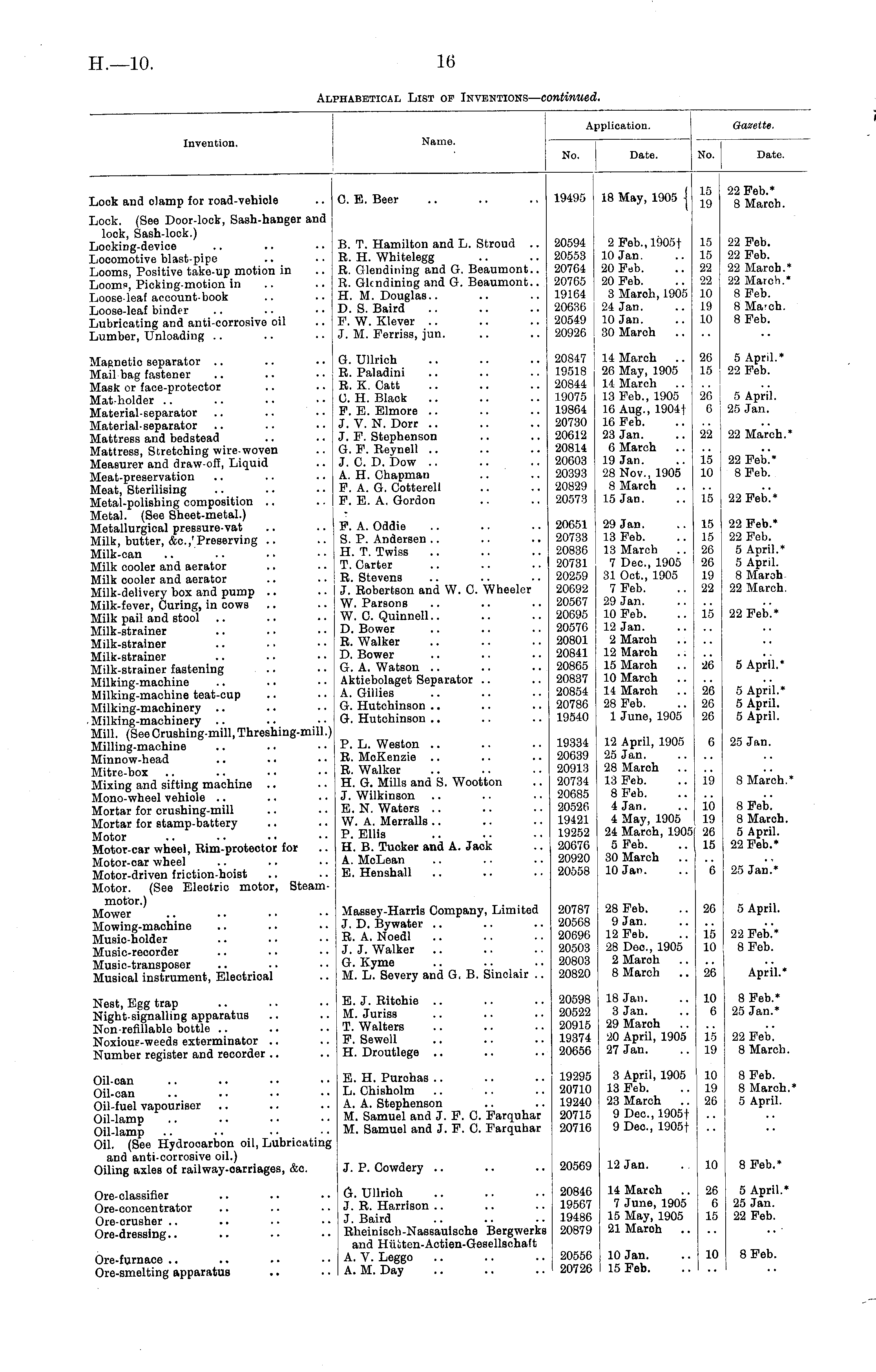 pp] lien, tion. U.v:e >e. Invention. Name. No. No. Date. Date. Look and clamp for road-vehiole 0. E. Beer 19495 18 May, 1905 j 15 1!) 22 Feb.* 8 March. Lock. (See Door-lock, Sash-hanger and lock, Sash-lock.) Locking-device Locomotive blast-pipe Looms, Positive take-up motion in Loom?, Picking-motion in Loose-leaf account-book Loose-leaf binder Lubricating and anti-corrosive oil Lumber, Unloading B. T. Hamilton and L. Stroud .. B. H. Whitelegg R. Glendining and G. Beaumont.. R. Glendining and G. Beaumont.. H. M. Douglas.. D. S. Baird F. W. Klever .. J. M. Ferriss, jun. 20594 20553 20764 20765 19164 20636 20549 20926 2 Feb., 1905f 10 Jan. 20 Feb. 20 Feb. 3 Maroh, 1905 24 Jan. 10 Jan. 30 March 15 15 22 10 lit 10 22 Feb. 22 Feb. 22 March.* 22 March.' 8 Feb. 8 Ma-ch. 8 Feb. Magnetic separator Mail bag fastener Mask or face-protector Mat-holder Material-separator Material-separator Mattress and bedstead Mattress, Stretching wire-woven Measurer and draw-off, Liquid Meat-preservation Meat, Sterilising Metal-polisbing composition Metal. (See Sheet-metal.) Metallurgical pressure-vat Milk, butter, &c.,' Preserving .. Milk-can Milk cooler and aerator Milk cooler and aerator Milk-delivery box and pump Milk-fever, Curing, in cows Milk pail and stool Milk-strainer Milk-strainer Milk-strainer Milk-strainer fastening Milking-machine Milking-machine teat-cup Milking-machinery Milking-machinery Mill. (See Crushing-mill, Threshing-mill.) Milling-machine Minnow-head Mifcre-box Mixing and sifting machine Mono-wheel vehiole Mortar for crushing-mill Mortar for stamp-battery Motor Motor-car wheel, Rim-protector for Motor-car wheel Motor-driven friction-hoist Motor. (See Electric motor, Steammotor.) Mower Mowing-machine Music-holder Music-recorder Music-transposer .. Musical instrument, Electrioal G. Ullrich R. Paladini R. K. Gatt 0. H. Black F. E. Elmore .. J. V. N. Dorr .. J. F. Stephenson G. F. Reynell J. C. D. Dow .. A. H. Chapman F. A. G. Cotterell F. E. A. Gordon 20847 19518 20844 19075 19864 20730 20612 20814 20603 20393 20829 20573 14 March 26 May, 1905 14 March 13 Feb., 1905 16 Aug., 19041 1C Feb. 23 Jan. 6 March 19 Jan. 28 Nov., 1905 8 March 15 Jan. 26 15 5 April.* 22 Feb. 26 6 5 April. 25 Jan. 22 22 March.' 15 10 22 Feb.* 8 Feb. 15 22 Feb.* F. A. Oddie S. P. Andersen .. H. T. Twiss T. Carter R. Stevens J. Robertson and W. C. Wheeler W. Parsons W. C. Quinnell.. D. Bower R. Walker D. Bower G. A. Watson Aktiebolaget Separator A. Gillies G. Hutchinson G. Hutchinson 20651 20733 20836 20731 20259 20692 20567 20695 20576 20801 20841 20805 20837 20854 20786 19540 29 Jan. 13 Feb. 13 March 7 Dec, 1905 31 Oct., 1905 7 Feb. 29 Jan. 10 Feb. 12 Jan. 2 March 12 Maroh 15 Maroh 10 March 14 March 28 Feb. 1 June, 1905 15 15 26 20 19 2-2 22 Feb.* 22 Feb. 5 April.* 5 April. 8 March 22 March. 15 22 Feb.* 26 5 April.* 26 26 26 5 April.' 5 April. 5 April. P. L. Weston .. R. McKenzie .. R. Walker H. G. Mills and S. Wootton J. Wilkinson E. N. Waters W. A. Merralls P. Ellis H. B. Tucker and A. Jack A. McLean E. Henshall 19334 20639 20913 20734 20685 20526 19421 19252 20676 20920 20558 12 April, 1905 25 Jan. 28 Maroh .. 13 Feb. 8 Feb. 4 Jan. 4 May, 1905 24 March, 1905 5 Feb. 30 March 10 Jan. 6 25 Jftn. 19 8 March.* 10 19 26 15 8 Feb. 8 March. 5 April. 22 Feb.* 6 25 Jan.* Massey-Harris Company, Limited J. D. Bywater .. R. A. Noedl J. J. Walker .. G. Kyme M. L. Severy and G, B. Sinclair .. 20787 20568 20696 20503 20803 20820 28 Feb. 9 Jan. 12 Feb. 28 Doc, 1905 2 Maroh 8 Maroh 5 April. 2G 16 10 22 Feb.'* 8 Feb. 26 April.* Nest, Egg trap Night-signalling apparatus Non-refillable bottle .. Noxioue-weeds exterminator Number register and recorder E. J. Ritchie .. M. Juriss T. Walters F. Sewell H. Droutlege .. 20598 20522 20915 19374 20656 18 Jan. 3 Jan. 29 Maroh 20 April, 1905 27 Jan. 10 6 is 19 8 Feb.* 25 Jan.* 22 Feb. 8 March. Oilcan Oil-can Oil-fuel vapouriser Oil-lamp Oil-lamp Oil. (See Hydrocarbon oil, Lubricating and anti-corrosive oil.) Oiling axles of railway-oarriages, &c. E. H. Purohas .. L. Chisholm A. A. Stephenson M. Samuel and J. F. C. Farquhar M. Samuel and J. F. C. Farquhar 19295 20710 19240 20715 2071G 3 April, 1905 13 Feb. 23 March 9 Dec, 1905f 9 Dec, 1905f 10 19 20 8 Feb. 8 March.* 5 April. .. J. P. Cowdery 20569 12 Jan. 10 8 Feb.* Ore-classifier Ore-concentrator Ore-orusher Ore-dressing.. G. Ullrich J. R. Harrison J. Baird Rheinisch-Nassauische Bergwerks and Hiiiten-Actien-Gesellschaft A. V. Leggo A. M. Day 20846 19567 19486 20879 14 March 7 June, 1905 15 May, 1905 21 Maroh .. 6 15 5 April.* 25 Jan. 22 Feb. Ore-furnace Ore-smelting apparatus 20556 20726 10 Jan. 15 Feb. 10 8 Feb.