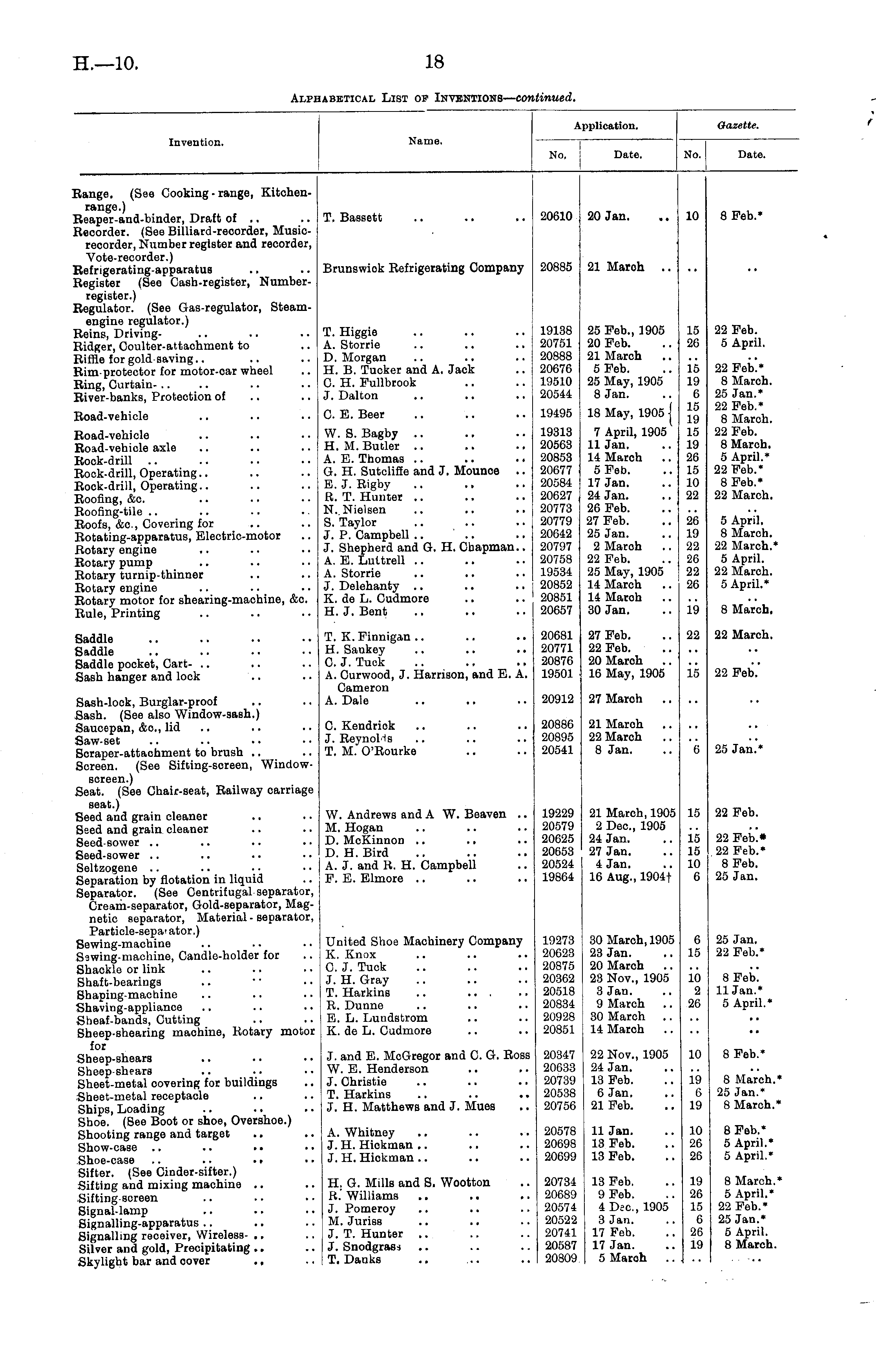Application. Gazette. Invention. Name. No. Date. No. Date. Range. (See Cooking - range, Kitchenrange.) Reaper-and-binder, Draft of .. Recorder. (See Billiard-recorder, Musicrecorder, Number register and recorder, Vote-recorder.) Befrigerating-apparatus Register (See Cash-register, Numberregister.) Regulator. (See Gas-regulator, Steamengine regulator.) Reins, DrivingRidger, Coulter-attachment to Riffle for gold-saving Rim protector for motor-car wheel Ring, Curtain-River-banks, Protection of T. Bassett Brunswiok Refrigerating Company 20610 20885 20 Jan. 21 March .. 10 8 Feb.' Road-vehicle Road-vehicle Road-vehicle axle Rock-drill Rock-drill, Operating.. Rock-drill, Operating.. Roofing, &c. Roofing-tile Roofs, &c, Covering for Rotating-apparatus, Electric-motor Rotary engine Rotary pump Rotary turnip-thinner Rotary engine Rotary motor for shearing-machine, &c. Rule, Printing T. Higgie A. Storrie D. Morgan H. B. Tucker and A. Jack 0. H. Fullbrook J. Dalton C. E. Beer W. S. Bagby H. M.Butler .. A. E. Thomas .. G. H. Sutcliffe and J. Mounce B. 3. Bigby R. T. Hunter .. N. Nielsen S. Taylor J. P. Campbell .. .. J. Shepherd and G. H. Chapman.. A. E. Luttrell .. A. Storrie J. Delehanty .. K. de L. Cudmore H. J. Bent 19138 20751 20888 20676 19510 20544 19495 19313 20563 20853 20677 20584 20627 20773 20779 20642 20797 20758 19534 20852 20851 20657 25 Feb., 1905 20 Feb. 21 March 5 Feb. 25 May, 1905 8 Jan. 18 May, 1905 j 7 April, 1905 11 Jan. 14 March 5 Feb. 17 Jan. 24 Jan. 26 Feb. 27 Feb. 25 Jan. 2 Maroh 22 Feb. 25 May, 1905 14 March 14 Maroh 30 Jan. 15 2(3 15 19 6 15 19 15 19 26 15 10 22 22 Feb. 5 April. 22 Feb.* 8 March. 25 Jan.* 22 Feb.* 8 March. 22 Feb. 8 Maroh. 5 April.* 22 Feb.* 8 Feb.* 22 March. 26 19 2-2 20 22 20 5 April. 8 March. 22 March.* 5 April. 22 March. 5 April.* 19 8 March. Saddle Saddle Saddle pocket, CartSash hanger and lock T. K.Pinnigan .. H. Sankey C.J. Tuck A. Curwood, J. Harrison, and E. A. Cameron A. Dale 20681 20771 20876 19501 27 Feb. 22 Feb. 20 Maroh 16 May, 1905 22 22 March. 15 22 Feb." Sash-look, Burglar-proof Sash. (See also Window-sash.) Saucepan, &c, lid Saw-set Scraper-attaohment to brush Screen. (See Sifting-screen, Windowscreen.) Seat. (See Chair-seat, Railway carriage seat.) Seed and grain cleaner Seed and grain cleaner Seed-sower Seed-sower Seltzogene Separation by flotation in liquid Separator. (See Centrifugal separator, Cream-separator, Gold-separator, Magnetic separator, Material - separator, Particle-sepa> ator.) Sewing-machine S9wing-machine, Candle-holder for Shackle or link Shaft-beariags Shaping-machine Shaving-appliance Sheaf-bands, Cutting Sheep-shearing machine, Rotary motor for Sheep-shears Sheep-shears Sheet-metal oovering for buildings Sheet-metal receptacle Ships, Loading Shoe. (See Boot or shoe, Overshoe.) Shooting range and target Show-case Shoe-case .. .. .. Sifter. (See Cinder-sifter.) Sifting and mixing machine Sifting-screen Signal-lamp Signalling-apparatus Signalling receiver, Wireless- .. Silver and gold, Precipitating Skylight bar and oover ., 20912 27 March .. C. Kendriok J. Reynolds T. M. O'Rourke 20886 20895 20541 21 March 22 March 8 Jan. 6 25 Jan.'* W. Andrews and A W. Beaven .. M. Hogan D. McKinnon D. H. Bird A. J. and R. H. Campbell P. E. Elmore .. 19229 20579 20625 20653 20524 19864 21 March, 1905 2 Dec, 1905 24 Jan. 27 Jan. 4 Jan. 16 Aug., 1904f 15 15 15 10 6 22 Feb. 22 Feb.» 22 Feb.* 8 Feb. 25 Jan. United Shoe Machinery Company K. Knox C. J. Tuck J. H. Gray T. Harkins .. .. , R. Dunne E. L. Lundstrom K. de L. Cudmore 19273 20623 20875 20362 20518 20834 20928 20851 30 March, 1905 23 Jan. 20 March 23 Nov., 1905 3 Jan. 9 March 30 March .. 14 March .. 6 15 10 2 26 25 Jan. 22 Feb.* 8Feb! 11 Jan.* 5 April.* J. and E. McGregor and C. G. Ross W. E. Henderson J. Christie T. Harkins J. H. Matthews and J. Mues 20347 20633 20739 20538 20756 22 Nov., 1905 24 Jan. 13 Feb. 6 Jan. 21 Feb. 10 19 6 19 8 Feb.* 8 March.* 25 Jan.* 8 March.* A. Whitney J. H. Hickman .. J. H. Hickman 20578 20698 20699 11 Jan. 13 Feb. 13 Feb. 10 26 20 8 Feb.* 5 April.* 5 April.* H. G. Mills and S. Wootton R.' Williams J. Pomeroy M. Juries J. T. Hunter .. i J. Snodgrass T. Danks 20734 20689 20574 20522 20741 20587 20809 13 Feb. 9 Feb. 4 Dec, 1905 3 Jan. 17 Feb. 17 Jan. 5 Maroh 19 20 15 6 2G 19 8 March.* 5 April.* 22 Feb.* 25 Jan.* 5 April. 8 March.