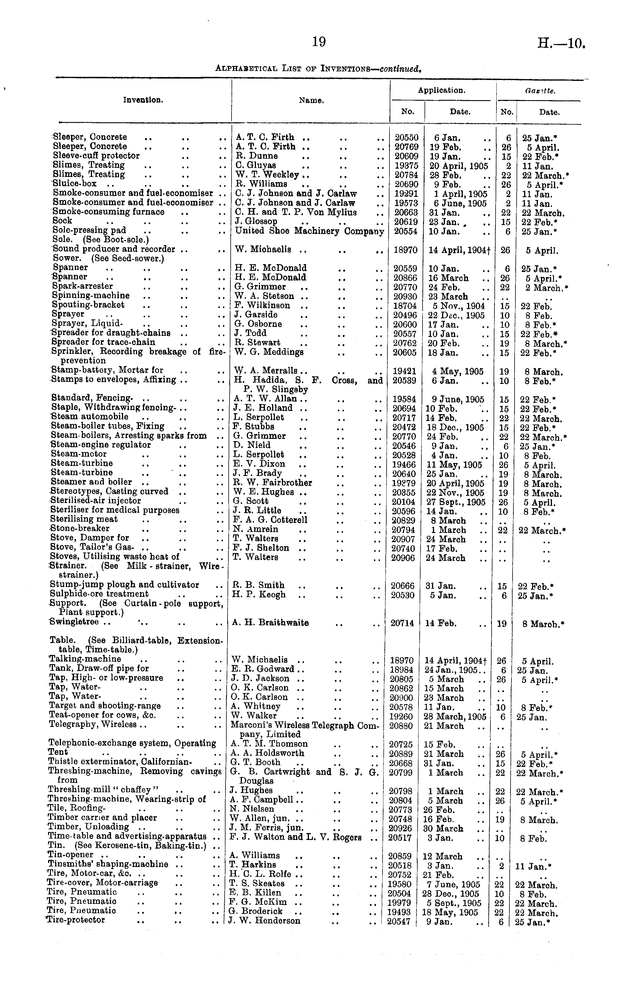 ippl jion. <az' '(. Invention. Name. No. Date. No. Date. Sleeper, Concrete Sleeper, Conorete Sleeve-cuff protector Slimes, Treating Slimes, Treating Sluice-box Smoke-consumer and fuel-economiser .. Smoke-consumer and fuel-economiser .. Smoke-consuming furnace Sock Sole-pressing pad Sole. (See Boot-sole.) Sound producer and recorder Sower. (See Seed-sower.) Spanner .. .. .. ,. Spanner Spark-arrester .. .. ., Spinning-machine Spouting-braeket Sprayer Sprayer, LiquidSpreader for draught-chains .. Spreader for trace-chain Sprinkler, Recording breakage of fire prevention Stamp-battery, Mortar for Stamps to envelopes, Affixing A. T. C. Firth A. T. C. Pirth .. R. Dunne C. Gluyas W. T. Weekley .. R. Williams .. C. J. Johnson and J. Oarlaw 0. J. Johnson and J. Carlaw C. H. and T. P. Von Mylius J. Glossop United Shoe Machinery Company 20550 20769 20609 19375 20784 20690 19291 19573 20663 20619 20554 6 Jan. 19 Feb. 19 Jan. 20 April, 1905 28 Peb. 9 Feb. 1 April, 1905 6 June, 1905 31 Jan. 23 Jan., 10 Jan. 6 26 15 2 22 26 2 2 22 15 6 25 Jan. , 5 April. 22 Feb. , 11 Jan. 22 Maroh.* 5 April. , 11 Jan. 11 Jan. 22 March. 22 Feb.* 25 Jan.' W. Miohaelis .. 18970 14 April, 1904f 26 5 April. H. E. McDonald H. E. McDonald G. Grimmer W. A. Stetson .. F. Wilkinson .. J. Garside G. Osborne J. Todd R. Stewart W. G. Meddings 20559 20866 20770 20930 18704 20496 20600 20557 20762 20605 10 Jan. 16 March 24 Peb. 23 Maroh 5 Nov., 1904 22 Dec, 1905 17 Jan. 10 Jan. 20 Feb. 18 Jan. 6 26 22 15 10 10 15 19 15 25 Jan.* 5 April.* 2 March. , 22 Feb. 8 Feb. 8 Feb.* 22 Feb.* 8 March.* 22 Feb.' Standard, FencingStaple, Withdrawing fencingSteam automobile Steam-boiler tubes, Fixing Steam-boilers, Arresting sparks from .. Steam-engine regulator Steam-motor Steam-turbine ., Steam-turbine .. ' .. Steamer and boiler Stereotypes, Casting curved Sterilised-air injector .. .. Steriliser for medical purposes Sterilising meat .. ., Stone-breaker Stove, Damper for Stove, Tailor's GasStoves, Utilising waste heat of Strainer. (See Milk - strainer, Wire - strainer.) Stump-jump plough and cultivator Sulphide-ore treatment Support. (See Curtain-pole support, Plant support.) Swingletree W. A. Merralls H. Hadida, S. P. Cross, and P. W. Slingsby A. T. W. Allan .. J. E. Holland .. L. Serpollet P. Stubbs G. Grimmer D. Nield L. Serpollet E. V. Dixon .. J. P. Brady R. W. Fairbrother W. E.Hughes .. G. Scott J. R. Little F. A. G. Cotterell N. Amrein T. Walters P. J. Shelton .. T. Walters 19421 20539 19584 20694 20717 20472 20770 20546 20528 19466 20640 19279 20355 20104 20596 20829 20794 20907 20740 20906 4 May, 1905 6 Jan. 9 June, 1905 10 Feb. 14 Peb. 18 Dec, 1905 24 Feb. 9 Jan. 4 Jan. 11 May, 1905 25 Jan. 20 April, 1905 22 Nov., 1905 27 Sept., 1905 14 Jan. 8 Maroh .. 1 Maroh .. 24 Maroh .. 17 Feb. 24 Maroh 19 10 15 15 22 15 22 6 10 26 19 19 19 26 10 8 March. 8 Feb.* 22 Feb.* 22 Feb. , 22 Maroh. 22 Feb.* 22 March.* 25 Jan.* 8 Feb. 5 April. 8 March. 8 March. 8 March. 5 April. 8 Feb.* 22 22 March. , R. B. Smith H. P. Keogh 20666 20530 31 Jan. 5 Jan. 15 0 22 Feb. , 25 Jan.* A. H. Braithwaite 20714 14 Feb. 19 8 March.* Table. (See Billiard-table, Extensiontable, Time-table.) Talking-machine Tank, Draw-off pipe for Tap, High-or low-pressure Tap, WaterTap, WaterTarget and shooting-range Teat-opener for cows, &o. Telegraphy, Wireless W. Michaelis .. E. R. Godward .. J. D. Jackson 0. K. Carlson 0. K. Carlson A.Whitney W. Walker Marconi's Wireless Telegraph Company, Limited A. T. M. Thomson A. A. Holdsworth G. T. Booth G. B. Cartwright and S. J. G. Douglas J. Hughes A. F. Campbell.. Nielsen W. Allen, jun. J. M. Ferris, jun. F. J. Walton and L. V. Rogers .. 18970 18984 20805 20862 20900 20578 19260 20880 14 April, 1904f 24 Jan., 1905.. 5 March 15 March 23 March 11 Jan. 28 March, 1905 21 March .. 26 6 20 5 April. 25 Jan. 5 April. , io 6 8 Feb> 25 Jan. Telephonic-exchange system, Operating Tent .. .. .' Thistle exterminator, Californian-Threshing-machine, Removing cavings from Threshing-mill " chaffey " Threshing-machine, Wearing-strip of Tile, RoofingTimber carrier and placer Timber, Unloading .. Time-table and advertising-apparatus .. Tin. (See Kerosene-tin, Baking-tin.) .. Tin-opener Tinsmiths' shaping-machine Tire, Motor-car, &o. .. Tire-cover, Motor-carriage Tire, Pneumatic Tire, Pneumatic Tire, Pueumatio .. •. Tire-protector 20725 20889 20668 20799 20798 20804 20773 20748 20926 20517 15 Feb. 21 March 31 Jan. 1 March 1 March .. 5 Maroh 26 Feb. 16 Feb. 30 March .. 3 Jan. 2G 15 22 22 2G 19 io 5 April.* 22 Feb.* 22 March.* 22 March.* 5 April.* 8 March. 8 Peb'. A. Williams .. .. T. Harkins H.C. L. Rolfe .. T. S. Skeates .. E. B. Killen F. G. McKim .. j. Broderick .. .. J. W. Henderson 20859 20518 20752 19580 20504 19979 19493 20547 12 March .. 3 Jan. 21 Feb. 7 June, 1905 28 Dec, 1905 5 Sept., 1905 18 May, 1905 9 Jan. '2 22 10 22 22 6 11 Jan!* 22 March. 8 Feb. 22 March. 22 March. 25 Jan.*