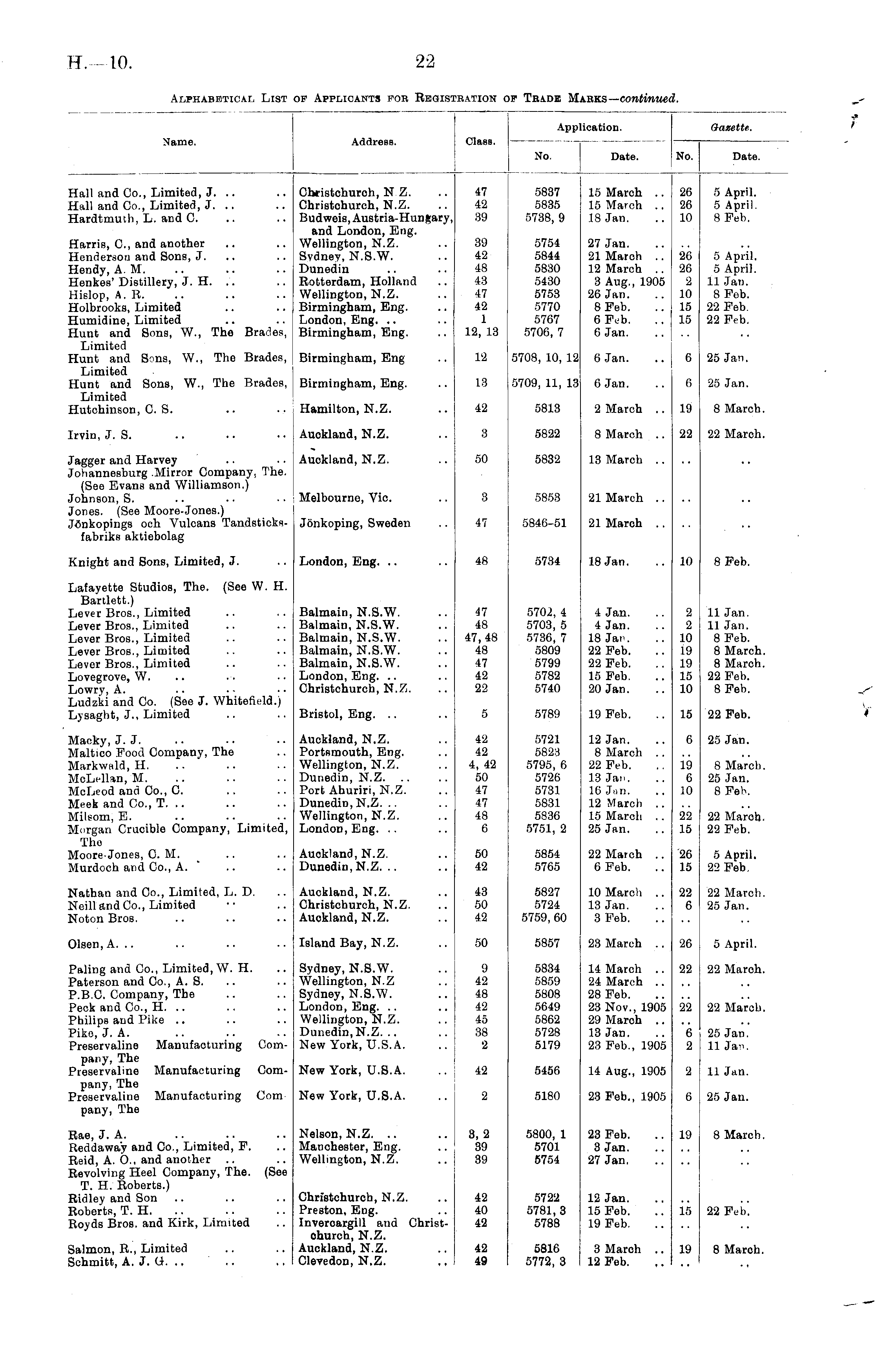 Name. Appl lication. Gazette. Address. Class. No. Date. No. Date. Hall and Co., Limited, J. .. Hall and Co., Limited, J. .. Hardtmuth, L. and C. Harris, C, and another Henderson and Sons, J. Hendy, A. M. Henkes' Distillery, J. H. .. Hislop, A. R. Holbrooks, Limited Humidine, Limited Hunt and Sons, W., The Bracles, Limited Hunt and Sons, W., The Brades, Limited Hunt and Sons, W., The Brades, Limited Hutchinson, C. S. Ohristchuroh, N Z. Christohuroh, N.Z. Budweis, Austria-Hungary, and London, Eng. Wellington, N.Z. Sydney, N.S.W. Dunedin Rotterdam, Holland Wellington, N.Z. Birmingham, Eng. London, Eng. Birmingham, Eng. 47 42 39 39 42 48 43 47 42 1 12, 13 5837 5835 5738,9 5754 5844 5830 5430 5753 5770 5767 5706, 7 15 Maroh .. 15 March .. 18 Jan. 27 Jan. 21 March .. 12 March .. 3 Aug., 1905 26 Jan. 8 Feb. 6 Feb. 6 Jan. 86 26 10 20 26 2 10 15 15 5 April. 5 April. 8 Feb. 5 April. 5 April. 11 Jan. 8 Feb. 22 Feb. 22 Feb. Birmingham, Eng 12 5708, 10, 12 6 Jan. 6 25 Jan. Birmingham, Eng. 13 5709, 11, 13 6 Jan. 6 25 Jan. Hamilton, N.Z. 42 5813 2 March .. 19 8 March. Irvin, J. S. Auokland, N.Z. 8 5822 8 March .. 22 22 March. Jagger and Harvey Johannesburg .Mirror Company, The. (See Evans and Williamson.) Johnson, S. Jones. (See Moore-Jones.) Jonkopings och Vulcans Tandstieknfabriks aktiebolag Auckland, N.Z. 50 5832 13 March .. Melbourne, Vic. 3 5853 21 March .. Jonkoping, Sweden 47 5846-51 21 March .. Knight and Sons, Limited, J. London, Eng. 48 5734 18 Jan. 10 8 Feb. Lafayette Studios, The. (See W. H. Bartlett.) Lever Bros., Limited Lever Bros., Limited Lever Bros., Limited Lever Bros., Limited Lever Bros., Limited Lovegrove, W. Lowry, A. Ludzki and Co. (See J. Whitefield.) Lysaght, J., Limited Balmain, N.S.W. Balmain, N.S.W. Balmain, N.S.W. Balmain, N.S.W. Balmain, N.S.W. London, Eng. .. Christchurch, N.Z. 47 48 47,48 48 47 42 22 5702, 4 5703, 5 5736, 7 5809 5799 5782 5740 4 Jan. 4 Jan. 18 Jar. 22 Feb. 22 Feb. 15 Feb. 20 Jan. 2 2 10 19 19 15 10 11 Jan. 11 Jan. 8 Feb. 8 March. 8 March. 22 Feb. 8 Feb. Bristol, Eng. 5 5789 19 Feb. 15 22 Feb. Macky, J. J. Maltico Food Company, The Markwttld, H. McLdlan, M. McLeod and Co., C. Meek and Co., T. .. Mileom, E. Morgan Crucible Company, Limited, Tho Auckland, N.Z. Portflmouth, Eng. Wellington, N.Z. Dunedin, N.Z Port Ahuriri, N.Z. Dunedin, N.Z. .. Wellington, N.Z. London, Eng. .. 42 42 4, 42 50 47 47 48 6 5721 5823 5795, 6 5726 5731 5831 5836 5751, 2 12 Jan. 8 March .. 22 Feb. 13 Jan. 16 Jan. 12 March .. 15 Marcli .. 25 Jan. 6 25 Jan. 19 6 10 8 March. 25 Jan. 8 Feb. 22 15 22 March. 22 Feb. Moore-Jones, CM. Murdoch and Co., A. Auokland, N.Z. Dunedin, N.Z. .. 50 42 5854 5765 22 March .. 6 Feb. 26 15 5 April. 22 Feb. Nathan and Co., Limited, L. D. Noill and Co., Limited Noton Bros. Auckland, N.Z. Christchurch, N.Z. Auokland, N.Z. 43 50 42 5827 5724 5759,60 10 Marcli .. 13 Jan. 3 Feb. 22 6 22 March. 25 Jan. Olsen, A. Island Bay, N.Z. 50 5857 23 March .. 20 5 April. Paling and Co., Limited, W. H. Paterson and Co., A. S. P.B.C. Company, The Peck and Co., H. .. Philips and Pike Pike, J. A. Preservaline Manufacturing Company, The Preservaline Manufacturing Company, The Preservaline Manufacturing Company, The Sydney, N.S.W. Wellington, N.Z Sydney, N.S.W. London, Eng. Wellington, N.Z. Dunedin,N.Z. .. New York, U.S.A. 9 42 48 42 45 38 2 5834 5859 5808 5649 5862 5728 5179 14 March .. 24 Maroh .. 28 Feb. 23 Nov., 1905 29 March .. 13 Jan. 23 Feb., 1905 22 22 March. 22 22 March. 6 2 25 Jan. 11 Jan. New York, U.S.A. 42 5456 14 Aug., 1905 2 11 Jan. New York, U.S.A. 2 5180 23 Feb., 1905 6 25 Jan. Bae, J. A. Eteddaway and Co., Limited, F. Reid, A. O., and another .. Revolving Heel Company, The. (See T. H. Roberts.) Ridley and Son Roberts, T. H. Royds Bros, and Kirk, Limited Nelson, N.Z. .. Manchester, Eng. Wellington, N.Z. 3, 2 39 39 5800, 1 5701 5754 23 Feb. 3 Jan. 27 Jan. 19 8 March. Christchurch, N.Z. Preston, Eng. Inveroargill and Christohurch, N.Z. Auckland, N.Z. Clevedon, N.Z. .. I 42 40 42 5722 5781, 3 5788 12 Jan. 15 Feb. 19 Feb. 15 22 Feb. Salmon, R., Limited Schmitt, A. J. Gr. ., 42 49 5816 5772, 3 3 March .. 12 Feb. 19 8 March.