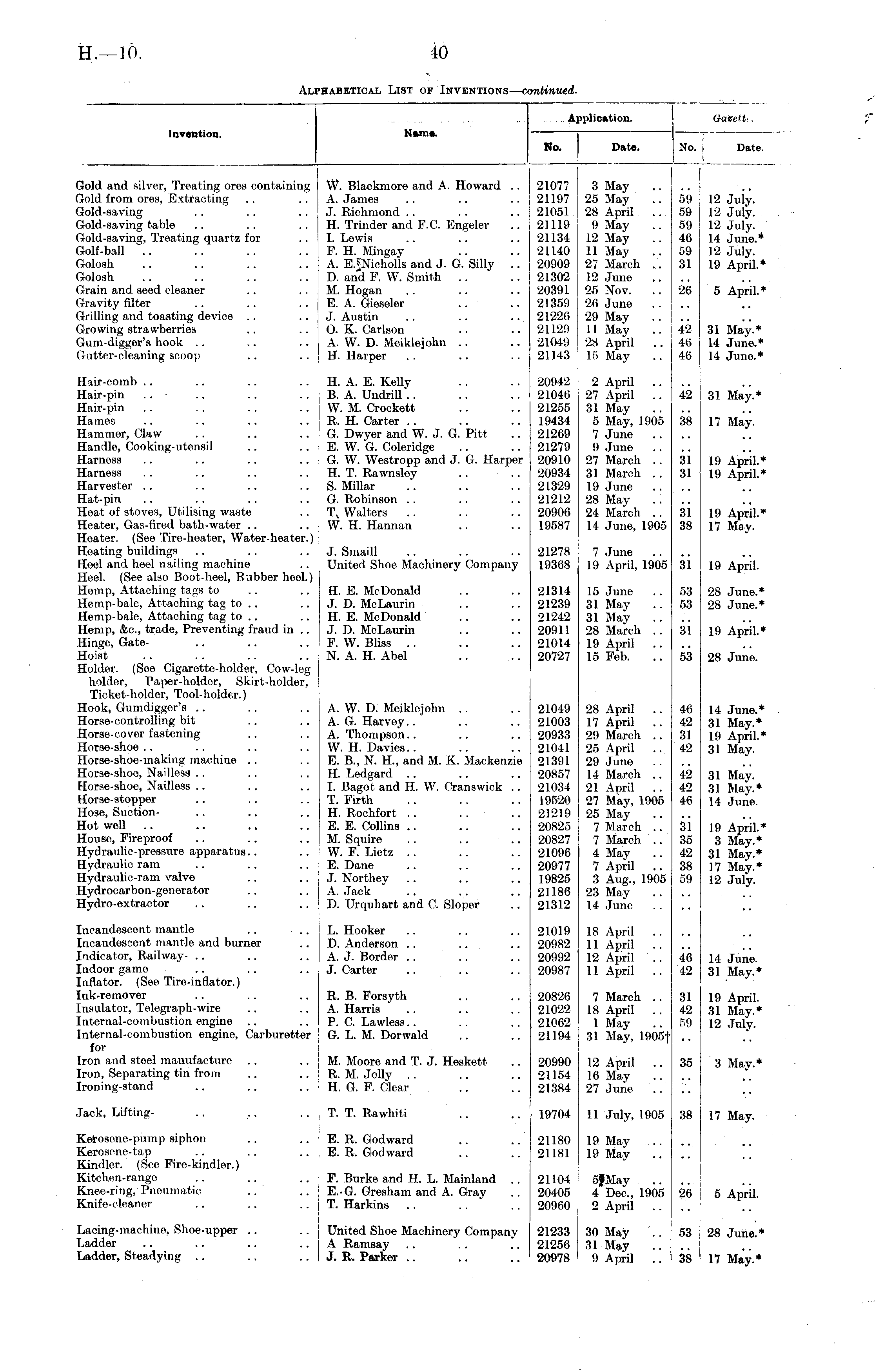 Application. Gazett-. Invention. Nun*. No. Date. I No. j I Date. Gold and silver, Treating ores containing Gold from ores, Extracting Gold-saving Gold-saving table Gold-saving, Treating quartz for Golf-ball Golosh Golosh Grain and seed cleaner Gravity filter Grilling and toasting device Growing strawberries Gum-digger's hook Gutter-cleaning scoop W. Blackmore and A. Howard .. A. James J. Richmond H. Trinder and F.C. Engeler I. Lewis F. H. Mingay A. B.jNioholle and J. G. Silly .. D. and F. W. Smith .. M. Hogan E. A. Gieseler J. Austin O. K. Carlson A. W. D. Meiklejohn .. H. Harper 21077 21197 21051 21119 21134 21140 20909 21302 20391 21350 21226 21129 21049 21143 3 May 25 May 28 April .. 9 May 12 May 11 May 27 March .. 12 June 26 Nov. 20 June 29 May 11 May 28 April .. lf> May 59 59 59 40 59 31 28 12 July. 12 July. 12 July. 14 June.* 12 July. 19 April.* 5 April.* 42 46 46 31 May.* 14 June.* 14 June.* Hair-comb Hair-pin .. • Hair-pin Hames Hammer, Claw Handle, Cooking-utensil Harness Harness Harvester Hat-pin Heat of stoves, Utilising waste Heater, Gas-fired bath-water Heater. (See Tire-heater, Water-heater.) Heating buildings Seel and heel nailing machine Heel. (See also Boot-heel, Rubber heel.) Hemp, Attaching tags to Hemp-bale, Attaching tag to .. Hemp-bale, Attaching tag to .. Hemp, &c, trade, Preventing fraud in .. Hinge, GateHoist Holder. (See Cigarette-holder, Cow-leg holder, Paper-holder, Skirt-holder, Ticket-holder, Tool-holder.) Hook, Gumdigger's Horse-controlling bit Horse-cover fastening Horae-shoe Horse-shoe-making machine Horse-shoe, Nailless Horse-shoo, Nailless Horse-stopper Hose, SuctionHot well House, Fireproof Hydraulic-prossure apparatus Hydraulic ram Hydraulic-ram valve Hydrocarbon-generator Hydro-extractor H. A. E. Kelly B. A. Undrill .. W. M. Crockett R. H. Carter .. G. Dwyer and W. J. G. Pitt E. W. G. Coleridge G. W. Westropp and J. G. Harper H. T. Rawnsloy .. .. S. Millar G. Robinson .. T. Walters .. W. H. Hannan 20942 21040 21255 19434 21269 21279 20910 20934 21329 21212 20906 19587 2 April 27 April .. 31 May 5 May, 1905 7 June 9 June 27 March .. 31 March .. 19 June 28 May 24 March .. 14 June, 1905 42 38 31 3] 31 May.* 17 May. 19 April.* 19 April.* 31 38 19 April.* 17 May. J. Smaill United Shoe Machinery Company 21278 19368 7 June 19 April, 1905 31 19 April. H. E. McDonald J. D. McLaurin H. E. McDonald J. D. McLaurin F. W. Bliss .. N. A. H. Abel 21314 21239 21242 20911 21014 20727 15 June 31 May 31 May 28 March .. 19 April .. 15 Feb. 63 53 28 June.* 28 June.* 31 19 April.* 53 28 June. A. W. D. Meiklejohn A. G. Harvey A. Thompson.. W. H. Davies.. E. B., N. H., and M. K. Mackenzie H. Ledgard I. Bagot and H. W. Cranswick .. T. Firth H. Rochfort .. E. E. Collins .. M. Squire W. F. Lietz E. Dane J. Northey A. Jack D. Urquhart and C. Sloper 21049 21003 20933 21041 21391 20857 21034 19520 21219 20825 20827 21096 20977 19825 21186 21312 28 April .. 17 April .. 29 March .. 25 April .. 29 June 14 March .. 21 April .. 27 May, 1905 25 May 7 March .. 7 March .. 4 May 7 April 3 Aug., 1905 23 May 14 June 46 42 31 42 42 42 46 14 June.* 31 May.* 19 April.* 31 May. 31 May. 31 May.* 14 June. :n 36 42 38 59 19 April.* 3 May.* 31 May.* 17 May.* 12 July. Incandescent mantle Inca,ndescent mantle and burner Indicator, RailwayIndoor game Inflator. (See Tire-inflator.) Ink-remover Insulator, Telegraph-wire Internal-combustion engine Internal-combustion engine, Carburetter for L. Hooker D. Anderson A. J. Border J. Carter R. B. Forsyth A. Harris P. C. Lawless.. G. L. M. Dorwald 21019 20982 20992 20987 20826 21022 21062 21194 18 April .. 11 April .. 12 April .. 11 April .. 7 March .. 18 April .. 1 May 31 May, 1905f 40 42 31 42 59 14 June. 31 May.* 19 April. 31 May.* 12 July. Iron and steel manufacture Iron, Separating tin from Ironing-stand M. Moore and T. J. Heskett R. M. Jolly H. G. F. Clear 20990 21154 21384 12 April .. 16 May 27 June 35 3 May.* Jack, LiftingT. T. Rawhiti 19704 11 July, 1905 38 17 May. Keroscne-pump siphon Keros;<ne-tap Kindler. (See Fire-kindler.) Kitchen-range Knee-ring, Pneumatic Knife-cleaner E. R. Godward E. R. Godward F. Burke and H. L. Mainland E.G. Gresham and A. Gray T. Harkins .. 21180 21181 21104 20405 20960 19 May 19 May 5jMay . .. 4 Dec, 1905 2 April 20 5 April. Lacing-machine, Shoe-upper Ladder Ladder, Steadying United Shoe Machinery Company A Ramsay J. R. Parker 21233 21256 20978 30 May 31 May 9 April .. 63 28 June.* 38 17 May.*