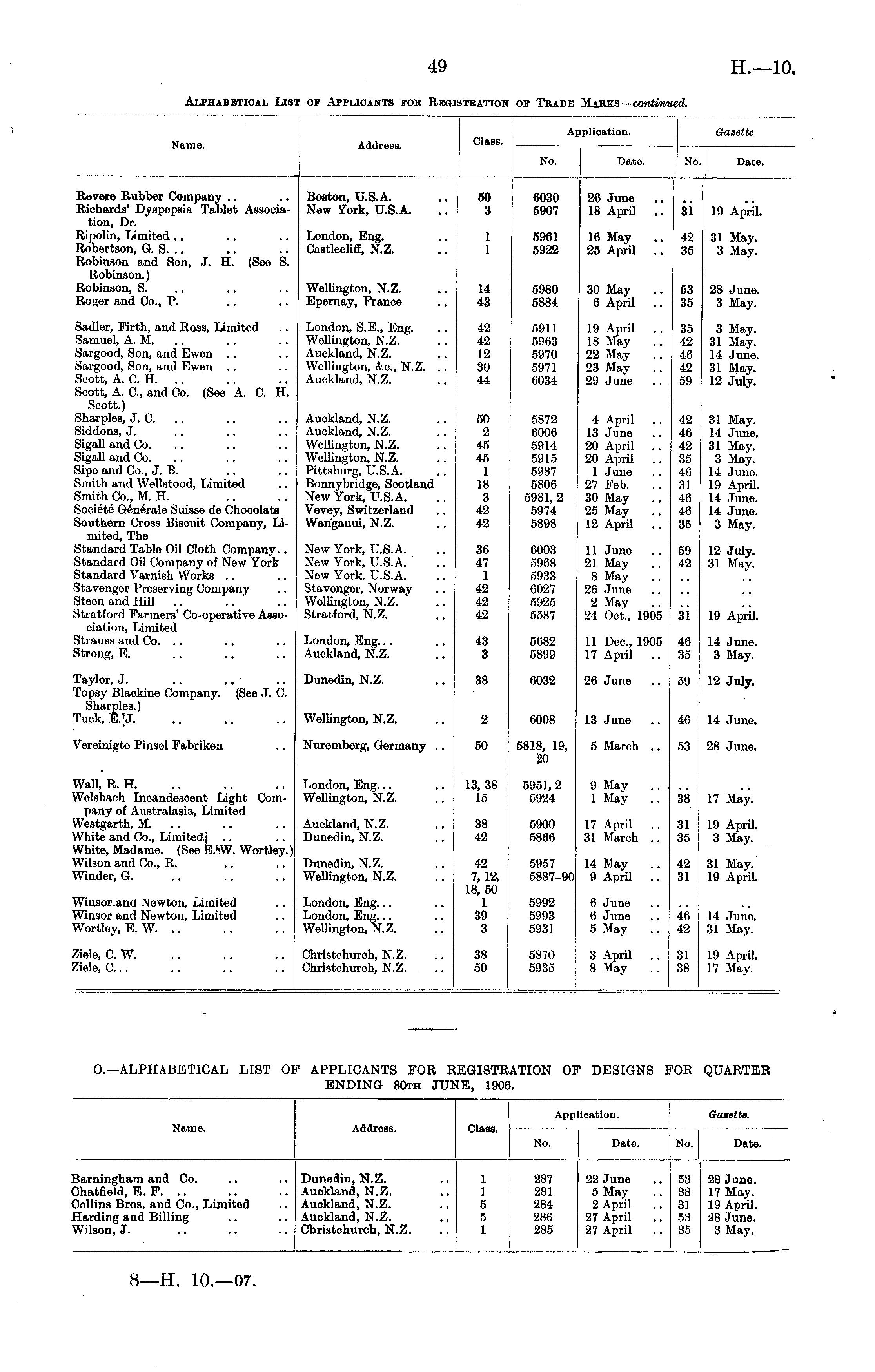 Name. Address. Class. Application. Gazette. No. Date. No. Date. iarningham and Go. lhatfield, E. F. .. iollins Bros, and Co., Limited larding and Billing Vilson, J. DuneSin, N.Z. Auokland, N.Z. Auokland, N.Z. Auckland, N.Z. Ohristohuroh, N.Z. 1 1 5 5 1 287 281 284 286 285 22 June 5 May 2 April 27 April 27 April 53 28 June. 38 17 May. 31 19 April. 53 48 June. 35 3 May.