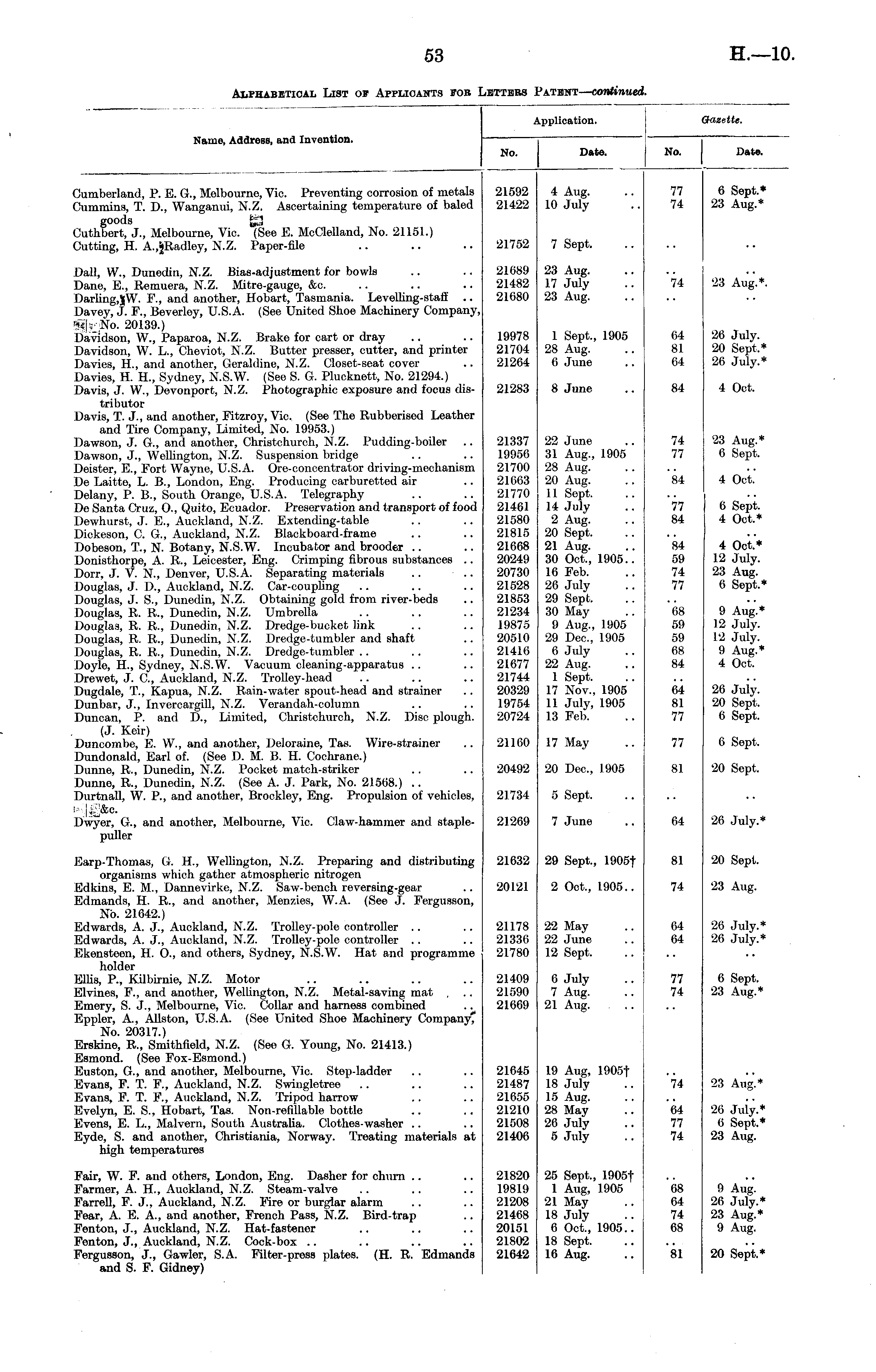 Application. β-azette. Name, Address, and Invention. No. No. Date. Date. Cumberland, P. E. G., Melbourne, Vic. Preventing corrosion of metals Cummins, T. D., Wanganui, N.Z. Ascertaining temperature of baled goode [a Cuthbert, J., Melbourne, Vic. (See E. McClelland, No. 21151.) Cutting, H. A.,£Radley, N.Z. Paper-file 21592 21422 4 Aug. 10 July 77 74 6 Sept.* 23 Aug.* 21752 7 Sept. Dall, W., Dunedin, N.Z. Bias-adjustment for bowls Dane, E., Remuera, N.Z. Mitre-gauge, &c. Darling.jW. P., and another, Hobart, Tasmania. Levelling-staff .. Davey, J. P., Beverley, U.S.A. (See United Shoe Machinery Company, ■>| No. 20139.) Davidson, W., Paparoa, N.Z. Brake for cart or dray Davidson, W. L., Cheviot, N.Z. Butter presser, cutter, and printer Davies, H., and another, Geraldine, N.Z. Closet-seat cover Davies, H. H., Sydney, N.S.W. (See S. G. Plucknett, No. 21294.) Davis, J. W., Devonport, N.Z. Photographic exposure and focus distributor Davis, T. J., and another, Fitzroy, Vic (See The Rubberised Leather and Tire Company, Limited, No. 19953.) Dawson, J. G., and another, Christchurch, N.Z. Pudding-boiler Dawson, J., Wellington, N.Z. Suspension bridge Deister, E., Fort Wayne, U.S.A. Ore-concentrator driving-mechanism De Laitte, L. B., London, Eng. Producing carburetted air Delany, P. B., South Orange, U.S.A. Telegraphy De Santa Cruz, O., Quito, Ecuador. Preservation and transport of food Dewhurst, J. E., Auckland, N.Z. Extending-table Dickeson, C. G., Auckland, N.Z. Blackboard-frame Dobeson, T., N. Botany, N.S.W. Incubator and brooder Donisthorpe, A. R., Leicester, Eng. Crimping fibrous substances .. Dorr, J. V. N., Denver, U.S.A. Separating materials Douglas, J. D., Auckland, N.Z. Car-coupling Douglas, J. S., Dunedin, N.Z. Obtaining gold from river-beds Douglas, R. R., Dunedin, N.Z. Umbrella Douglas, R. R., Dunedin, N.Z. Dredge-bucket link Douglas, R. R., Dunedin, N.Z. Dredge-tumbler and shaft Douglas, R. R., Dunedin, N.Z. Dredge-tumbler Doyle, H., Sydney, N.S.W. Vacuum cleaning-apparatus .. Drewet, J. C, Auckland, N.Z. Trolley-head Dugdale, T., Kapua, N.Z. Rain-water spout-head and strainer Dunbar, J., Invercargill, N.Z. Verandah-column Duncan, P. and D., Limited, Christchurch, N.Z. Disc plough. (J. Keir) Duncombe, E. W., and another, Deloraine, Tas. Wire-strainer Dundonald, Earl of. (See D. M. B. H. Cochrane.) Dunne, R., Dunedin, N.Z. Pocket match-striker Dunne, R., Dunedin, N.Z. (See A. J. Park, No. 21568.) .. Durtnall, W. P., and another, Brockley, Eng. Propulsion of vehicles, (- \;'&0. Dwyer, G., and another, Melbourne, Vic. Claw-hammer and staplepuller 21689 21482 21680 23 Aug. 17 July 23 Aug. 74 23 Aug.*. 19978 21704 21264 1 Sept., 1905 28 Aug. 6 June 64 81 64 26 July. 20 Sept.* 26 July.* 21283 8 June 84 4 Oct. 21337 19956 21700 21663 21770 21461 21580 21815 21668 20249 20730 21528 21853 21234 19875 20510 21416 21677 21744 20329 19754 20724 22 June 31 Aug., 1905 28 Aug. 20 Aug. 11 Sept. 14 July 2 Aug. 20 Sept. 21 Aug. 30 Oct., 1905.. 16 Feb. 26 July 29 Sept. 30 May 9 Aug., 1905 29 Dec, 1905 6 July 22 Aug. 1 Sept. 17 Nov., 1905 11 July, 1905 13 Feb. 74 77 23 Aug.* 6 Sept. 84 4 Oct. *77 84 6 Sept. 4 Oct.* 84 59 74 77 4 Oct.* 12 July. 23 Aug. 6 Sept.* 68 59 59 68 84 9 Aug.* 12 July. 12 July. 9 Aug.* 4 Oct. 64 81 77 26 July. 20 Sept. 6 Sept. 21160 17 May 77 6 Sept. 20492 20 Dec, 1905 81 20 Sept. 21734 5 Sept, 21269 7 June 64 26 July.* Earp-Thomas, G. H., Wellington, N.Z. Preparing and distributing organisms which gather atmospheric nitrogen Edkins, E. M., Dannevirke, N.Z. Saw-bench reversing-gear Edmands, H. R., and another, Menzies, W.A. (See J. Fergusson, No. 21642.) Edwards, A. J., Auckland, N.Z. Trolley-pole controller Edwards, A. J., Auckland, N.Z. Trolley-pole controller Ekensteen, H. O., and others, Sydney, N.S.W. Hat and programme holder Ellis, P., Kilbirnie, N.Z. Motor Elvines, F., and another, Wellington, N.Z. Metal-saving mat , Emery, S. J., Melbourne, Vic. Collar and harness combined Eppler, A., Allston, U.S.A. (See United Shoe Machinery Company, No. 20317.) Erskine, R., Smithfield, N.Z. (See G. Young, No. 21413.) Esmond. (See Fox-Esmond.) Euston, G., and another, Melbourne, Vic. Step-ladder Evans, F. T. F., Auckland, N.Z. Swingletree Evans, F. T. F., Auckland, N.Z. Tripod harrow Evelyn, E. S., Hobart, Tas. Non-refillable bottle Evens, E. L., Malvern, South Australia. Clothes-washer Eyde, S. and another, Christiania, Norway. Treating materials at high temperatures 21632 29 Sept., 1905f 81 20 Sept. 20121 2 Oct., 1905.. 74 23 Aug. 21178 21336 21780 22 May 22 June 12 Sept. 64 64 26 July.* 26 July.* 21409 21590 21669 6 July 7 Aug. 21 Aug. 77 74 6 Sept. 23 Aug.* 21645 21487 21655 21210 21508 21406 19 Aug, 1905f 18 July 15 Aug. 28 May 26 July 5 July 74 64 77 74 23 Aug.* 26 July.* 6 Sept.* 23 Aug. Fair, W. F. and others, London, Eng. Dasher for churn Farmer, A. H., Auckland, N.Z. Steam-valve Farrell, F. J., Auckland, N.Z. Fire or burglar alarm Fear, A. E. A., and another, French Pass, N.Z. Bird-trap Fenton, J., Auckland, N.Z. Hat-fastener Fenton, J., Auckland, N.Z. Cock-box .. Fergusson, J., Gawler, S.A. Filter-press plates. (H. R. Edmands and S. F. Gidney) 21820 19819 21208 21468 20151 21802 21642 25 Sept., 1905f 1 Aug, 1905 21 May 18 July 6 Oct., 1905.. 18 Sept. 16 Aug. 68 64 74 68 9 Aug'. 26 July.* 23 Aug.* 9 Aug. 81 20 Sept.*