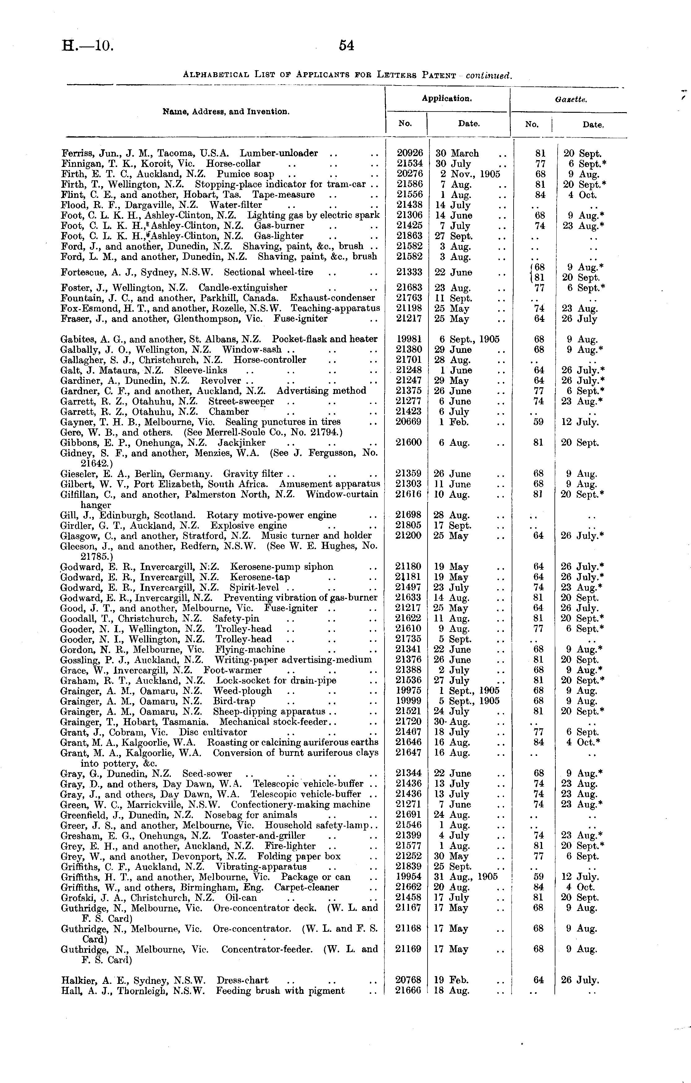 .ppi lica' Sion. Gazette. Name, Address, and Invention. No. Date. No. Date. Ferriss, Jun., J. M., Tacoma, U.S.A. Lumber-unloader Finnigan, T. K., Koroit, Vic. Horse-collar Firth, E. T. G, Auckland, N.Z. Pumice soap Firth, T., Welhngton, N.Z. Stopping-place indicator for tram-car .. Flint, C. E., and another, Hobart, Tas. Tape-measure Flood, R. F., Dargaville, N.Z. Water-filter Foot, C. L. K. H., Ashley-Clinton, N.Z. Lighting gas by electric spark Foot, C. L. K. H.,*Ashley-Clinton, N.Z. Gas-burner Foot, C. L. K. H.,»Ashley-Clinton, N.Z. Gas-lighter Ford, J., and anotner, Dunedin, N.Z. Shaving, paint, &c, brush .. Ford, L. M., and another, Dunedin, N.Z. Shaving, paint, &c, brush Fortescue, A. J., Sydney, N.S.W. Sectional wheel-tire 20926 21534 20276 21586 21556 21438 21306 21425 21863 21582 21582 30 March 30 July 2 Nov., 1905 7 Aug. 1 Aug. 14 July 14 June 7 July 27 Sept. 3 Aug. 3 Aug. 81 77 68 81 84 68 74 20 Sept. 6 Sept.* 9 Aug. 20 Sept.* 4 Oct. 9 Aug.* 23 Aug.* 21333 22 June (68 t81 77 9 Aug.* 20 Sept. 6 Sept.* Foster, J., Wellington, N.Z. Candle-extinguisher Fountain, J. C, and another, Parkhill, Canada. Exhaust-condenser Fox-Esmond, H. T., and another, Rozelle, N.S.W. Teaching-apparatus Fraser, J., and another, Glenthompson, Vic. Fuse-igniter 21683 21763 21198 21217 23 Aug. 11 Sept. 25 May 25 May 74 64 23 Aug. 26 July Gabites, A. G., and another, St. Albans, N.Z. Pocket-flask and heater Galbally, J. 0., Wellington, N.Z. Window-sash Gallagher, S. J., Christchurch, N.Z. Horse-controller Gait, J. Mataura, N.Z. Sleeve-links Gardiner, A., Dunedin, N.Z. Revolver Gardner, C. F., and another, Auckland, N.Z. Advertising method Garrett, R. Z., Otahuhu, N.Z. Street-sweeper Garrett, R. Z., Otahuhu, N.Z. Chamber Gayner, T. H. B., Melbourne, Vic. Sealing punctures in tires Gere, W. B., and others. (See Merrell-Soule Co., No. 21794.) Gibbons, E. P., Onehunga, N.Z. Jackjinker Gidney, S. F., and another, Menzies, W.A. (See J. Fergusson, No. 21642.) Gieseler, E. A., Berlin, Germany. Gravity filter Gilbert, W. V., Port Elizabeth, South Africa. Amusement apparatus Gilfillan, C, and another, Palmerston North, N.Z. Window-curtain hanger Gill, J., Edinburgh, Scotland. Rotary motive-power engine Girdler, G. T., Auckland, N.Z. Explosive engine Glasgow, C.| and another, Stratford, N.Z. Music turner and holder Gleeson, J., and another, Redfern, N.S.W. (See W. E. Hughes, No. 21785.) Godward, E. R., Invercargill, N;Z. Kerosene-pump siphon Godward, E. R., Invercargill, N.Z. Kerosene-tap Godward, E. R., Invercargill, N.Z. Spirit-level Godward, E. R., Invercargill, N.Z. Preventing vibration of gas-burner Good, J. T., and another, Melbourne, Vic. Fuse-igniter Goodall, T., Christchurch, N.Z. Safety-pin Gooder, N. I., Wellington, N.Z. Trolley-head Gooder, N. I., Wellington, N.Z. Trolley-head Gordon, N. R., Melbourne, Vic. Flying-machine Gossling, P. J., Auckland, N.Z. Writing-paper advertising-medium Grace, W., Invercargill, N.Z. Foot-warmer Graham, R. T., Auckland, N.Z. Lock-socket for drain-pipe Grainger, A. M., Oamaru, N.Z. Weed-plough Grainger, A. M., Oamaru, N.Z. Bird-trap Grainger, A. M., Oamaru, N.Z. Sheep-dipping apparatus Grainger, T., Hobart, Tasmania. Mechanical stock-feeder.. Grant, J., Cobram, Vic. Disc cultivator Grant, M. A., Kalgoorlie, W.A. Roasting or calcining auriferous earths Grant, M. A., Kalgoorlie, W.A. Conversion of burnt auriferous clays into pottery, &c. Gray, G., Dunedin, N.Z. Seed-sower .. Gray, D., and others, Day Dawn, W.A. Telescopic vehicle-buffer .. Gray, J., and others, Day Dawn, W.A. Telescopic vehicle-buffer .. Green, W. C, Marrickville, N.S.W. Confectionery-making machine Greenfield, J., Dunedin, N.Z. Nosebag for animals Greer, J. S., and another, Melbourne, Vic. Household safety-lamp.. Gresham, E. G., Onehunga, N.Z. Toaster-and-griller Grey, E. H., and another, Auckland, N.Z. Fire-lighter Grey, W., and another, Devonport, N.Z. Folding paper box Griffiths, C. F., Auckland, N.Z. Vibrating-apparatus Griffiths, H. T., and another, Melbourne, Vic. Package or can Griffiths, W., and others, Birmingham, Eng. Carpet-cleaner Grofski, J. A., Christchurch, N.Z. Oil-can Guthridge, N., Melbourne, Vic. Ore-concentrator deck. (W. L. and F. S. Card) Guthridge, N., Melbourne, Vic. Ore-concentrator. (W. L. and F. S. Card) Guthridge, N., Melbourne, Vic. Concentrator-feeder. (W. L. and F. S. Card) 19981 21380 21701 21248 21247 21375 21277 21423 20669 21600 21359 21303 21616 21698 21805 21200 21180 21181 21497 21633 21217 21622 21610 21735 21341 21376 21388 21536 19975 19999 21521 21720 21407 21646 21647 6 Sept., 1905 29 June 28 Aug. 1 June 29 May 26 June 6 June 6 July 1 Feb. 6 Aug. 26 June 11 June 10 Aug. 28 Aug. 17 Sept. 25 May 19 May 19 May 23 July 14 Aug. 25 May 11 Aug. 9 Aug. 5 Sept. 22 June 26 June 2 July 27 July 1 Sept., 1905 5 Sept., 1905 24 July 30- Aug. 18 July 16 Aug. 16 Aug. 68 68 64 64 77 74 59 81 68 68 81 64 64 64 74 81 64 81 77 68 81 68 81 68 68 81 9 Aug. 9 Aug.* 26 July.* 26 July.* 6 Sept.* 23 Aug.* 12 Juiy. 20 Sept. 9 Aug. 9 Aug. 20 Sept.* 26 Juiy.* 26 July.* 26 July.* 23 Aug.* 20 Sept. 26 July. 20 Sept.* 6 Sept.* 9 Aug.* 20 Sept. 9 Aug.* 20 Sept.* 9 Aug. 9 Aug. 20 Sept.* 77 84 6 Sept. 4 Oct.* 21344 21436 21436 21271 21691 21546 21399 21577 21252 21839 19954 21662 21458 21167 22 June 13 July 13 July 7 June 24 Aug. 1 Aug. 4 July 1 Aug. 30 May 25 Sept. 31 Aug., 1905 20 Aug. 17 July 17 May 68 74 74 74 74 81 77 9 Aug.* 23 Aug. 23 Aug. 23 Aug.* 23 Aug.* 20 Sept.* 6 Sept. 59 84 81 68 12 July. 4 Oct. 20 Sept. 9 Aug. 21168 17 May 68 9 Aug. 21169 17 May 68 9 Aug. Halkier, A. E., Sydney, N.S.W. Dress-chart HalL A. J., Tbornleigh, N.S.W. Feeding brush with pigment 20768 21666 19 Feb. 18 Aug. 64 26 July.