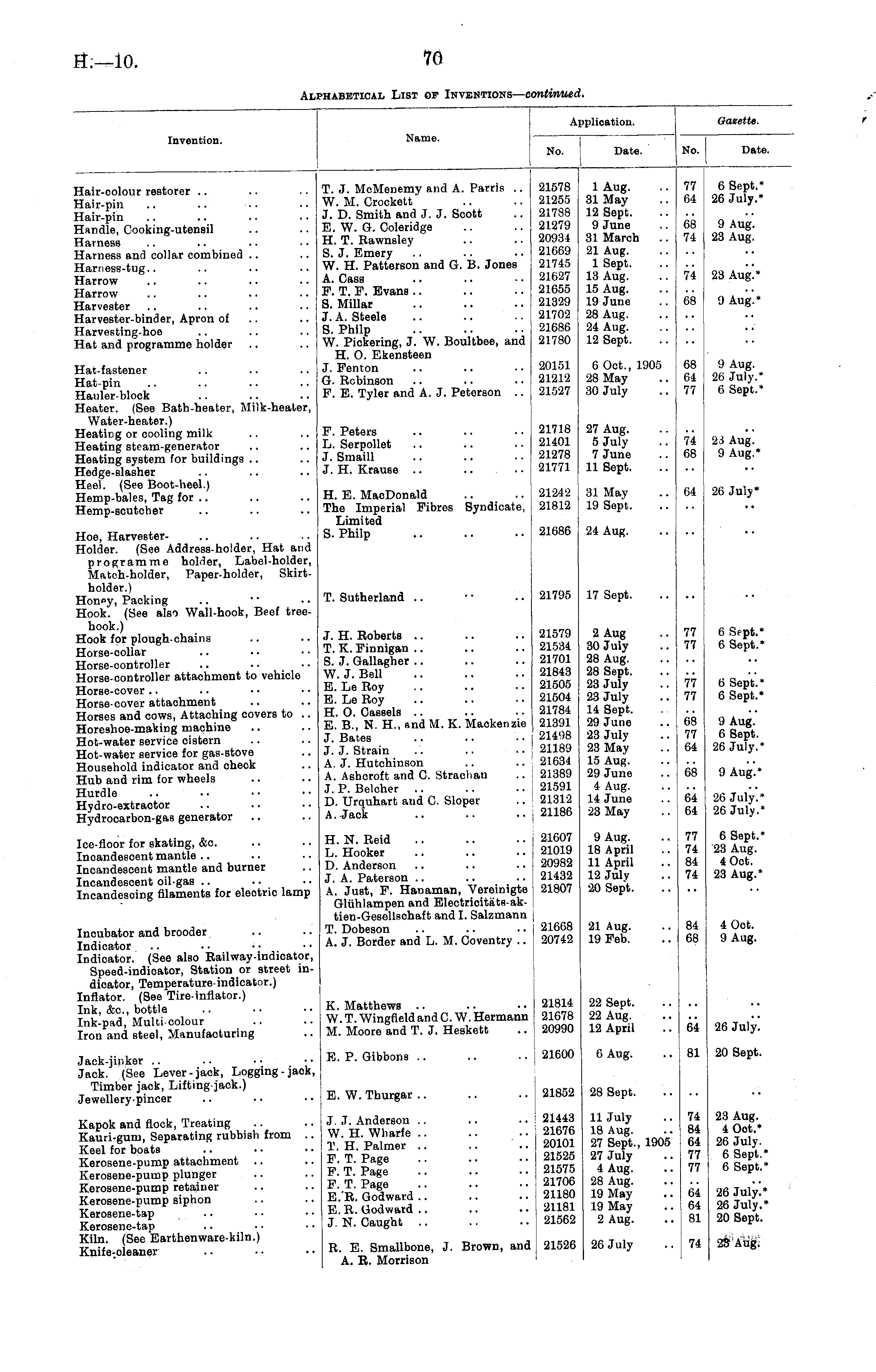 Application. Gazette. Invention. Name. No. Date. No. Date. Hair-colour restorer Hair-pin Hair-pin Handle, Cooking-utensil Harness Harness and collar combined Harness-tug.. TT T. J. McMenemy and A. Parris .. W. M. Crockett' J. D. Smith and J. J. Seott E. W. G. Coleridge H. T. Rawnsley S. J. Emery W. H. Patterson and G. B. Jones A. CasB P. T. F. Evans .. S. Millar J. A. Steele S. Philp .. .. • • i W. Pickering, J. W. Boultbee, and H. O. Ekensteen J. Fenton G. Robinson F. E. Tyler and A. J. Peterson .. 21578 21255 21788 21279 20934 21G69 21745 21627 21655 21329 21702 21686 21780 1 Aug. 31 May 12 Sept. 9 June 31 March 21 Aug. 1 Sept. 13 Aug. 15 Aug. 19 June 28 Aug. 24 Aug. 12 Sept. 77 64 68 74 74 6 Sept.* 26 July.* 9 Aug. 23 Aug. 23 Aug.* Harrow Harrow Harvester Harvester-binder, Apron of Harvesting-hoe Hat and programme holder 68 9 Aug.* Hat-fastener Hat-pin Hauler-block Heater. (See Bath-heater, Milk-heater, Water-heater.) Heating or cooling milk Heating steam-generator Heating system for buildings Hedge-slasher Heel. (See Boot-heel.) Hemp-bales, Tag for .. Hemp-scutcher 20151 21212 21527 6 Oct., 1905 28 May 30 July 68 64 77 9 Aug. 26 July.* 6 Sept.* F. Peters L. Serpollet J. Smaill J. H. Krause .. .. 21718 21401 21278 21771 27 Aug. 5 July 7 June 11 Sept. 74 68 23 Aug. 9 Aug.* H. E. MaoDonald The Imperial Fibres Syndicate, Limited S. Philp 21242 21812 31 May 19 Sept. 64 26 July* Hoe, HarvesterHolder. (See Address-holder, Hat and programme holder, Label-holder, Match-holder, Paper-holder, Skirtholder.) Honey, Packing Hook. (See alsT Wall-hook, Beef treehook.) Hook for plough-chains Horse-collar Horse-controller Horse-controller attachment to vehicle Horse-cover Horse-cover attachment Horses and cows, Attaching covers to .. Horeshoe-making machine Hot-water service cistern Hot-water service for gas-stove Household indicator and oheok Hub and rim for wheels Hurdle Hydro-extractor Hydrocarbon-gas generator 21686 24 Aug. T. Sutherland 17 Sept. 21795 J. H. Roberts T. K. Finnigan S. J. Gallagher .. W. J. Bell E. Le Roy E. Le Roy H. 0. Cassels .. E. B., N. H., and M. K. Mackenzie J. Bates .. .. • • J J. J. Strain .. .. •■ A. J. Hutchinson A. Ashcroft and C. Straclian .. ' J. P. Belcher .. .. .. D. Urquhart and C. Sloper A. Jack 21579 21534 21701 21843 21505 21504 21784 21391 21498 21189 21634 21389 21591 21312 21186 2 Aug 30 July 28 Aug. 28 Sept. 23 July 23 July 14 Sept. 29 June 23 July 23 May 15 Aug. 29 June 4 Aug. 14 June 23 May 77 77 6 Sept.* 6 Sept.* 77 77 6 Sept.* 6 Sept.* 68 77 64 9 Aug. 6 Sept. 26 July.* 68 9 Aug.* 64 64 26 July'.* 26 July.* Ice-floor for skating, &c. Inoandescent mantle Incandescent mantle and burner Incandescent oil-gas Incandesoing filaments for eleotric lamp H. N. Reid L. Hooker D. Anderson J. A. Paterson A. Just, F. Hanaman, Vereinigte Gliihlampen and Electricitata-ak-tien-Gesellsohaft and I. Salzmann T. Dobeson A. J. Border and L. M. Coventry .. 21607 21019 20982 21432 21807 9 Aug. 18 April 11 April 12 July 20 Sept. 77 74 84 74 6 Sept.* 23 Aug. 4 Oct. 23 Aug.* Incubator and brooder Indicator Indicator. (See also Railway-indicator, Speed-indicator, Station or street indicator, Temperature-indicator.) Inflator. (See Tire-inflator.) Ink, &c, bottle Ink-pad, Multicolour Iron and steel, Manufacturing 21668 20742 21 Aug. 19 Feb. 84 68 4 Oct. 9 Aug. K. Matthews .. W. T. Wingfield and C. W. Hermann M. Moore and T. J. Heskett 21814 21678 20990 22 Sept. 22 Aug. 12 April 64 26 July! Jack-jinker Jack. (See Lever-jack, Logging - jaok, Timber jack, Lifting jack.) Jewellery-pincer E. P. Gibbons .. 21600 6 Aug. 81 20 Sept. E. W. Thurgar 21852 28 Sept. Kapok and flock, Treating Kauri-gum, Separating rubbish from .. Keel for boata Kerosene-pump attachment Kerosene-pump plunger Kerosene-pump retainer Kerosene-pump siphon Kerosene-tap Kerosene-tap Kiln. (See Earthenware-kiln.) Knife-oleaner J. J. Anderson .. W. H. Wharfe .. T. H. Palmer .. F. T. Page F. T. Page F. T. Page E.'R. Godward E.R. Godward .. J. N. Caught .. 21443 21676 20101 21525 21575 21706 21180 21181 21562 11 July 18 Aug. 27 Sept., 1905 27 July 4 Aug. 28 Aug. 19 May 19 May 2 Aug. 74 84 64 77 77 23 Aug. 4 Oot.* 26 July. 6 Sept.* 6 Sept.* 64 64 81 26 July.* 26 July.* 20 Sept. R. E. Smallbone, J. Brown, and A. R. Morrison 21526 26 July 74 23 Aug.