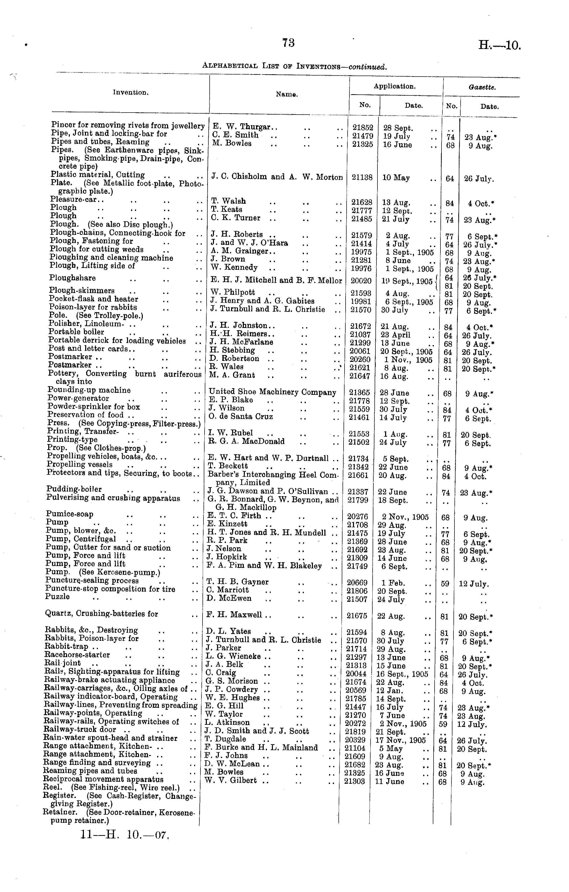 ipp] [icai ;ion. Gazette. Invention. Name. No. Date. No. Date, Pincer for removing rivots from jewellery Pipe, Joint and locking-bar for Pipes and tubes, Reaming Pipes. (See Earthenware pipes, Sinkpipes, Smokingpipe, Drain-pipe, Concrete pipe) Plastic material, Cutting Plate. (See Metallic footplate, Photographic plate.) Pleasure-car.. Plough Plough Plough. (See also Disc plough.) Plough-chains, Connecting-hook for Plough, Fastening for Plough for cutting weeds Ploughing and cleaning machine Plough, Lifting side of ! E. W. Thurgar.. . C. E. Smith M. Bowles J. C. Chisholm and A. W. Morton T. Walsh T.Keats C. K. Turner .. 21852 21479 21325 21138 21628 21777 21485 28 Sept. 19 July 16 June 10 May 13 Aug. 12 Sept. 21 July 74 68 64 23 Aug.* 9 Aug. 26 July. 4 Oct.* 84 74 23 Aug.* J. H. Roberts .. J. and W. J. O'Hara A. M. Grainger.. J. Brown W. Kennedy 21579 21414 19975 21281 19976 2 Aug. 4 July 1 Sept., 1905 8 June 1 Sept., 1905 77 04 G8 74 68 64 81 81 68 77 6 Sept.* 26 July.* 9 Aug. 23 Aug.* 9 Aug. 26 July.* 20 Sept. 20 Sept. 9 Aug. 6 Sept.* Ploughshare E. H. J. Mitchell and B. F. Mellor 20020 19 Sept., 1905 j 4 Aug. 6 Sept., 1905 30 July Plough-skimmers Pooket-flask and heater Poison-layer for rabbits Pole. (See Trolley-pole.) Polisher, LinoleumPortable boiler Portable derrick for loading vehicles Post and letter cards.. Postmarker Postmarker Pottery, Converting burnt auriferous clays into Pouiiding-up machine Power-generator Powder-sprinkler for box Preservation of food Press. (See Copying-press, Filter-press.) Printing, Transfer-Printing-type Prop. (See Clothes-prop.) Propelling vehicles, boats, &c. Propelling vessels Protectors and tips, Securing, to boots.. W. Philpott J. Henry and A. G. Gabites J. Turnbull and R. L. Christie .. J. H. Johnston.. H. H. Reimers.. .. J. H. McFarlane H. Stebbing D. Robertson .. R. Wales M. A. Grant 21593 19981 21570 21672 21037 21299 20061 20260 21621 21647 21 Aug. 23 April 13 June 20 Sept., 1905 1 Nov., 1905 8 Aug. 16 Aug. 84 64 68 64 81 81 4 Oct.* 26 July. 9 Aug.* 26 July. 20 Sept. 20 Sept.* United Shoe Machinery Company E. P. Blake .. .. J. Wilson O. de Santa Cruz 21365 21778 21559 21461 28 June 12 Sept. 30 July 14 July 68 84 77 9 Aug.* 4 Oct.* 6 Sept. I. W. Rubel R. G. A. MacDonald 21553 21502 1 Aug. 24 July 81 77 20 Sept. 6 Sept. E. W. Hart and W. P. Durtnall . T. Beckett Barber's Interchanging Heel Company, Limited J. G. Dawson and P. O'Sullivan .. G. R. Bonnard, G. W. Beynon, and G. H. Mackillop E. T. C. Firth .. E. Kinzett H. T. Jones and R. H. Mundell . R. P. Park J. Nelson J. Hopkirk .. F. A. Pirn and W. H. Blakeley .. 21734 21342 21661 5 Sept. 22 June 20 Aug. 68 84 9 Aug.* 4 Oct. Pudding-boiler Pulverising and crushing apparatus 21337 21799 22 June 18 Sept. 74 23 Aug.* Pumice-soap Pump Pump, blower, &c. Pump, Centrifugal Pump, Cutter for sand or suction Pump, Force and lift Pump, Force and lift Pump. (See Kerosene-pump.) Puncture-sealing process Puncture-stop composition for tire Puzzle 20276 21708 21475 21369 21692 21309 21749 2 Nov., 1905 29 Aug. 19 July 28 June 23 Aug. 14 Juno 6 Sept. 68 77 68 81 68 9 Aug. 6 Sept. 9 Aug.* 20 Sept.* 9 Aug. T. H. B. Gayner C. Marriott D. McEwen 20669 21806 21507 1 Feb. 20 Sept. 24 July 59 12 July. Quartz, Crushing-batteries for F. H. Maxwell .. 21675 22 Aug. 81 20 Sept. , Rabbits, &c, Destroying Rabbits, Poison-layer for Rabbit-trap .. .. .. Racehorse-starter .. .. Bail joint .. .. .. .. , Rails, Sighting-apparatus for lifting Railway-brake actuating appliance Railway-carriages, &c, Oiling axles of .. , Railway indicator-board, Operating Railway-lines, Preventing from spreading ; Railway-points, Operating .. .. ' Railway-rails, Operating switches of .. ] Railway-truok door .. .. ,, ; Rain-water spout-head and strainer .. ' Range attachment, Kitchen- .. .. ] Range attachment, Kitchen- .. .. ] Range finding and surveying .. .. ] Reaming pipes and tubes .. .. ] Reciprocal movement apparatus .. 7 Reel. (See Fishing-reel, Wire reel.) .. Register. (See Cash-Register, Changegiving Register.) Retainer. (See Door-retainer, Kerosenepump retainer.) D. L. Yates J. Turnbull and R. L. Christie .. J. Parker L. G. Wieneke J. A. Belk C. Craig G. S. Morison .. J. P. Cowdery W. E. Hughes E. G. Hill W. Taylor L. Atkinson J. D. Smith and J. J. Scott T. Dugdale F. Burke and H. L. Mainland F. J. Johns .. .. D. W. McLean M. Bowles W. V. Gilbert 21594 21570 ! 21714 I 21297 21313 20044 21674 20569 21785 21447 21270 20272 21819 20329 I 21104 21609 21682 21325 21303 8 Aug. 30 July 29 Aug. 13 June 15 June 16 Sept., 1905 22 Aug. 12 Jan. 14 Sept. 16 July 7 June 2 Nov., 1905 21 Sept. 17 Nov., 1905 5 May 9 Aug. 23 Aug. 16 June 11 June 81 77 68 81 64 84 68 74 74 59 20 Sept.* 6 Sept.* 9 Aug.* 20 Sept.* 26 July. 4 Oct. 9 Aug. 23 Aug.* 23 Aug. 12 July. 64 81 26 July. 20 Sept. 81 68 68 20 Sept.* 9 Aug. 9 Aug.