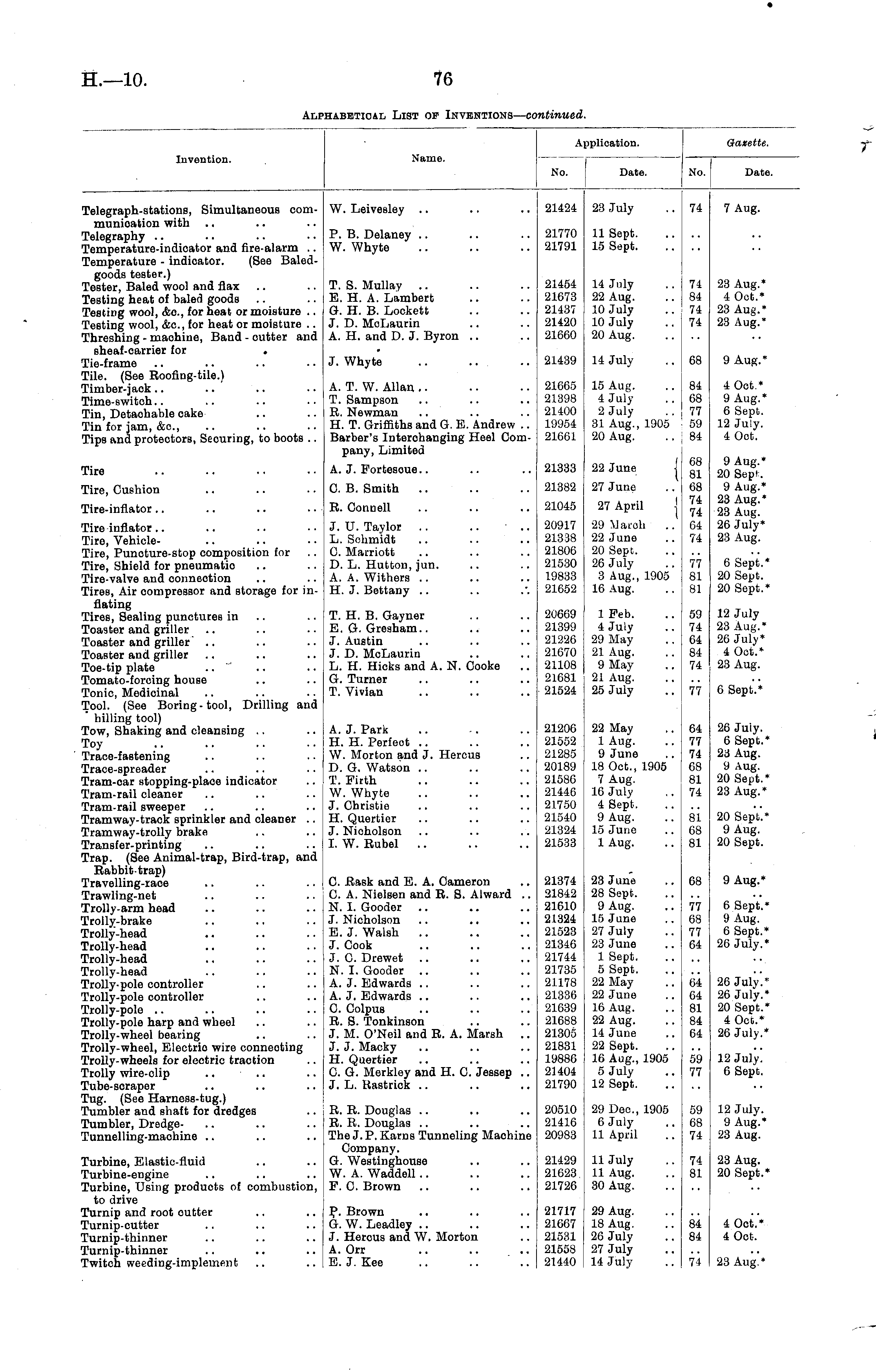 .ppl lical ;ion. [ a*ei Sβ. Invention. Name. No. Date. No. Dati relegraph-stations, Simultaneous communication with Eelegraphy .. lemperature-indioator and fire-alarm .. Temperature - indicator. (See Baledgoods tester.) raster, Baled wool and flax resting heat of baled goods Testing wool, &c, for heat or moisture .. Testing wool, &c, for heat or moisture .. Threshing - machine, Band - cutter and sheaf-carrier for . Tie-frame Tile. (See Boofiog-tile.) Kmber-jack lime-switch.. Tin, Detachable cake Tin for jam, &c, Tips and protectors, Securing, to boots .. W. Leivesley 21424 23 July 74 7 Aug. P. B. Delaney .. W. Whyte 21770 21791 11 Sept. 15 Sept. T. S. Mullay .. B. H. A. Lambert G. H. B. Lockett J. D. McLaurin A. H. and D. J. Byron 21454 21673 21437 21420 21660 14 July 22 Aug. 10 July 10 July 20 Aug. 74 84 71 74 23 Aug.' 4 Oct.* 23 Aug.* 23 Aug.* J. Whyte 21439 14 July 68 9 Aug.* A. T. W. Allan .. T. Sampson R. Newman H. T. Griffiths and G. B. Andrew .. Barber's Interchanging Heel Company, Limited A. J. Fortescue.. 21665 21398 21400 19954 21661 15 Aug. 4 July 2 July 31 Aug., 1905 20 Aug. 84 08 77 59 84 4 Oct.* 9 Aug.* 6 Sept. 12 July. 4 Oct. Kre Tire, Cushion C. B. Smith R. Connell 21333 21382 21045 22 Juno j 27 June 27 April J 68 81. (38 74 74 64 74 9 Aug.* 20 Sept. 9 Aug.* 23 Aug.* 23 Aug. 26 July* 23 Aug. rire-inflator Tire inflator .. Tire, Vehiclelire, Puncture-stop composition for Tire, Shield for pneumatic Pire-valve and connection Tires, Air compressor and storage for inflating Tires, Sealing punctures in Toaster and griller Toaster and griller .. Toafiter and griller Toe-tip plate .. " Pomato-foroing house Tonic, Medicinal Tool. (See Boring-tool, Drilling and hilling tool) Tow, Shaking and cleansing .. Toy Trace-fastening Trace-spreader Tram-oar stopping-place indicator Tram-rail cleaner Tram-rail sweeper Tramway-track sprinkler and cleaner .. Tramway-trolly brake Transfer-printing Trap. (See Animal-trap, Bird-trap, and Rabbit-trap) Travelling-race Trawling-net rrolly-arm head Trolly-brake Trolly-head Trolly-head Trolly-head Trolly-head Trolly-pole controller Trolly-pole controller Trolly-pole Trolly-pole harp and wheel Trolly-wheel bearing Trolly-wheel, Electrio wire connecting Trolly-wheels for electric traction Trolly wire-clip .. Tube-scraper Tug. (See Harness-tug.) Tumbler and shaft for dredges Tumbler, Dredge-Tunnelling-machine J. U. Taylor .. .. .. L. Schmidt C. Marriott D. L. Hutton, jun. A. A. Withers .. H. J. Bettany .. T. H. B. Gayner B. G. Gresham.. J. Austin J. D. McLaurin L. H. Hicks and A. N. Cooke .. G. Turner T. Vivian A. J. Park H. H. Perfeot W. Morton and J. Hercus D. G. Watson .. T. Firth W. Whyte J. Christie H. Quertier J. Nicholson I. W. Rubel 20917 21338 21806 21530 19833 21652 20669 21399 21226 21670 21108 21681 21524 21206 21552 21285 20189 21586 21446 21750 21540 21324 21533 29 Macou .. 22 June 20 Sept. 26 July 3 Aug., 1905 16 Aug. 1 Feb. 4 July 29 May 21 Aug. 9 May 21 Aug. 25 July 22 May 1 Aug. 9 June 18 Oct., 1905 7 Aug. 16 July 4 Sept. 9 Aug. 15 Juno 1 Aug. 77 81 81 59 74 64 81 74 77 64 77 74 08 81 74 81 08 81 6 Sept.* 20 Sept. 20 Sept.* 12 July 23 Aug.* 26 July* 4 Oct.* 23 Aug. 6 Sept.* 26 Juiy. 6 Sept.* 23 Aug. 9 Aug. 20 Sept.* 23 Aug.* 20 Sept.* 9 Aug. 20 Sept. C. Rask and B. A. Cameron C. A. Nielsen and R. S. Alward .. N. I. Gooder J. Nicholson B. J. Walsh .. J. Cook J. C. Drewet .. N. I. Gooder .. A. J. Edwards A. J. Edwards .. C. Colpus R. S. Tonkinson J. M. O'Neil and R. A. Marsh .. J. J. Macky H. Quertier C. G. Merkley and H. C. Jessep .. J. L. Kiistrick .. 21374 21842 21610 21324 21523 21346 21744 21735 21178 21336 21639 21688 21305 21831 19886 21404 21790 23 June 28 Sept. 9 Aug. 15 June 27 July 23 June 1 Sept. 5 Sept. 22 May 22 June 16 Aug. 22 Aug. 14 June 22 Sept. 16 Aug., 1905 5 July 12 Sept. 68 77 08 77 64 64 04 81 84 64 9 Aug.* 6 Sept.* 9 Aug. 6 Sept.* 26 July.* 26 July." 26 July.* 20 Sept.* 4 Oct.* 26 July.* 59 77 12 July. 6 Sept. R. R. Douglas .. R. R. Douglas The J. P. Karns Tunneling Machine Company. G. Westinghouse W. A. Waddell P. C. Brown 20510 21416 20983 29 Dec, 1905 6 July 11 April 69 68 74 12 July. 9 Aug.* 23 Aug. Turbine, Elastic-fluid Turbine-engine Turbine, Using products n! combustion, to drive Turnip and root cutter Turnip-cutter Turnip-thinner Turnip-thinner Twitch weeding-implempnt 21429 21623 21726 11 July 11 Aug. 30 Aug. 74 81 23 Aug. 20 Sept.* P. Brown G. W. Leadley .. J. Hercue and W. Morton A. Orr E. J. Kee 21717 21667 21531 21558 21440 29 Aug. 18 Aug. 26 July 27 July 14 July 84 84 4 Oct.'* 4 Oct. 74 23 Aug.*