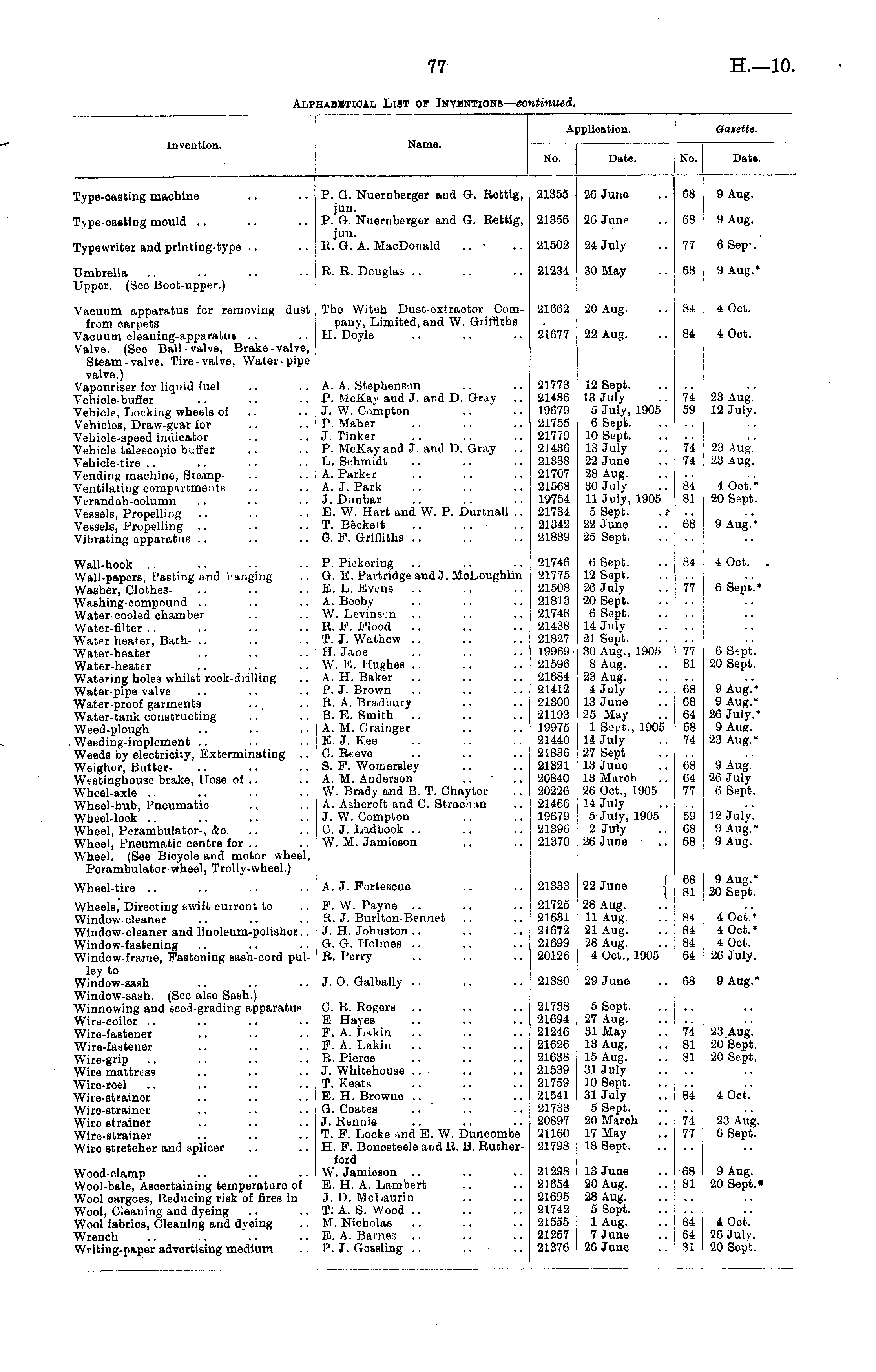 >PP! Ileal lion. Fa#0i !e. Invention. Name. No. Date. No. Data. Type-casting machine P. G. Nuernberger and G. Rettig, jun. P. G. Nuernberger and G. Eettig, jun. B. G. A. MacDonald .. • 21355 26 June 68 9 Aug. Type-casting mould 21356 26 June 08 9 Aug. Typewriter and printing-type 21502 24 July 77 6 Sepr. Umbrella Upper. (See Boot-upper.) R. R. Dcuglas .. 21234 30 May 08 9 Aug.* Vacuum apparatus for removing dust from carpets Vacuum cleaning-apparatut .. Valve. (See Ball-valve, Brake-valve, Steam-valve, Tire-valve, Water-pipe valve.) Vapouriser for liquid fuel Vehicle buffer Vehicle, Locking wheels of Vehicles, Draw-gear for Vehicle-speed indicator Vehicle telescopic buffer Vehicle-tire .. Vending machine, StampVentilating compartments Verandab-column Vessels, Propelling Vessels, Propelling Vibrating apparatus The Witoh Dust-extractor Company, Limited, and W. Griffiths H. Doyle 21662 20 Aug. 81 4 Oct. 21677 22 Aug. 84 4 Oct. A. A. Stephenson P. McKay and J. and D. Gray J. W. Compton P. Maher J. Tinker P. McKay and J. and D. Gray L. Schmidt A. Parker A. J. Park J. Diinbar E. W. Hart and W. P. Durtnall .. T. Beekeit C. F. Griffiths 21773 21436 19679 21755 21779 21436 21338 21707 21568 19754 21734 21342 21839 12 Sept. 13 July 5 July, 1905 6 Sept. 10 Sept. 13 July 22 June 28 Aug. 30 July 11 July, 1905 5 Sept. ..' 22 June 25 Sept. 74 59 74 74 23 Aug. 12 July. 23 Aug. 23 Aug. 84 81 4 Oct.* 20 Sept. t>8 9 Aug.* Wall-hook .. Wall-papers, Pasting and ranging Washer, Clothes-Washing-compound Water-cooled chamber Water-filter Water heater, Bath-Water-heater Water-heattr Watering holes whilst rock-drilling Water-pipe valve Water-proof garments Water-tank constructing Weed-plough Weeding-irnplement Weeds by electricity, Exterminating .. Weigher, But.terWestingbouse brake, Hose of .. Wheel-axle Wheel-hub, Pneumatio Wheel-lock .. Wheel, Perambulator-, &o. Wheel, Pneumatio centre for .. Wheel. (See Bioycle and motor wheel, Perambulator-wheel, Trolly-wheel.) P. Pickering G. B. Partridge and J. McLoughlin E. L. Evens A. Beeby W. Levinso n R. P. Flood T. J. Wathew .. FT. Jane W. E. Hughes .. A. H. Baker P. J, Brown R. A. Bradbury B. E. Smith A. M. Grainger E. J. Kee C. Reeve S. P. Womersley A. M. Auderson W. Brady and B. T. Chaytor A. Ashcroft and C. Stractnm J. W. Compton C. J. Ladbook .. W. M. Jamieson 21746 21775 21508 21813 21748 21438 21827 1996921596 21684 21412 21300 21193 19975 21440 21836 21321 20840 20226 21466 19679 21396 21370 6 Sept. 12 Sept. 26 July 20 Sept. 6 Sept. 14 July 21 Sept. 30 Aug., 1905 8 Aug. 23 Aug. 4 July 13 June 25 May 1 Sept., 1905 14 July 27 Sept 13 June 13 March 26 Oct., 1905 14 July 5 July, 1905 2 July 26 June 84 4 Oct. 77 6 Sept.* 77 81 6 Sept. 20 Sept. 68 08 01 08 74 9 Aug.* 9 Aug.* 26 July.* 9 Aug. 23 Aug.* 08 64 77 9 Aug. 26 July 6 Sept. 69 OH 08 12 July. 9 Aug.* 9 Aug. Wheel-tire .. Wheels, Directing swift current to Window-cleaner Window-cleaner and linoleum-polisher.. Window-fastening Window-frame, Fastening sash-cord pulley to Window-sash Window-sash. (See also Sash.) Winnowing and seeJ-grading apparatus Wire-coiler Wire-fastener Wire-fastener Wire-grip Wire mattress Wire-reel Wire-strainer Wire-strainer Wire strainer Wire-strainer Wire stretcher and splicer A. J. Fortesoue 21333 22 June 68 81 9 Aug.* 20 Sept. P. W. Payne .. R. J. Burlton-Bennet J. H. Johnston .. G. G. Holmes .. R. Perry 21725 21631 21072 21699 20126 28 Aug. 11 Aug. 21 Aug. 28 Aug. 4 Oct., 1905 84 81 84 04 4 Oct.* 4 Oct.* 4 Oct. 26 July. J. O. Galbally .. 21380 29 June 68 9 Aug.* C. K. Rogers .. E Hayes P. A. Likin P. A. Lakin R. Pierce J. Whitehouse .. T. Keats E. H. Browne G. Coates J. Rennia T. P. Looke >»nd E. W. Duncombe H. P. Bonesteeie aud R. B. Rutherford W. Jamieson E. H. A. Lambert J. D. McLaurin T: A. S. Wood .. M. Nicholas E. A. Barnes P. J. Gossling 21738 21694 21246 21626 21638 21539 21759 21541 21733 20897 21160 21798 5 Sept. 27 Aug. 31 May 13 Aug. 15 Aug. 31 July 10 Sept. 31 July 5 Sept. 20 March 17 May 18 Sept. 74 81 HI 84 74 77 23 Aug. 20'Sept. 20 Sept. 4 Oct. 23 Aug. 6 Sept. Wood-clamp Wool-bale, Ascertaining temperature of Wool cargoes, Reducing risk of fires in Wool, Cleaning and dyeing Wool fabrics, Cleaning and dyeing Wrench Writing-paper advertising medium 21298 21654 21695 21742 21555 21267 21376 13 June 20 Aug. 28 Aug. 5 Sept. 1 Aug. 7 June 26 June 08 81 9 Aug. 20 Sept.* 84 04 81 i Oct. 26 Julv. 20 Sept.
