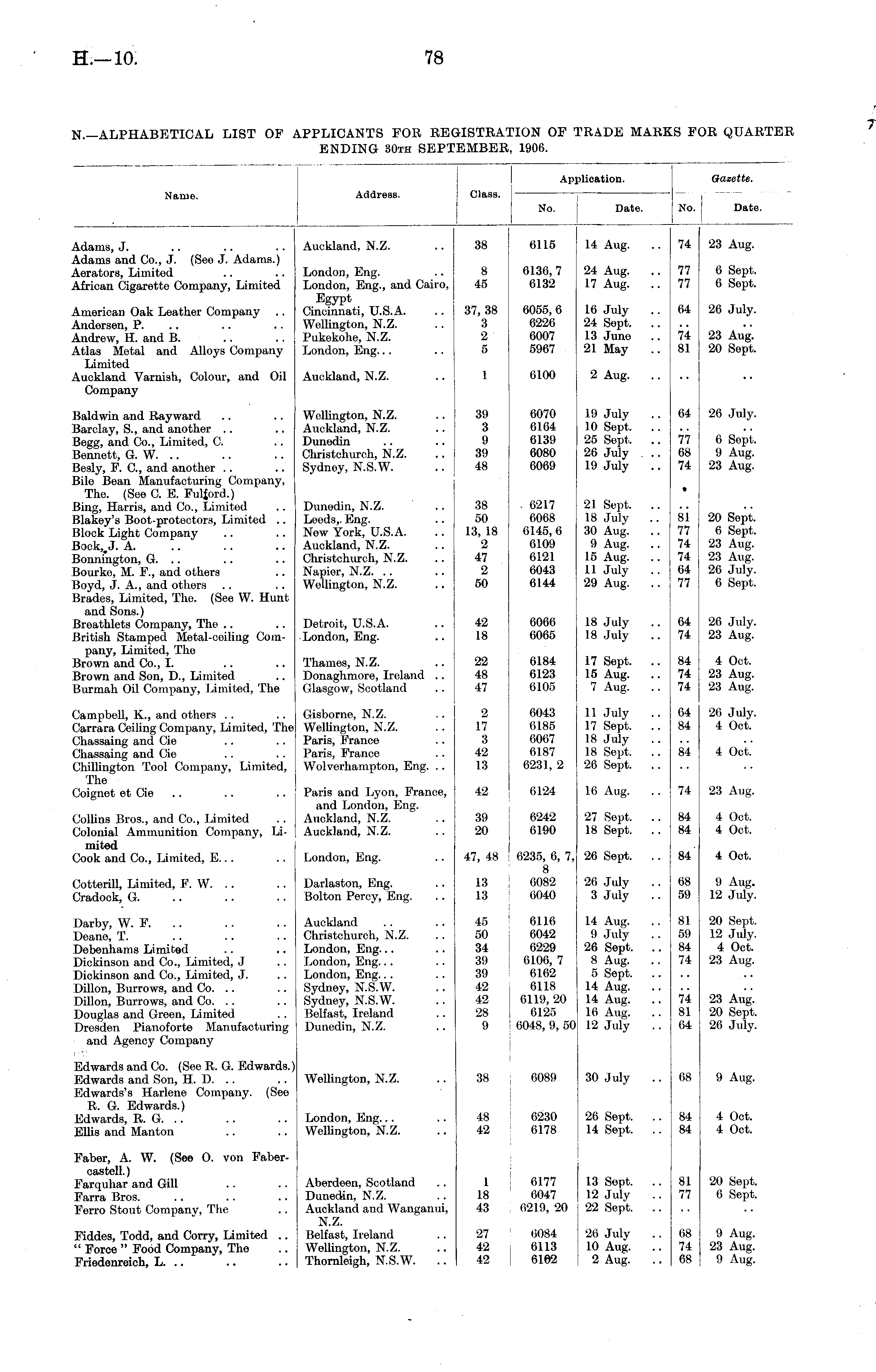 N.—ALPHABETICAL LIST OF APPLICANTS FOR REGISTRATION OF TRADE MARKS FOR QUARTER ENDING 30th SEPTEMBER, 1906.