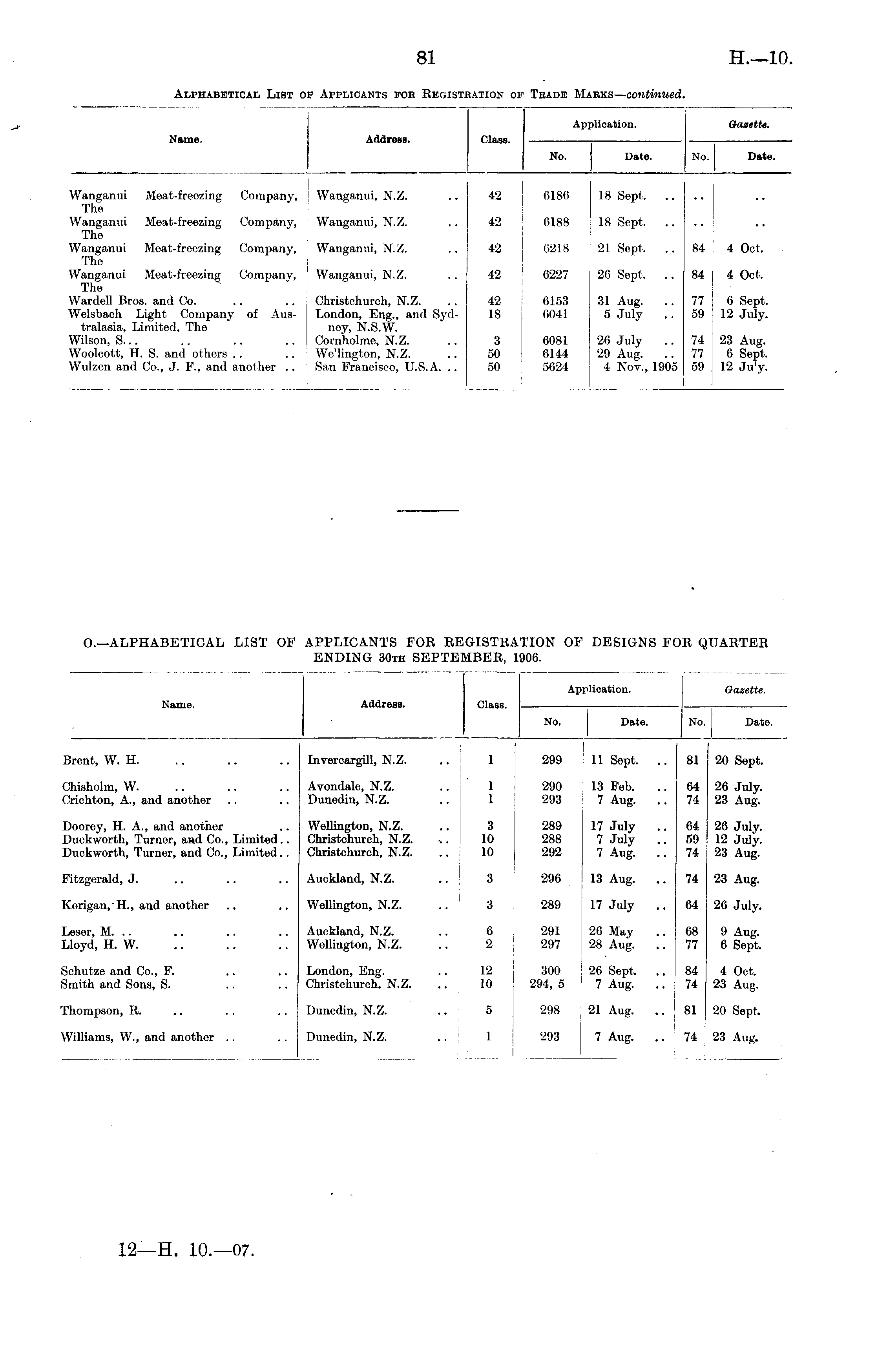 O.—ALPHABETICAL LIST OF APPLICANTS FOR REGISTRATION OF DESIGNS FOR QUARTER ENDING 30th SEPTEMBER, 1906.