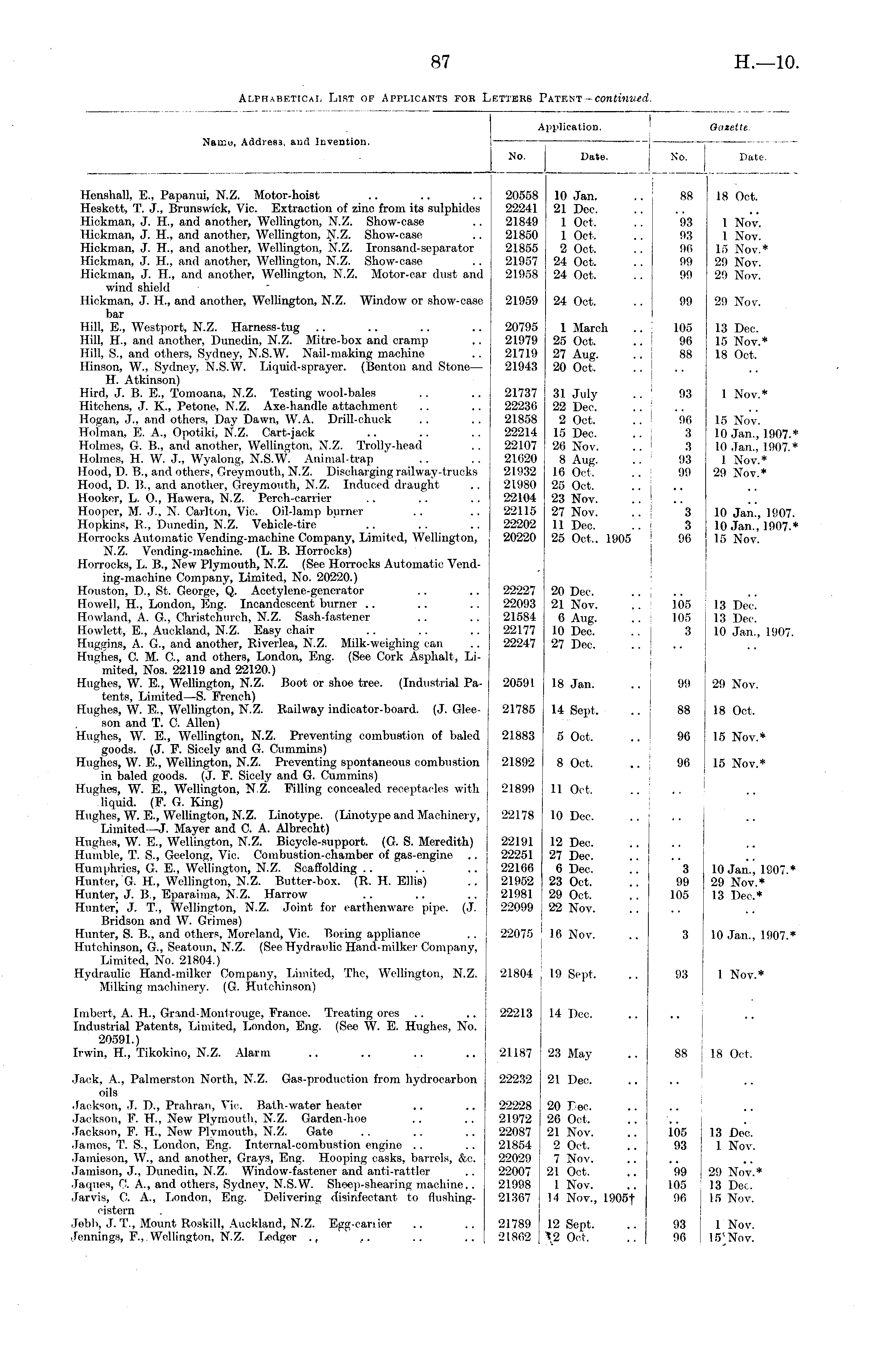 PPl lica .ion. \tze Siffiu, Address, and Invention. No. Date. I No. Date. Henshall, E., Papanui, N.Z. Motor-hoist Heskett, T. J., Brunswick, Vic. Extraction of zinc from its sulphides Hickman, J. H., and another, Wellington, N.Z. Show-case Hickman, J. H., and another, Wellington, N.Z. Show-case Hickman, J. H., and another, Wellington, N.Z. Ironsand-separator Hickman, J. H., and another, Wellington, N.Z. Show-case Hickman, J. H., and another, Wellington, N.Z. Motor-car dust and wind shield Hickman, J. H., and another, Wellington, N.Z. Window or show-case bar Hill, E., Westport, N.Z. Harness-tug .. Hill, H., and another, Dunedin, N.Z. Mitre-box and cramp Hill, S., and others, Sydney, N.S.W. Nail-making machine Hinson, W., Sydney, N.S.W. Liquid-sprayer. (Benton and Stone— H. Atkinson) FTird, J. B. E., Tomoana, N.Z. Testing wool-bales Hitchens, J. K., Petone, N.Z. Axe-handle attachment Hogan, J., and others. Day Dawn, W.A. Drill-chuck Holman, E. A., Opotiki, N.Z. Cart-jack Holmes, G. B., and another, Wellington, X.Z. Trollv-head Holmes, H. W. J., Wyalong, N.S.W. Animal-trap Hood, D. B., and others, Greymouth, N.Z. Discharging railway-trucks Hood, D. B., and another, Greymouth, N.Z. Induced draught Hooker, L. O., Hawera, N.Z. Perch-carrier Hooper, M. J., N. Carlton, Vic. Oil-lamp burner Hopkins, R., Dunedin, N.Z. Vehicle-tire Horrocka Automatic Vending-machine Company, Limited, Wellington, N.Z. Vending-machine. (L. B. Horrocks) Horrocks, L. B., New Plymouth, N.Z. (See Horrocks Automatic Vend-ing-machine Company, Limited, No. 20220.) Houston, D., St. George, Q. Acetylene-generator Howell, H., London, Eng. Incandescent burner I lowland, A. G., Christchureh, N.Z. Sash-fastener Hewlett, E., Auckland, N.Z. Easy chair Muggins, A. G., and another, Riverlea, N.Z. Milk-weighing can Hughes, C. M. C, and others, London, Eng. (See Cork Asphalt, Limited, Nos. 22119 and 22120.) Hughes, W. E., Wellington, N.Z. Boot or shoe tree. (Industrial Patents, Limited—S. French) Hughes, W. E., Wellington, N.Z. Railway indicator-board. (J. Gleeson and T. C. Allen) Hughes, W. E., Wellington, N.Z. Preventing combustion of baled goods. (J. F. Sicely and G. Cummins) Hughes, W. E., Wellington, N.Z. Preventing spontaneous combustion in baled goods. (j. F. Sicely and G. Cummins) Hughes, W. E., Wellington, N.Z. Filling concealed receptacles with liquid. (F. G. King) Hughes, W. E., Wellington, N.Z. Linotype. (Linotype and Machinery, Limited— J. Mayer and C. A. Albrecht) Hughes, W. E., Wellington, N.Z. Bicycle-support. (G. S. Meredith) Humble, T. S., Geelong, Vic. Combustion-chamber of gas-engine Humphries, G. E., Wellington, N.Z. Scaffolding Hunter, G. H., Wellington, N.Z. Butter-box. (R. H. Ellis) Hunter, J. B., Eparaima, N.Z. Harrow Hunterj J. T., Wellington, N.Z. Joint for earthenware pipe. (J. Bridson and W. Grimes) Hunter, S. B., and others, Moreland, Vic. Boring appliance Hutehinson, G., Seatoun, N.Z. (See Hydraulic Hand-milker Company, Limited, No. 21804.) Hydraulic Hand-milker Company, Limited, The, Wellington, N.Z. Milking machinery. (G. Hutehinson) 20558 22241 21849 21850 21855 21957 21958 10 Jan. 21 Dec. 1 Oct. 1 Oct. 2 Oct. 24 Oct. 24 Oct. 88 18 Oct. 93 93 96 99 99 1 Nov. 1 Nov. 15 Nov.* 29 Nov. 20 Nov. 21959 24 Oct. 99 2!) Nov. 20795 21979 21719 21943 1 March 25 Oel. 27 Aug. 20 Oct. 105 96 88 13 Dec. 15 Nov.* 18 Oct. 21737 22230 21858 22214 22107 21020 21932 21980 22104 22115 22202 20220 31 July 22 Dec. 2 Oct. 15 Dec. 26 Nov. 8 Aug. 1C. Oct. 25 Oct. 23 Nov. 27 Nov. 11 Deo. 25 Oct.. 1905 93 96 3 3 93 99 1 Nov.* 15 Nov. 10 Jan., 1907.* 10 Jan., 1907.* 1 Xov.* ■2!) Nov.* 3 3 96 10 Jan., l!!07. 10 Jan., 1907.* 15 Nov. 22227 22093 21584 22177 22247 20 Dee. 21 Nov. 6 Aug. 10 Dec. 27 Dec. 100 105 3 13 Dec. 13 Dee. 10 Jan., 1907. 20591 18 Jan. 09 29 Nov. 21785 14 Sept. 88 18 Oct. 21883 5 Oct. 9G 15 Nov.* 21892 8 Oct. 90 15 Nov.* 21899 11 Oct. 22178 10 Dec. 22191 22251 ■2216(5 21952 21981 •22099 12 Dec. 27 Dec. 6 Dec. 23 Oct. 29 Oct. 22 Nov. 3 99 105 10 Jan., 1007.* 29 Nov.* 13 Dec* 22075 16 Nov. 3 10 Jan., 1907.* 21804 I!) Sept, ins 1 Nov.* Imbert, A. H., Grand-Montrouge, France. Treating ores Industrial Patents, Limited, London, Eng. (See W. E. Hughes, No. 20591.) Irwin, H., Tikokino, N.Z. Alarm 22213 14 Dec. 21187 23 May 88 18 Oct. Jack. A., Piilmerston North, N.Z. Gas-production from hydrocarbon oils Jackson, J. D., Prahran, Vic Bath-water heater Jackson, F. H., New Plymouth. N.Z. Garden-hoe Jackson, F. H.. New Plymouth, N.Z. Gate James, T. S., London, Eng. Internal-combustion engine Jamieson, W., and another, Grays, Eng. Hooping casks, barrels, &c. Jamison, J., Dunedin, N.Z. Window-fastener and anti-rattler Jaques, 0. A., and others, Sydney. N.S.W. Shoep-shearing machine.. Jarvis, C A., London, Eng. Delivering disinfectant to flushingcistern Jebb, J. T., Mount Roskill, Auckland, N.Z. Egg-canier Jennings, F., Wellington, N.Z. Ledger ., 22232 22228 21972 22087 21854 22029 22007 21998 21367 21 Dec. 20 Tec. 26 Oct. 21 Nov. 2 Oct. 7 Nov. 21 Oct. 1 Nov. 14 Nov., 1905f io5 93 13 Dec. 1 Nov. (in 105 96 29 Nov.* 13 Dec. 15 Nov. 21789 ! 21862 12 Sept. \2 Oct. 93 00 1 Nov. 15*Nov.