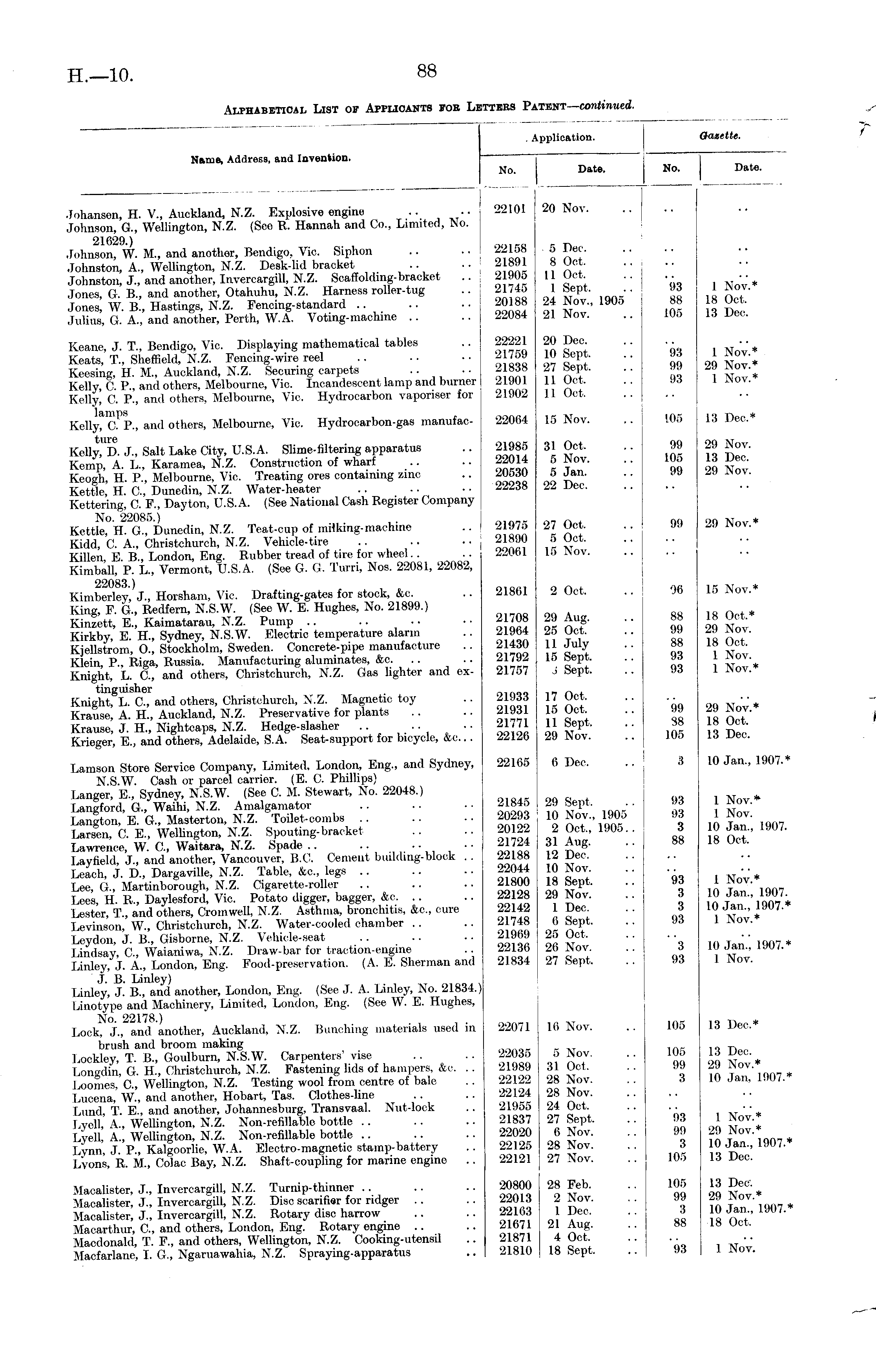 Application. Gazette. Name, Address, and Invention. No. Date. No. Date. Johansen, H. V., Auckland, N.Z. Explosive engine .. Johnson, G., Wellington, N.Z. (See R. Hannah and Co., Limited, No. 21629.) .Johnson, W. M., and another, Bendigo, Vic. Siphon .. Johnston, A., Wellington, N.Z. Desk-lid bracket Johnston, J., and another, Invercargill, N.Z. Scaffolding-bracket .. Jones, G. B., and another, Otahuhu, N.Z. Harness roller-tug .. j Jones, W. B., Hastings, N.Z. Fencing-standard Julius, G. A., and another, Perth, W.A. Voting-machine 22101 20 Nov. 22158 21891 21905 21745 20188 22084 8 Dec. 8 Oct. 11 Oct. 1 Sept, 24 Nov., 1905 21 Nov. 93 88 105 L Nov.* 18 Oct. 13 Dec. Keane, J. T., Bendigo, Vic. Displaying mathematical tables Keats, T., Sheffield, N.Z. Fencing-wire reel Keesing, H. M., Auckland, N.Z. Securing carpets Kelly, C. P., and others, Melbourne, Vie. Incandescent lamp and burner Kelly, C. P., and others, Melbourne, Vic. Hydrocarbon vaporiser for lamps Kelly, C. P., and others, Melbourne, Vic. Hydrocarbon-gas manufacture Kelly, D. J., Salt Lake City, U.S.A. Slime-filtering apparatus Kemp, A. L., Karamea, N.Z. Construction of wharf Keogh, H. P., Melbourne, Vic. Treating ores containing zinc Kettle, H. C, Dunedin, N.Z. Water-heater Kettering, C. F., Dayton, U.S.A. (See National Cash Register Company No. 22085.) Kettle, H. G., Dunedin, N.Z. Teat-cup of milking-machine Kidd, C. A., Christchurch, N.Z. Vehicle-tire .. •. Killen E B., London, Eng. Rubber tread of tire for wheel.. Kimball, P. L., Vermont, U.S.A. (See G. G. Turri, Nos. 22081, 22082, 22083.) Kimberley, J., Horsham, Vic. Drafting-gates for stock, &c. King, F. G., Redfern, N.S.W. (See W. E. Hughes, No. 21899.) Kinzett, E., Kaimatarau, N.Z. Pump Kirkby, E. H., Sydney, N.S.W. Electric temperature alarm Kjellstrom, O., Stockholm, Sweden. Concrete-pipe manufacture Klein, P., Riga, Russia. Manufacturing aluminates, &o. Knight, L. C, and others, Christchurch, N.Z. Gas lighter and extinguisher Knight, L. C, and others, Christchurch, N.Z. Magnetic toy Krause, A. H., Auckland, N.Z. Preservative for plants Krause, J. H., Nightcaps, N.Z. Hedge-slasher Krieger, E., and others, Adelaide, S.A. Seat-support for bicycle, &c... 22221 21759 21838 21901 21902 20 Dec. 10 Sept. 27 Sept. 11 Oct. 11 Oct. 93 99 03 1 Nov.* 29 Nov.* 1 Nov.* 22004 15 Nov. 105 13 Dec* 21985 22014 20530 22238 31 Oct. 5 Nov. 5 Jan. 22 Pec. 99 105 99 29 Nov. 13 Dec. 29 Nov. 21975 21890 22061 27 Oct. 5 Oct. 15 Nov. m 29 Nov.* 21801 2 Oct. 90 Iβ Nov.* 21708 21964 21430 21792 21757 29 Aug. 25 Oct. 11 July 15 Sept. J Sept. 88 99 88 93 93 18 Oct.* 29 Nov. 18 Oct. 1 Nov. 1 Nov.* 21933 21931 21771 22126 17 Oct. 15 Oct. 11 Sept. 29 Nov. 99 88 105 29 Nov.* 18 Oct. 13 Dec. Lamson Store Service Company, Limited, London, Eng., and Sydney, N.S.W. Cash or parcel carrier. (E. C. Phillips) Langer, E., Sydney, N.S.W. (See C. M. Stewart, No. 22048.) Langford, G., Waihi, N.Z. Amalgamator Langton, E. G., Masterton, N.Z. Toilet-combs Larsen, C. E., Wellington, N.Z. Spouting-bracket Lawrence, W. C, Waitara, N.Z. Spade Layfield, J., and another, Vancouver, B.C. Cement building-block .. Leach, J. D., Dargaville, N.Z. Table, &c, legs Lee, G., Martinborough, N.Z. Cigarette-roller Lees, H. R., Daylesford, Vic. Potato digger, bagger, &o. Lester, T., and others, Cromwell, N.Z. Asthma, bronchitis, &.C., cure Levinson, W., Christchurch, N.Z. Water-cooled chamber Leydon, J. B., Gisborne, N.Z. Vehiote-seat Lindsay, C, Waianiwa, N.Z. Draw-bar for traction-engine Iinley, J. A., London, Eng. Food-preservation. (A. E. Sherman and J. B. Linley) Linley, J. B., and another, London, Eng. (See J. A. Linley, No. 21834.) Linotype and Machinery, Limited, London, Eng. (See W. E. Hughes, No. 22178.) Lock, J., and another, Auckland, X.Z. Bunching materials used in brush and broom making Lockley, T. B., Goulburn, N.S.W. Carpenters' vise Longdin, G. H., Christchurch, N.Z. Fastening lids of hampers, &c. . . Loonies, C, Wellington, N.Z. Testing wool from centre of bale Lucena, W., and another, Hobart, Tas. Clothes-line Lund, T. E., and another, Johannesburg, Transvaal. Nut-lock Lyell, A., Wellington, N.Z. Non-refillablo bottle Lyell, A., Wellington, N.Z. Non-refillable bottle .. Lvnn, J. P., Kalgoorlie, W.A. Electro-magnetic stamp-battery Lvons, R. M., Colac Bay, N.Z. Shaft-coupling for marine engine 22165 f> Dec. 3 10 Jan., 1907.* 21845 20293 20122 21724 22188 22044 21800 22128 22142 21748 21909 22136 21834 29 Sept. 10 Nov., 1905 2 Oct., 1905.. 31 Aug. 12 Dec. 10 Nov. 18 Sept. 29 Nov. 1 Dec. 6 Sept. 25 Oct. 20 Nov. 27 Sept. 93 03 3 88 1 Nov.* 1 Nov. 10 Jan., 1907. 18 Oct. 93 3 3 93 1 Nov.* 10 Jan., 1907. 10 Jan., 1907.* 1 Nov.* "3 93 10 Jan., 1907.* 1 Nov. Iβ Nov. 13 Dec* 22071 105 22035 21989 22122 22124 21955 ■21837 22020 ±2125 22121 5 Nov. 31 Oct. 28 Nov. 28 Nov. 24 Oct. 27 Sept. 6 Xov. 28 Nov. 27 Nov. 105 99 3 93 99 3 105 13 Dec. 29 Nov.* 10 Jan, 1907.* 1 Nov.* 29 Nov.* 10 Jan., 1907.* 13 Dec. Macalister, J., Invercargill, N.Z. Turnip-thinner Macalister, J., Invercargill, N.Z. Disc scarifier for ridger .. Macalister, J., Invercargill, N.Z. Rotary disc harrow _ Macarthur, C, and others, London, Eng. Rotary engine .Macdonald, T. F., and others, Wellington, N.Z. Cooking-utensil Macfarlane, I. G., Ngaruawahia, N.Z. Spraying-apparatus 20800 22013 22103 21071 21871 21810 28 Feb. 2 Nov. 1 Dec. 21 Aug. 4 Oct. 18 Sept. 105 99 3 88 13 Dec'. 29 Nov.* 10 Jan., 1907.* 18 Oct. 93 1 Nov.