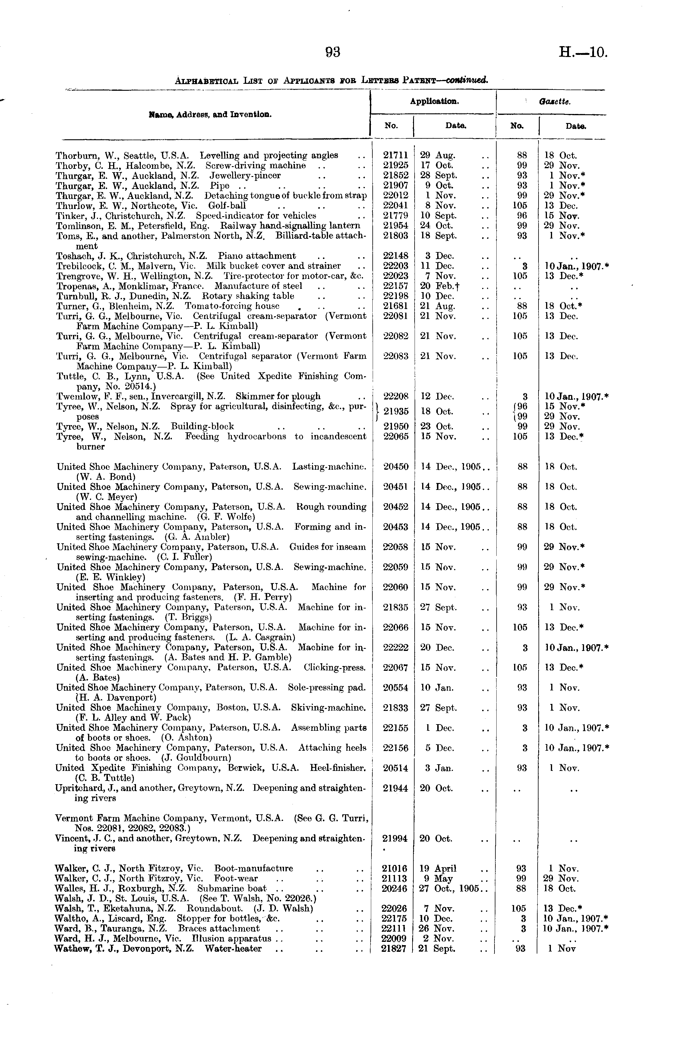 pp] ioal ion. t<. Name, Address, and Invention. No. Date. No. Date. Thorburn, W., Seattle, U.S.A. Levelling and projecting angles Thorby, C. H., Haleombe, N.Z. Screw-driving machine Thurgar, E. W., Auckland, N.Z. Jewellery-pincer Thurgar, E. W., Auckland, N.Z. Pipe Thurgar, E. W., Auckland, N.Z. Detaching tongue of buckle from strap Thurlow, E. W., Northcote, Vic. Golf-ball Tinker, J., Christchureh, N.Z. Spocd-indicator for vehicles Tomlinson, E. M., Petersfield, Eng. Railway hand-signalling lantern Toms, E., and another, Palmerston North, N.Z. Billiard-table attachment Toshach, J. K., Christchureh, N.Z. Piano attachment Trebiloock, C. M., Malvern, Vic. Milk bucket cover and strainer Trengrovc, W. H., Wellington, N.Z. Tire-protector for motor-car, &c. Tropenas, A., Monklimar, France. Manufacture of steel Turnbull, R. J., Dunedin, N.Z. Rotary shaking table Turner, G., Blenheim, N.Z. Tomato-forcing house ... Turri, G. G., Melbourne, Vic. Centrifugal cream-separator (Vermont Farm Machine Company—P. L. Kimball) Turri, G. G., Melbourne, Vic. Centrifugal cream-separator (Vermont Farm Machine Company—P. L. Kimball) Turri, G. G., Melbourne, Vic. Centrifugal separator (Vermont Farm Machine Compauy—P. L. Kimball) Tuttle, C. B., Lynn, U.S.A. (See United Xpedite Finishing Company, No. 20514.) Twemlow, F. F., sen., Invercargill, N.Z. Skimmer for plough Tyree, W., Nelson, N.Z. Spray for agricultural, disinfecting, &c, ptjrposes Tyree, W., Nelson, N.Z. Building-block Tyree, W., Nelson, N.Z. Feeding hydrocarbons to incandescent burner 21711 21925 21852 21907 22012 22041 21779 21954 21803 29 Aug. 17 Oct. 28 Sept. 9 Oct. 1 Nov. 8 Nov. 10 Sept. 24 Oct. 18 Sept. 88 99 93 93 99 105 96 99 93 18 Oct. 29 Nov. 1 Nov.* 1 Nov.* 29 Nov.* 13 Dec. 15 Nov. 29 Nov. 1 Nov.* 22148 22203 22023 22157 22198 21681 22081 3 Dec 11 Dec. 7 Nov. 20 Feb.f 10 Dec 21 Aug. 21 Nov. 3 105 10 Jan., 1907.* 13 Dec* 88 105 18 Oct.* 13 Dec. 22082 21 Nov. 105 13 Dec. 22083 21 Nov. 105 13 Dee. 22208 12 Dec. 3 (96 199 99 105 10 Jan., 1907.* 15 Nov.* 29 Nov. 29 Nov. 13 Dec* j 21935 18 Oct. 21950 22065 23 Oct. 15 Nov. United Shoe Machinery Company, Patcrson, U.S.A. Lasting-machine. (W. A. Bond) United Shoe Machinery Company, Paterson, U.S.A. Sewing-machine. (W. C. Meyer) United Shoe Machinery Company, Paterson, U.S.A. Hough rounding and channelling machine. (G. F. Wolfe) United Shoe Machinery Company, Paterson, U.S.A. Forming and inserting fastenings. (G. A. Ambler) United Shoe Machinery Company, Paterson, U.S.A. Guides for inseam sewing-machine. (C. I. Fuller) United Shoe Machinery Company, Paterson, U.S.A. Sewing-machine. (E. E. Wiukley) United Shoe Machinery Company, Paterson, U.S.A. Machine for inserting and producing fasteners. (F. H. Perry) United Shoe Machinery Company, Paterson, U.S.A. Machine for inserting fastenings. (T. Briggs) United Shoe Machinery Company, Paterson, U.S.A. Machine for inserting and producing fasteners. (L. A. Casgrain) United Shoe Machinery Company, Paterson, U.S.A. Machine for inserting fastenings. (A. Bates and H. P. Gamble) United Shoe Machinery Company, Paterson, U.S.A. Clicking-press. (A. Bates) United Shoe Machinery Company, Paterson, U.S.A. Sole-pressing pad. (H. A. Davenport) United Shoe Machineiy Company, Boston, U.S.A. Skiving-machine. (F. L. Alley and W. Pack) United Shoe Machinery Company, Paterson, U.S.A. Assembling parts of boots or shoes. (O. Ashton) United Shoe Machinery Company, Paterson, U.S.A. Attaching heels to boots or shoes. (J. Gouldbourn) United Xpedite Finishing Company, Berwick, U.S.A. Heel-finisher. (C. B. Tuttle) Upritchard, J., and another, Greytown, N.Z. Deepening and, straightening rivers 20450 14 Dec, 1905.. 88 18 Oct. •20451 14 Dec, 1905.. 88 18 Oct. 20452 14 Dec, 1905.. 88 18 Oct. 20453 14 Dec, 1905.. 88 18 Oel. 22058 15 Nov. 99 29 Nov.* 22059 15 Nov. 99 29 Nov.* 22060 15 Nov. 99 29 Nov.* 21835 27 Sept, 93 1 Nov. 22066 15 Nov. 105 13 Dec* 22222 20 Dec. 3 10 Jan., 1907.* 22067 15 Nov. 105 13 Dec* 20554 10 Jan. 93 1 Nov. 21833 27 Sept, 93 1 Nov. 22155 1 Dec 3 10 Jan., 1907.* 22156 5 Dec. 3 10 Jan., 1907.* 20514 3 Jan. 93 1 Nov. 21944 20 Oct. Vermont Farm Machine Company, Vermont, U.S.A. (See G. G. Turri. Nos. 22081, 22082, 22083.) Vincent, J. C, and another, Greytown, N.Z. Deepening and straightening rivere 20 Oct. 21994 Walker, C. J., North Fitzroy, Vic. Boot-manufacture Walker, C. J., North Fitzroy, Vic. Foot-wear Walles, H. J., Roxburgh, N.Z. Submarine boat Walsh, J. D., St. Louis, U.S.A. (See T. Walsh. No. 22026.) Walsh, T., Eketahuna, N.Z. Roundabout. (J. D. Walsh) Waltho, A., Liscard, Eng. Stopper for bottles, &c. Ward, B., Tauranga, N.Z. Braces attachment Ward, H. J., Melbourne, Vic. Illusion apparatus Wathew, T. J., Devonport, N.Z. Water-heater 21016 21113 20246 19 April 9 May 27 Oct., 1905.. 93 99 88 1 Nov. 29 Nov. 18 Oct. 22026 22175 22111 22009 21827 7 Nov. 10 Dec. 26 Nov. 2 Nov. 21 Sept. 105 3 3 13 Dec* 10 Jan., 1907.* 10 Jan., 1907.* 93 1 Nov