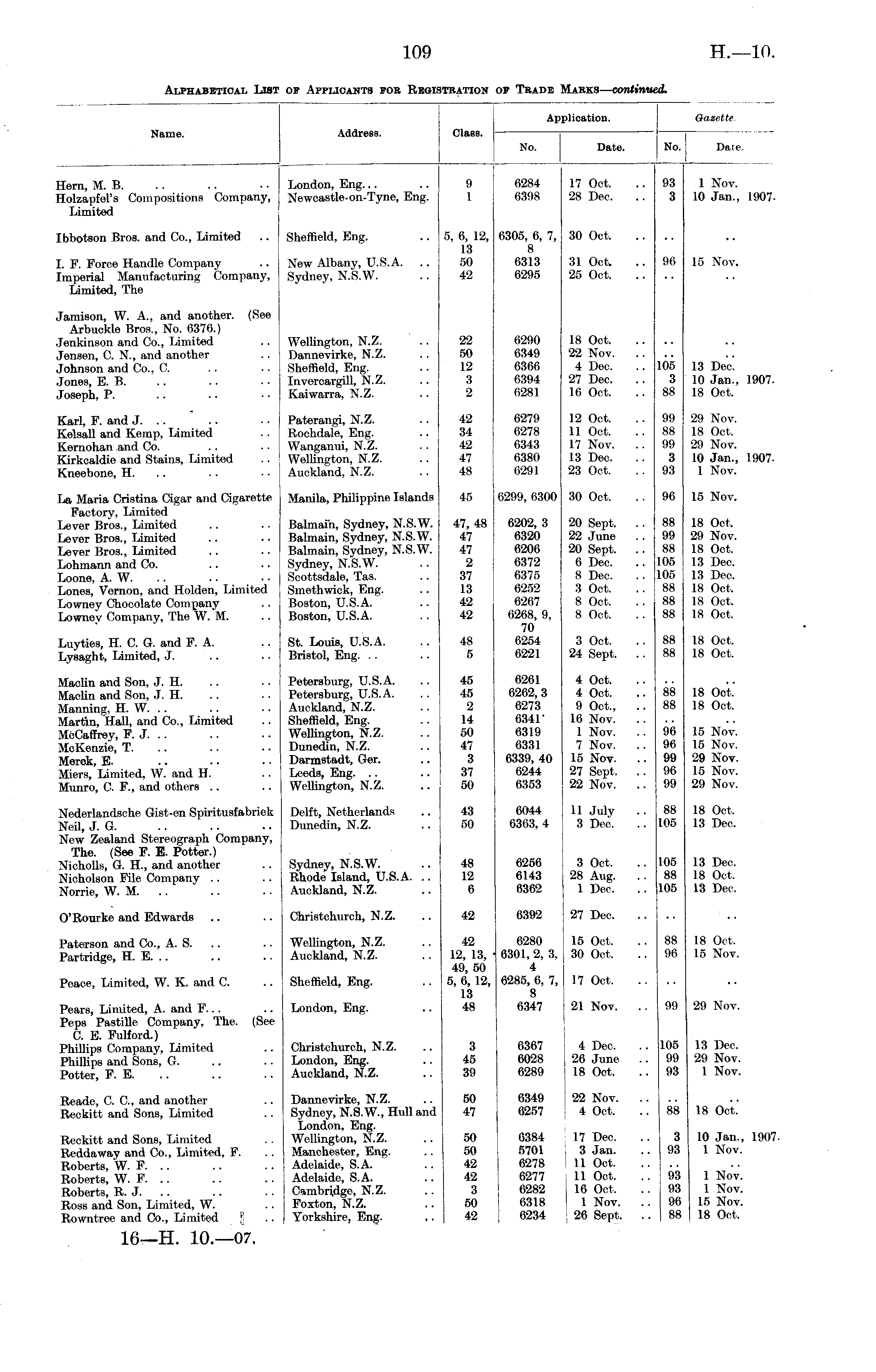 Application. Gazette Name. Address. Clans. No. Date. J No. Date. Hern, M. B. Holzapfel's Compositions Company, Limited London, Eng. Newcastle-on-Tyne, Eng. 9 1 6284 6398 17 Oct. 28 Dec. 93 8 1 Nov. 10 Jan., 1907. Ibbotson Bros, and Co., Limited Sheffield, Eng. 5, 6, 12, 13 50 42 6305, 6, 7, 8 6313 6295 30 Oct. I. F. Force Handle Company Imperial Manufacturing Company, Limited, The New Albany, U.S.A. .. Sydney, N.S.W. 31 Oct. 25 Oct. !Mi 15 Nov. Jamison, W. A., and another. (See Arbuekle Bros., No. 6376.) Jenkinson and Co., Limited Jensen, C. N., and another Johnson and Co., C. Jones, E. B. Joseph, P. Wellington, N.Z. Dannevirke, N.Z. Sheffield, Eng. Invercargill, N.Z. Kaiwarra, N.Z. 22 50 12 3 2 6290 6349 6366 6394 6281 18 Oct. 22 Nov. 4 Dec. 27 Dec. 16 Oct. 105 3 88 13 Dec. 10 Jan., 1907. 18 Oct. Karl, F. and J. .. Kelsall and Kemp, Limited Kernohan and Co. Kirkcaldie and Stains, Limited Kneebone, H. .. Paterangi, N.Z. Rochdale, Eng. Wanganui, N.Z. Wellington, N.Z. Auckland, N.Z. 42 34 42 47 48 627!) 6278 6343 6380 6291 12 Oct. 11 Oct. 17 Nov. 13 Dec. 23 Oct. 99 88 99 3 93 29 Nov. 18 Oct. 29 Nov. 10 Jan., 1907. 1 Nov. La Maria Cristina Cigar and Cigarette Factory, Limited Lever Bros., Limited Lever Bros., Limited Lever Bros., Limited Lohmann and Co. Loone, A. W. Lones, Vernon, and Holden, Limited Lowney Chocolate Company Lowney Company, The W. M. Manila, Philippine Islands 45 6299, 6300 30 Oct. 96 15 Nov. Balmain, Sydney, N.S.W. Balmain, Sydney, N.S.W. Balmain, Sydney, N.S.W. Sydney, N.S.W. Scottsdale, Tas. Smethwick, Eng. Boston, U.S.A. Boston, U.S.A. 47, 48 47 47 2 37 13 42 42 6202, 3 6320 6206 6372 6375 6252 6267 6268, 9, 70 6254 6221 20 Sept. 22 June 20 Sept. 6 Dec. 8 Dec. 3 Oct. 8 Oct. 8 Oct. 88 99 88 105 105 88 88 88 18 Oct. 29 Nov. 18 Oct. 13 Dec. 13 Dec. 18 Oct. 18 Oct. 18 Oct. Luyties, H. C. G. and F. A. Lysaght, Limited, J. St. Louis, U.S.A. Bristol, Eng. 48 5 3 Oct. 24 Sept. 88 88 18 Oct. 18 Oct. Maclin and Son, J. H. Maclin and Son, J. H. Manning, H. W. .. Martin, Hall, and Co., Limited McCaffrey, F. J. .. McKenzie, T. Merck, E. Miera, Limited, W. and H. Munro, C. F., and others .. Petersburg, U.S.A. Petersburg, U.S.A. Auckland, N.Z. Sheffield, Eng. Wellington, N.Z. Dunedin, N.Z. Darmstadt, Ger. Leeds, Eng. Wellington, N.Z. 45 45 2 14 50 47 3 37 50 6261 6262, 3 6273 6841 ■ 6319 6331 6339, 40 6244 6353 4 Oct. 4 Oct. 9 Oct., 16 Nov. 1 Nov. 7 Nov. 15 Nov. 27 Sept. 22 Nov. 88 88 96 96 99 96 99 18 Oct. 18 Oct. 15 Nov. 15 Nov. 29 Nov. 15 Nov. 29 Nov. Nederlandsche Gist-en Spiritusfabriek Neil, J. G. New Zealand Stereograph Company, The. (See F. E. Potter.) Nieholls, G. H., and another Nicholson File Company Norrie, W. M. .. Delft, Netherlands Dunedin, N.Z. 43 50 6044 6363, 4 11 July 3 Dec. 88 105 18 Oct. 13 Dec. Sydney, N.S.W. Rhode Island, U.S.A. .. Auckland, N.Z. 48 12 6 6256 6143 6362 3 Oct. 28 Aug. 1 Dec. 105 88 105 13 Dec. 18 Oct. 13 Dec. O'Rourke and Edwards Christchurch, N.Z. 42 6392 27 Dec. Paterson and Co., A. S. Partridge, H. E. .. Wellington, N.Z. Auckland, N.Z. 42 12, 13, 49, 50 5, 6, 12, 13 48 6280 6301, 2, 3, 4 6285, 6, 7, 8 6347 15 Oct. 30 Oct. 88 98 18 Oft. 15 Nov. Peace, Limited, W. K. and C. Sheffield, Eng. 17 Oct. Pears, Limited, A. and F... Peps Pastille Company, The. (See C. E. Fulford.) Phillips Company, Limited Phillips and Sons, G. Potter, F. E. London, Eng. 21 Nov. 99 29 Nov. Christchurch, N.Z. London, Eng. Auckland, N.Z. 3 45 39 6367 6028 6289 4 Dec. 26 June 18 Oct. 105 99 93 13 Dec. 29 Nov. 1 Nov. Beade, C. C, and another Reckitt and Sons, Limited Dannevirke, N.Z. Sydney, N.S.W., Hull and London, Eng. Wellington, N.Z. Manchester, Eng. Adelaide, S.A. Adelaide, S.A. Cambridge, N.Z. Foxton, N.Z. Yorkshire, Eng. 50 47 6349 6257 22 Nov. 4 Oct. 88 18 Oct.' Reckitt and Sons, Limited Reddaway and Co., Limited, F. Roberts, W. F. .. Roberts, W. F. .. Roberts, R. J. Ross and Son, Limited, W. Rowntree and Co., Limited g 16—H. 10.—07. 50 50 42 42 3 50 42 6384 5701 6278 6277 6282 6318 6234 17 Dec. 3 Jan. 11 Oct. 11 Oct. 16 Oct. 1 Nov. 26 Sept. 3 93 93 93 96 88 10 Jan., 1907 1 Nov. 1 Nov. 1 Nov. 15 Nov. 18 Oct.