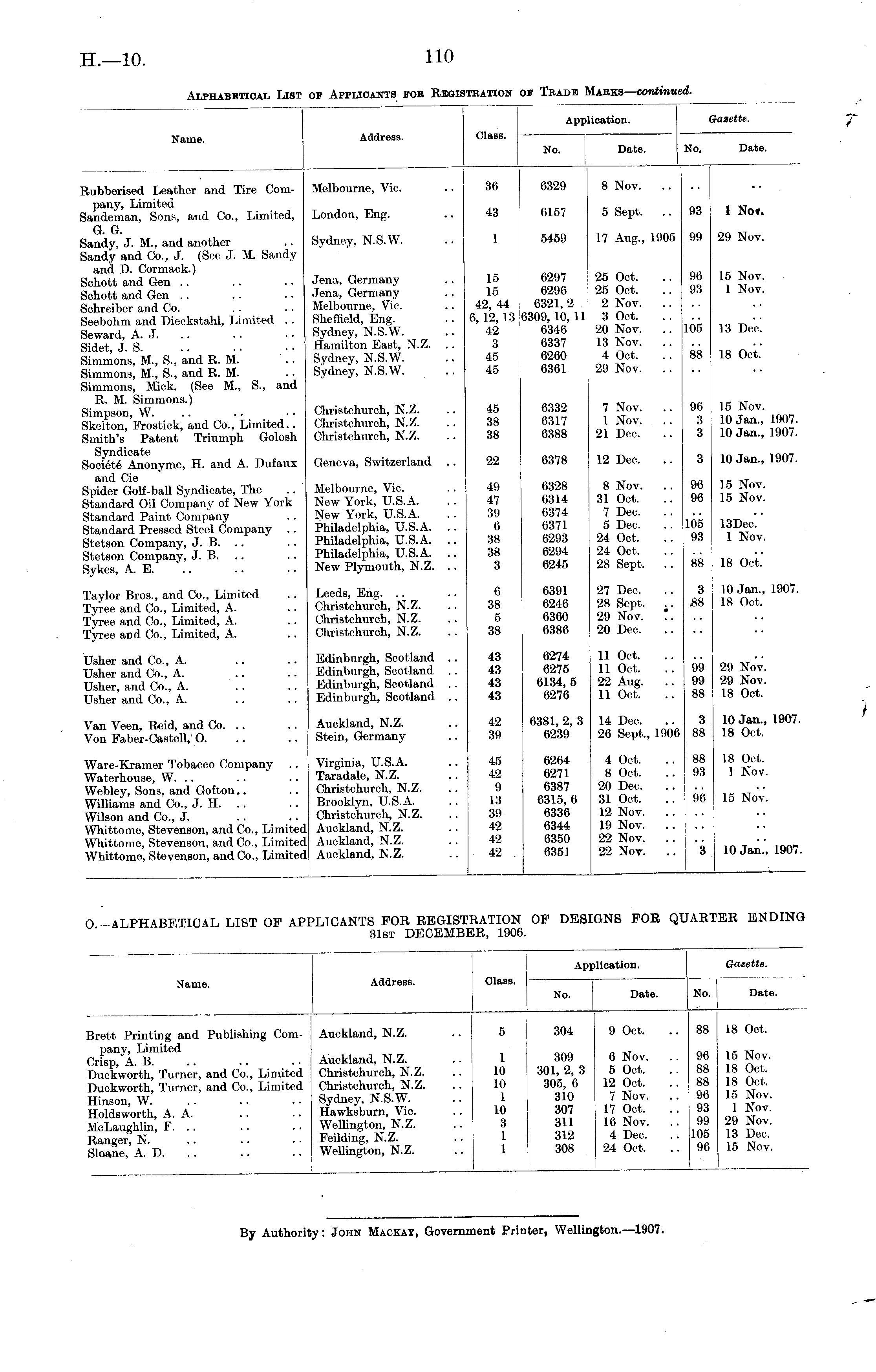 Name. Address. Class. — A No. Application. Lpp No. Gazette. Date. Date. Brett Printing and Publishing Company, Limited Crisp, A. B. Duckworth, Turner, and Co., Limited Duckworth, Turner, and Co., Limited Hinson, W. Holdsworth, A. A. McLaughlin, F. .. Ranger, N. Sloane, A. D. Auckland, N.Z. 5 1 10 10 1 10 3 1 1 304 309 , 301, 2, 3 305, 0 310 307 311 312 308 9 Oct. 88 18 Oct. Auckland, N.Z. Christchurch, N.Z. Christchurch, N.Z. Sydney, N.S.W. Hawksburn, Vic. Wellington, N.Z. Feilding, N.Z. Wellington, N.Z. 6 Nov. 5 Oct. 12 Oct. 7 Nov. 17 Oct. 16 Nov. 4 Dec. 24 Oct. 96 88 88 96 93 99 105 96 15 Nov. 18 Oct. 18 Oct. 15 Nov. 1 Nov. 29 Nov. 13 Dec. 15 Nov.