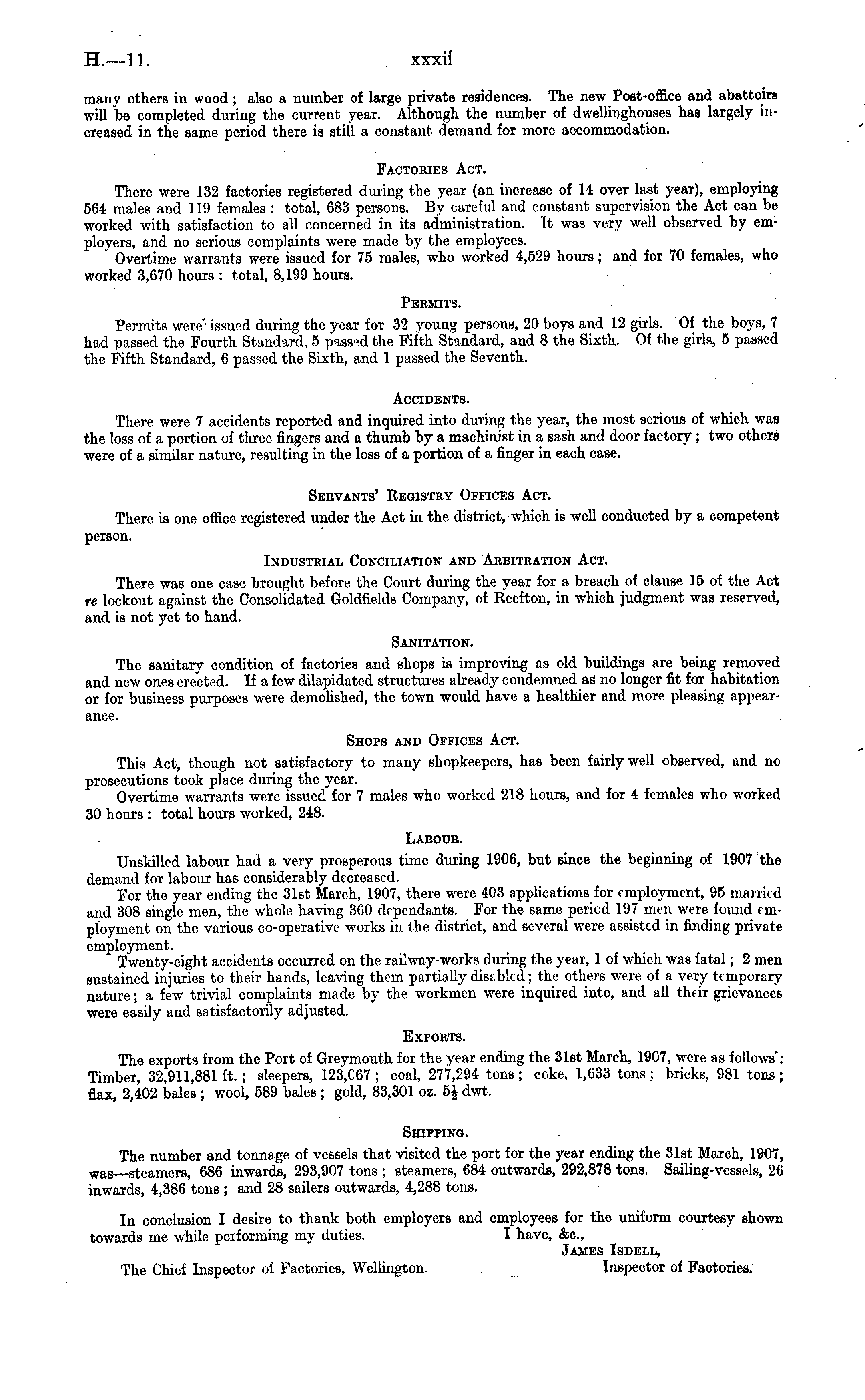 many others in wood ; also a number of large private residences. The new Post-office and abattoirs will be completed during the current year. Although the number of dwellinghouses has largely increased in the same period there is still a constant demand for more accommodation. Factories Act. There were 132 factories registered during the year (an increase of 14 over last year), employing 564 males and 119 females : total, 683 persons. By careful and constant supervision the Act can be worked with satisfaction to all concerned in its administration. It was very well observed by employers, and no serious complaints were made by the employees. Overtime warrants were issued for 75 males, who worked 4,529 hours; and for 70 females, who worked 3,670 hours : total, 8,199 hours. Permits. Permits were" issued during the year for 32 young persons, 20 boys and 12 girls. Of the boys, 7 had passed the Fourth Standard, 5 passed the Fifth Standard, and 8 the Sixth. Of the girls, 5 passed the Fifth Standard, 6 passed the Sixth, and 1 passed the Seventh. Accidents. There were 7 accidents reported and inquired into during the year, the most serious of which was the loss of a portion of three fingers and a thumb by a machinist in a sash and door factory ; two others were of a similar nature, resulting in the loss of a portion of a finger in each case. Servants' Registry Offices Act. There is one office registered under the Act in the district, which is well conducted by a competent person. Industrial Conciliation and Arbitration Act. There was one case brought before the Court during the year for a breach of clause 15 of the Act re lockout against the Consolidated Goldfields Company, of Reefton, in which judgment was reserved, and is not yet to hand. Sanitation. The sanitary condition of factories and shops is improving as old buildings are being removed and new ones erected. If a few dilapidated structures already condemned as no longer fit for habitation or for business purposes were demolished, the town would have a healthier and more pleasing appearance. Shops and Offices Act. This Act, though not satisfactory to many shopkeepers, has been fairly well observed, and no prosecutions took place during the year. Overtime warrants were issued for 7 males who worked 218 hours, and for 4 females who worked 30 hours : total hours worked, 248. Labour. Unskilled labour had a very prosperous time during 1906, but since the beginning of 1907 the demand for labour has considerably decreased. For the year ending the 31st March, 1907, there were 403 applications for employment, 95 married and 308 single men, the whole having 360 dependants. For the same period 197 men were found employment on the various co-operative works in the district, and several were assisted in finding private employment. Twenty-eight accidents occurred on the railway-works during the year, lof which was fatal; 2 men sustained injuries to their hands, leaving them partially disabled; the ethers were of a very temporary nature; a few trivial complaints made by the workmen were inquired into, and all their grievances were easily and satisfactorily adjusted. Exports. The exports from the Port of Greymouth for the year ending the 31st March, 1907, were as follows": Timber, 32,911,881 ft.; sleepers, 123,C67 ; coal, 277,294 tons ; coke, 1,633 tons ; bricks, 981 tons ; flax, 2,402 bales ; wool, 589 bales ; gold, 83,301 oz. 5 j dwt. Shipping. The number and tonnage of vessels that visited the port for the year ending the 31st March, 1907, was—steamers, 686 inwards, 293,907 tons ; steamers, 684 outwards, 292,878 tons. Sailing-vessels, 26 inwards, 4,386 tons ; and 28 sailers outwards, 4,288 tons. In conclusion I desire to thank both employers and employees for the uniform courtesy shown towards me while performing my duties. I have, &c, James Isdell, The Chief Inspector of Factories, Wellington. Inspector of Factories.
