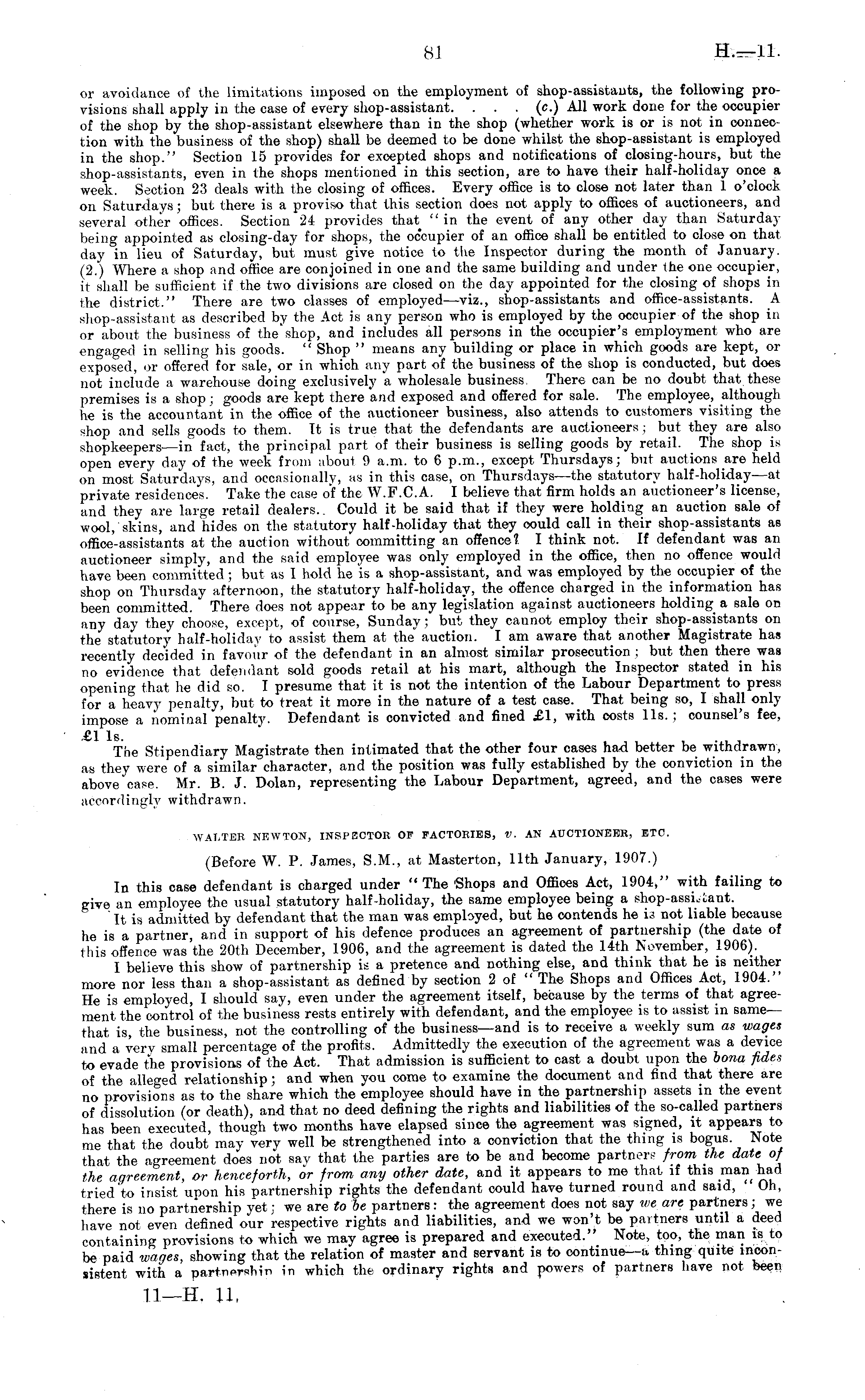 or avoidance of the limitations imposed on the employment of shop-assistants, the following provisions shall apply in the case of every shop-assistant. . . . (c.) All work done for the occupier of the shop by the shop-assistant elsewhere than in the shop (whether work is or is not in connection with the business of the shop) shall be deemed to be done whilst the shop-assistant is employed in the shop." Section 15 provides for excepted shops and notifications of closing-hours, but the shop-assistants, even in the shops mentioned in this section, are to have their half-holiday once a week. Section 23 deals with the closing of offices. Every office is to close not later than 1 o'clock on Saturdays; but there is a proviso that this section does not apply to offices of auctioneers, and several other offices. Section 24 provides that "in the event of any other day than Saturday being appointed as closing-day for shops, the occupier of an office shall be entitled to close on that day in lieu of Saturday, but must give notice to the Inspector during the month of January. (2.) Where a shop and office are conjoined in one and the same building and under the one occupier, it shall be sufficient if the two divisions are closed on the day appointed for the closing of shops in the district." There are two classes of employed —viz., shop-assistants and office-assistants. A shop-assistant as described by the Act is any person who is employed by the occupier of the shop in or about the business of the'shop, and includes all persons in the occupier's employment who are engaged in selling his goods. " Shop " means any building or place in which goods are kept, or exposed, or offered for sale, or in which any part of the business of the shop is conducted, but does not include a warehouse doing exclusively "a wholesale business There can be no doubt that these premises is a shop; goods are kept there and exposed and offered for sale. The employee, although he is the accountant in the office of the auctioneer business, also attends to customers visiting the shop and sells goods to them. It is true that the defendants are auctioneers ; but they are also shopkeepers —in fact, the principal part of their business is selling goods by retail. The shop is open every day of the week from about 9 a.m. to 6 p.m., except Thursdays; but auctions are held on most Saturdays, and occasionally, as in this case, on Thursdays—the statutory half-holiday —at private residence's. Take the case of the W.F.C.A. I believe that firm holds an auctioneer's license, and they are large retail dealers. Could it be said that if they were holding an auction sale of wool, skins, and hides on the statutory half-holiday that they could call in their shop-assistants as office-assistants at the auction without committing an offence? I think not. If defendant was an auctioneer simply, and the said employee was only employed in the office, then no offence would have been committed; but as I hold he is a shop-assistant, and was employed by the occupier of the shop on Thursday afternoon, the statutory half-holiday, the offence charged in the information has been committed. There does not appear to be any legislation against auctioneers holding a sale on any day they choose, except, of course, Sunday; but they cannot employ their shop-assistants on the statutory half-holiday to assist them at the" auction. I am aware that another Magistrate has recently decided in favour of the defendant in an almost similar prosecution ; but then there was no evidence that defendant sold goods retail at his mart, although the Inspector stated in his opening that he did so. I presume that it is not the intention of the Labour Department to press for a heavy penalty, but to treat it more in the nature of a test case. That being so, I shall only impose a nominal penalty. Defendant is convicted and fined £1, with costs lis. ; counsel's fee, £1 Is. The Stipendiary Magistrate then intimated that the other four cases had better be withdrawn, as they were of a similar character, and the position was fully established by the conviction in the above case. Mr. B. J. Dolan, representing the Labour Department, agreed, and the cases were accordingly withdrawn. WALTER NEWTON, INSPECTOR OF FACTORIES, V. AN AUCTIONEER, ETC. (Before W. P. James, S.M., at Masterton, llth January, 1907.) In this case defendant is charged under " The 'Shops and Offices Act, 1904," with failing to give an employee the usual statutory half-holiday, the same employee being a shop-assh.ant. 'It is admitted by defendant that the man was employed, but he contends he is not liable because he is a partner, and in support of his defence produces an agreement of partnership (the date of this offence was the 20th December, 1906, and the agreement is dated the 14th November, 1906). I believe this show of partnership is a pretence and nothing else, and think that he is neither more nor less than a shop-assistant as defined by section 2 of " The Shops and Offices Act, 1904." He is employed, I should say, even under the agreement itself, because by the terms of that agreement the control of the business rests entirely with defendant, and the employee is to assist in same— that is, the business, not the controlling of the business—and is to receive a weekly sum as wages and a very small percentage of the profits. Admittedly the execution of the agreement was a device to evade the provisions of the Act. That admission is sufficient to cast a doubt upon the bona fides of the alleged relationship; and when you come to examine the document and find that there are no provisions as to the share which the employee should have in the partnership assets in the event of dissolution (or death), and that no deed defining the rights and liabilities of the so-called partners has been executed, though two months have elapsed since the agreement was signed, it appears to me that the doubt may very well be strengthened i