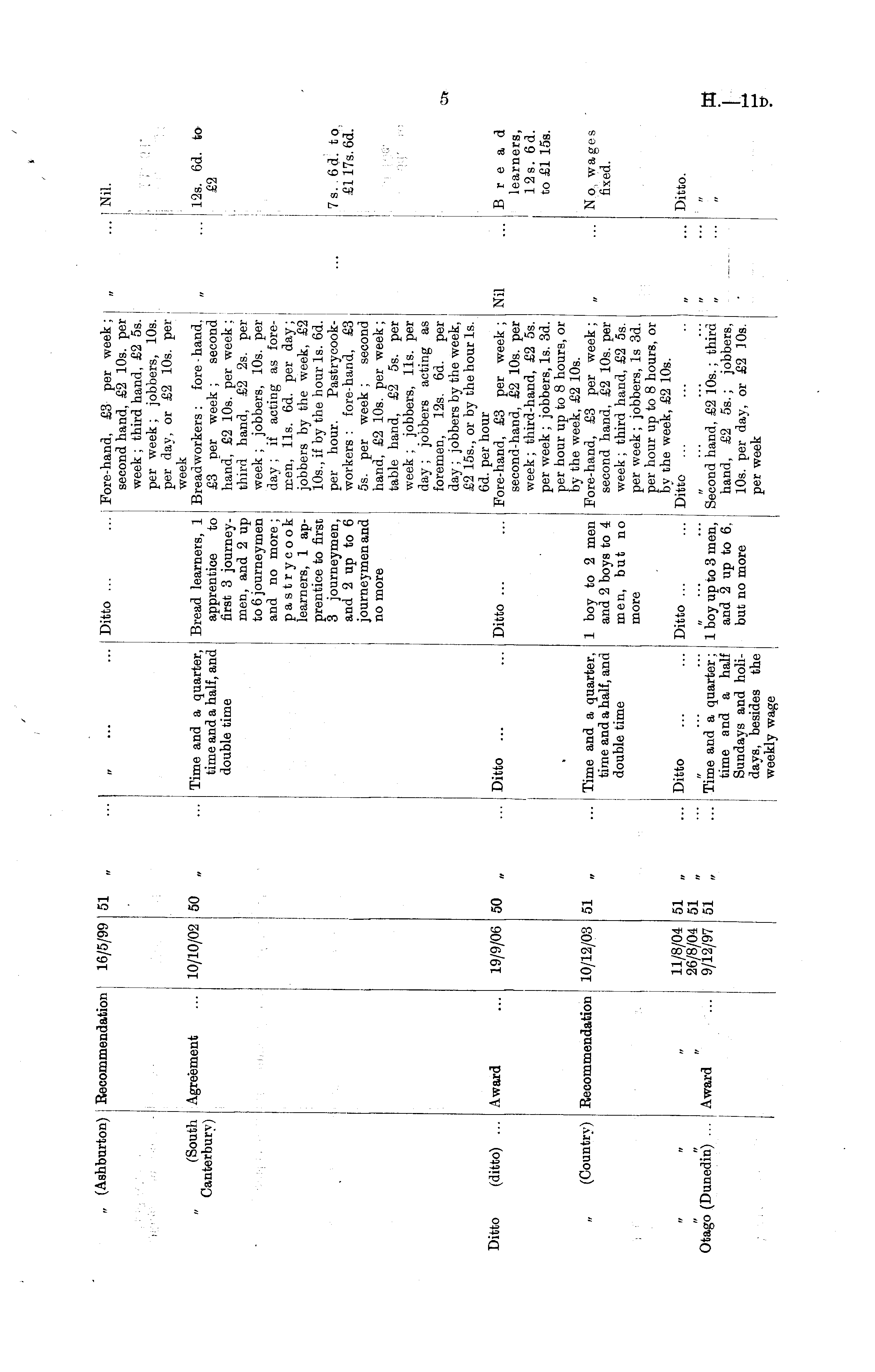 „ (Ashburton) Eecommendation 16/5/99 51 tt » ... Ditto ... Fore-hand, £3 per week; second hand, £2 10s. per week ; third hand, £2 5s. per week; jobbers, 10s. per day, or £2 10s. per week Bread workers : fore - hand. £3 per week ; second hand, £2 10s. per week ; third hand, £2 2s. per week ; jobbers, 10s. per day ; if acting as foremen, lis. 6d. per day; jobbers by the week, £2 10s., if by the hour Is. 6d. per hour. Pastrycookworkers : fore-hand, £3 5s. per week ; second hand, £2 10s. per week; table hand, £2 5s. per week ; jobbers, lis. per day; jobbers acting as foremen, 12s. 6d. per day ; jobbers by the week, £2 15s., or by the hour Is. 6d. per hour Fore-hand, £3 per week ; second-hand, £2 10s. per week; third-hand, £2 5s. per week ; jobbers, Is. 3d. per hour up to 8 hours, or by the week, £2 10s. Fore-hand, £3 per week; second hand, £2 10s. per week; third hand, £2 5s. per week; jobbers, Is 3d. per hour up to 8 hours, or by the week, £2 10s. Ditto ... It Nil. c Agreement Time and a quarter, time and a half, and double time Bread learners, 1 apprentice to first 3 journeymen, and 2 up to 6 journeymen and no more ; pastrycook learners, 1 apprentice to first 3 journeymen, and 2 up to 6 journeymen and no more : ; (South Canterbury) 10/10/02 50 It It 12s. 6d. fa £2 7s. 6d. to £117s. 6d. Ditto ... Ditto (ditto) ... iiwajd 19/9/06 50 tr Ditto ... Nil Bread learners, 12s. 6d. to £1 15s. ft (Country) Becommendation 51 tr Time and a quarter, time and a half, and double time 1 boy to 2 men and 2 boys to 4 men, but no N o wages fixed. 10/12/03 a 51 51 51 tt tt it more a tt Ditto Ditto ... Ditto. a tt itago (Dunedin) ... a 11/8/04 26/8/04 9/12/97 Time and a quarter: time and a half Sundays and holidays, besides the weekly wage 1 boy up to 3 men, and 2 up to 6. but no more Second hand, £2 10s.; third hand, £2 5s.; jobbers, 10s. per day, or £2 10s. per week it It Award tt a