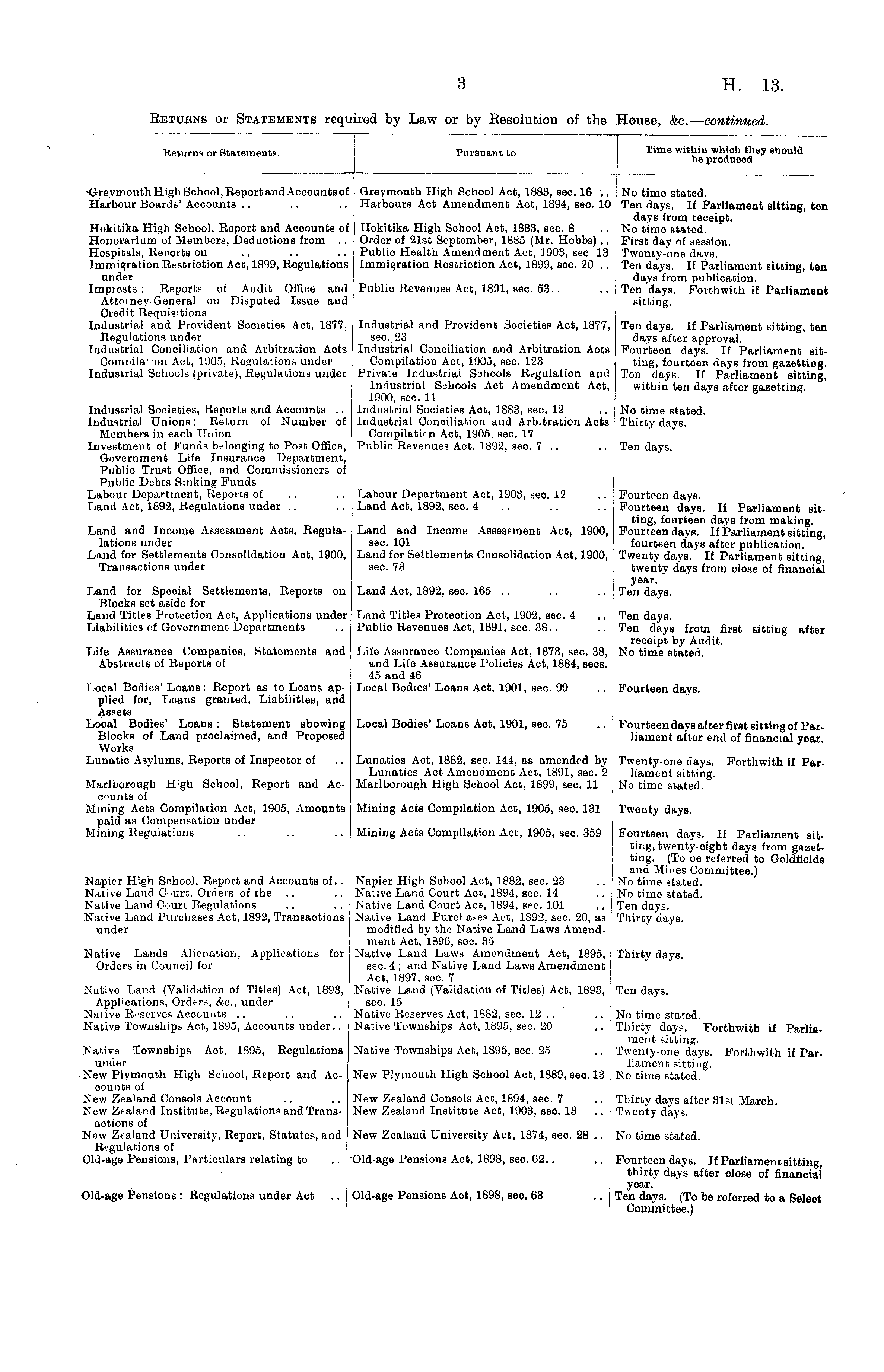 Returns or Statements. Pursuant to Time within which they ehonld be produced. <-rreymouth High School, Report and Acoountsof Greymouth High School Act, 1883, seo. 16 .. No time stated. Harbour Boards' Accounts .. .. .. Harbours Act Amendment Act, 1894, seo. 10 Ten days. If Parliament sitting, ten days from receipt. Hokitika High School, Report and Accounts of Hokitika High School Act, 1883, eeo. 8 .. No time stated. Honorarium of Members, Deductions from .. Order of 21st September, 1885 (Mr. Hobbs).. First day of session. Hospitals, Reports ou .. .. .. Publio Health Amendment Act, 1903, sec 13 Twenty-one days. Immigration Restriction Act, 1899, Regulations Immigration Restriction Act, 1899, sec. 20 .. Ten days. If Parliament sitting, ten under days from publication. Imprests: Reports of Audit Office and Publio Revenues Act, 1891, sec. 53.. .. Ten days. Forthwith if Parliament Attorney-General on Disputed Issue and sitting. Credit Requisitions Industrial and Provident Societies Act, 1877, Industrial and Provident Societies Act, 1877, Ten days. If Parliament sitting, ten Regulations under sec. 23 days after approval. Industrial Conciliation and Arbitration Acts Industrial Conciliation and Arbitration Acts Fourteen days. If Parliament sitCompilaHon Act, 1905, Regulations under Compilation Act, 1905, seo. 123 ting, fourteen days from gazetting. Industrial Schools (private), Regulations under Private Industrial Schools Regulation and Ten days. If Parliament sitting, Industrial Schools Act Amendment Act, within ten days after gazetting 1900, seo. 11 Industrial Societies, Reports and Acoounts .. Industrial Societies Aot, 1883, seo. 12 .. |No time stated. Industrial Unions: Return of Number of Industrial Conciliation and Arbitration Acts ! Thirty daye. Members in each Union Compilation Act, 1905. sec. 17 Investment of Funds belonging to Post Office, Public Revenues Act, 1892, seo. 7 .. .. : Ten days. Government Life Insurance Department, Public Trust Office, and Commissioners of Public Debts Sinking Funds Labour Department, Reports of .. .. Labour Department Act, 1903, seo. 12 .. Fourteen days. Land Act, 1892, Regulations under .. .. Land Act, 1892, sec. 4 .. .. .. Fourteen days. If Parliament sitting, fourteen days from making. Land and Income Assessment Acts, Regula- Land and Income Assessment Act, 1900, Fourteen days. If Parliament sitting, lations under sec. 101 fourteen days after publication. Land for Settlements Consolidation Aot, 1900, Land for Settlements Consolidation Act, 1900, Twenty days. If Parliament sitting, Transactions under sec. 73 twenty days from close of financial year. Land for Special Settlements, Reports on Land Act, 1892, sec. 165 .. .. .. Ten days. Blocks set aside for Land Titles Protection Act, Applications under Land Titles Protection Act, 1902, seo. 4 .. Ten days. Liabilities of Government Departments .. Publio Revenues Act, 1891, sec. 38.. .. Ten days from first sitting after receipt by Audit. Life Assurance Companies, Statements and Life Assurance Companies Act, 1873, sec. 38, iNo time stated. Abstracts of Reports of and Life Assurance Policies Act, 1884, sees. 45 and 46 Local Bodies' Loans: Report as to Loans ap- Local Bodies' Loans Act, 1901, seo. 99 .. Fourteen days. plied for, Loans granted, Liabilities, and Assets Local Bodies' Loans: Statement showing Local Bodies' Loans Act, 1901, sec. 75 .. j Fourteen days after first sitting of ParBlocks of Land proclaimed, and Proposed liament after end of finanoial year. Works Lunatic Asylums, Reports of Inspector of .. Lunatics Act, 1882, sec. 144, as amended by Twenty-one days. Forthwith if ParLunatics Act Amendment Act, 1891, seo. 2 liament sitting. Marlborough High School, Report and Ac- Marlborough High School Aot, 1899, sec. 11 j No time stated. counts of Mining Acts Compilation Act, 1905, Amounts Mining Acts Compilation Act, 1905, sec. 131 < Twenty days. paid as Compensation under Mining Regulations .. .. .. Mining Acts Compilation Act, 1905, sec. 359 Fourteen days. If Parliament sitting, twenty-eight days from gazetting. (To be referred to Goldheldfi and Mires Committee.) Napier High School, Report arid Accounts of.. Napier High School Act, 1882, sec. 23 .. INo time stated. Native Land Court, Orders of the .. .. Native Land Court Act, 1894, sec. 14 .. No time stated. Native Land Court Regulations .. .. Native Land Court Act, 1894, sec. 101 .. Ten days. Native Land Purchases Act, 1892, Transactions Native Land Purchases Act, 1892, seo. 20, as Thirty days. under modified by the Native Land Laws Amend- | ment Act, 1896, 6ec. 35 Native Lands Alienation, Applications for Native Land Laws Amendment Act, 1895, ; Thirty days. Orders in Council for sec. 4 ; and Native Land Laws Amendment Act, 1897, sec. 7 Native Land (Validation of Titles) Act, 1893, Native Land (Validation of Titles) Act, 1893, ! Ten days. Applications, Orders, &c, under sec. 15 Native Ri-serves Accounts .. .. .. Native Reserves Act, 1882, sec. 12 .. .. No time stated. Native Townships Act, 1895, Accounts under.. Native Townships Act, 1895, sec. 20 .. I Thirty days. Forthwith if Parliament sitting. Native Townships Act, 1895, Regulations Native Townships Act, 1895, sec. 25 .. Twenty-one days. Forthwith if Parunder liament sitting. New Plymouth High School, Report and Ac- New Plymouth High School Act, 1889, sec. 13 |No time stated. counts of New Zealand Consols Account .. .. New Zealand Consols Act, 1894, seo. 7 .. i Thirty days after 31st March. New Zealand Institute, Regulations and Trans- New Zealand Institute Act, 1903, seo. 13 .. Twenty days. actions of New Zealand University, Report, Statutes, and New Zealand University Act, 1874, sec. 28 .. No time stated. Regulations of Old-age Pensions, Particulars relating to .. Old-age Pensions Act, 1898, seo. 62.. .. j Fourteen days. If Parliament sitting, thirty days after close of financial year. Old-age Pensions : Regulations under Act .. Old-age Pensions Aot, 1898, see 63 .. Ten days. (To be referred to 