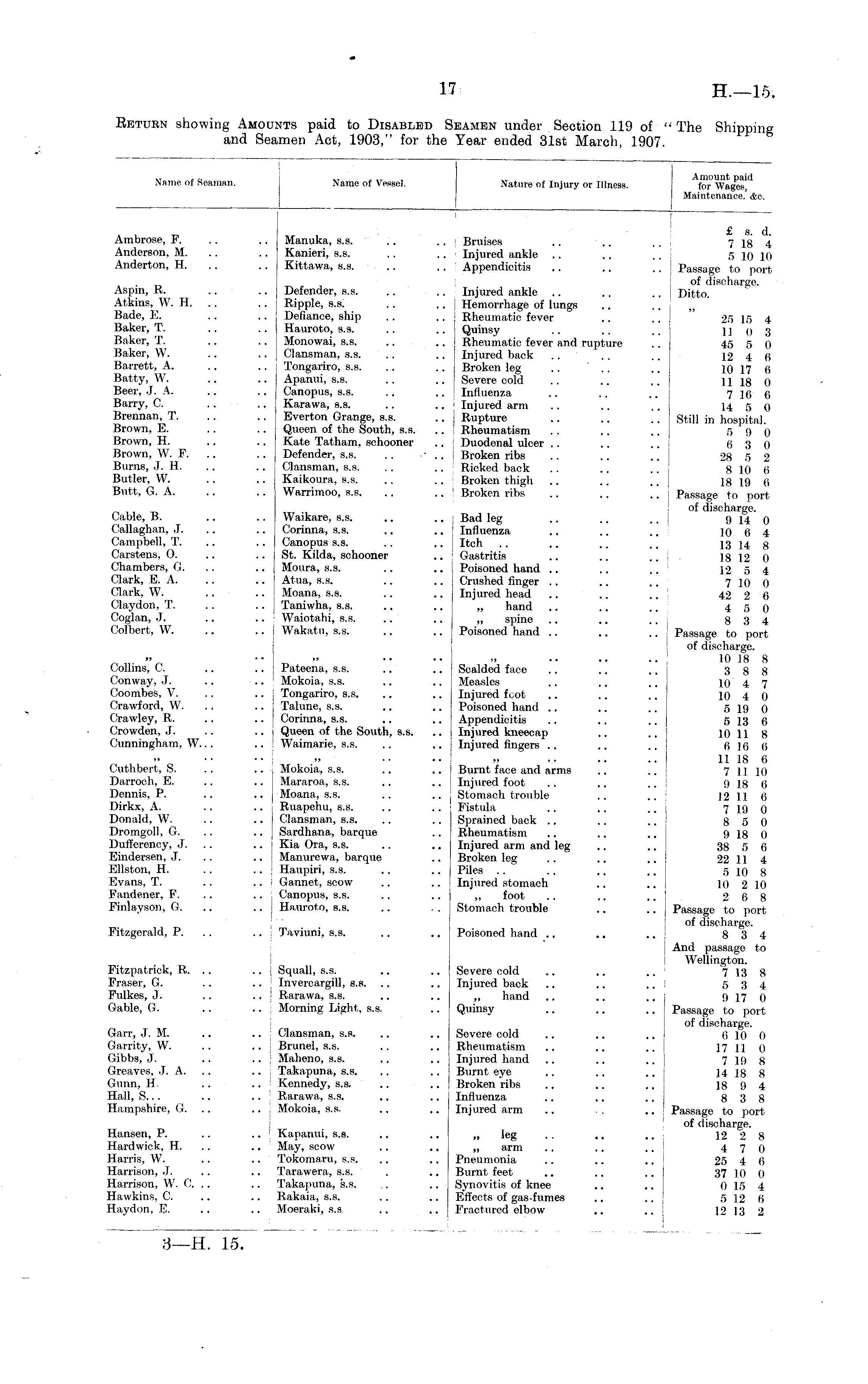 Return showing Amounts paid to Disabled Seamen under Section 119 of "The Shipping and Seamen Act, 1903," for the Year ended 31st March, 1907.