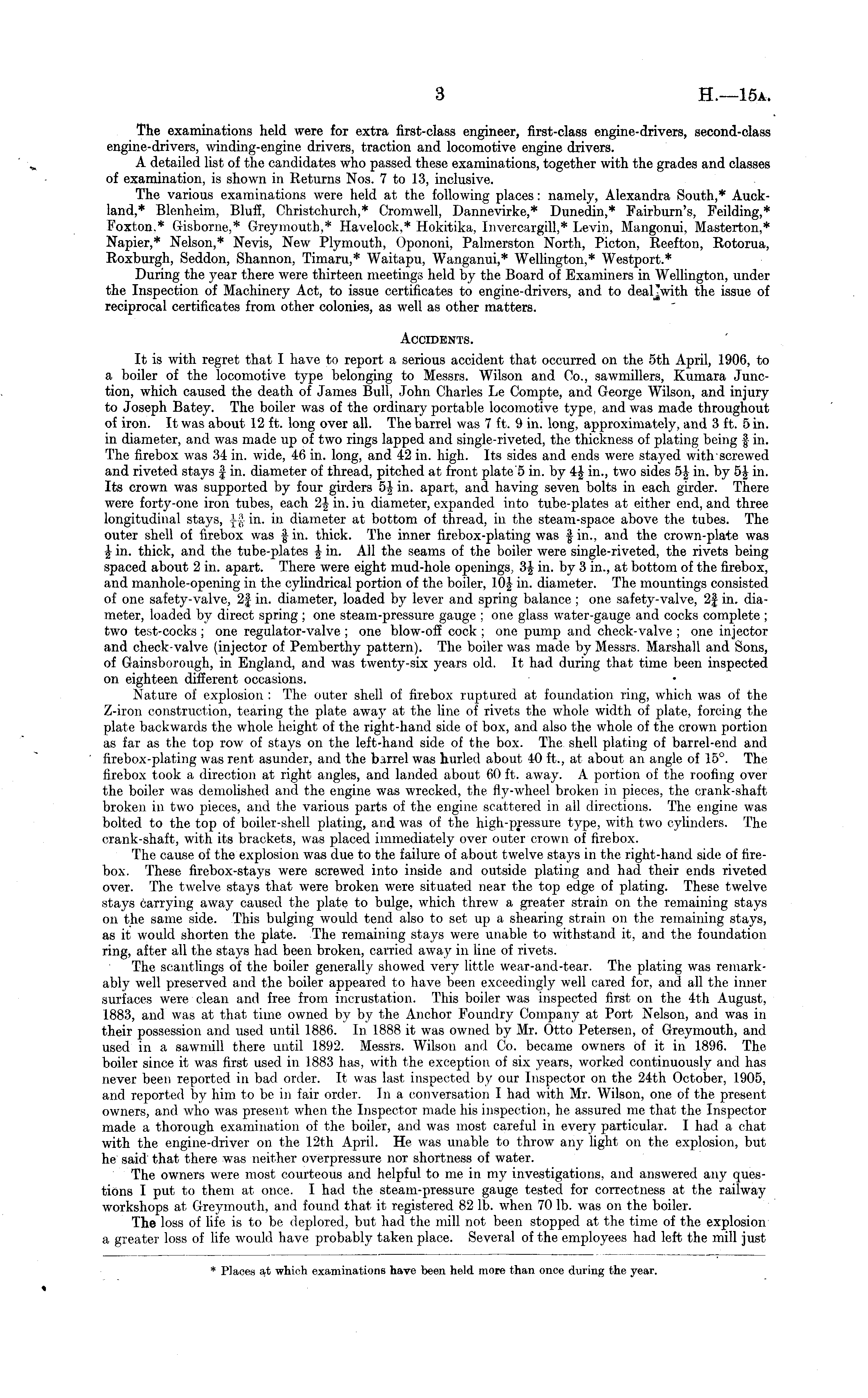 The examinations held were for extra first-class engineer, first-class engine-drivers, second-class engine-drivers, winding-engine drivers, traction and locomotive engine drivers. A detailed list of the candidates who passed these examinations, together with the grades and classes of examination, is shown in Returns Nos. 7 to 13, inclusive. The various examinations were held at the following places: namely, Alexandra South,* Auckland,* Blenheim, Bluff, Christchurch,* Cromwell, Dannevirke,* Dunedin,* Fairburn's, Feilding,* Foxton.* Gisborne,* Greymoutb,* Havelock,* Hokitika, Invercargill,* Levin, Mangonui, Masterton,* Napier,* Nelson,* Nevis, New Plymouth, Opononi, Palmerston North, Picton, Reefton, Rotorua, Roxburgh, Seddon, Shannon, Timaru,* Waitapu, Wanganui,* Wellington,* Westport.* During the year there were thirteen meetings held by the Board of Examiners in Wellington, under the Inspection of Machinery Act, to issue certificates to engine-drivers, and to dealjVith the issue of reciprocal certificates from other colonies, as well as other matters. Accidents. It is with regret that I have to report a serious accident that occurred on the sth April, 1906, to a boiler of the locomotive type belonging to Messrs. Wilson and Co., sawmillers, Kumara Junction, which caused the death of James Bull, John Charles Le Compte, and George Wilson, and injury to Joseph Batey. The boiler was of the ordinary portable locomotive type, and was made throughout of iron. It was about 12 ft. long over all. The barrel was 7 ft. 9 in. long, approximately, and 3 ft. 5 in. in diameter, and was made up of two rings lapped and single-riveted, the thickness of plating being f in. The firebox was 34 in. wide, 46 in. long, and 42 in. high. Its sides and ends were stayed with screwed and riveted stays § in. diameter of thread, pitched at front plate 5 in. by 4£ in., two sides 5 J in. by 5 \ in. Its crown was supported by four girders 5-| in. apart, and having seven bolts in each girder. There were forty-one iron tubes, each in. in diameter, expanded into tube-plates at either end, and three longitudinal stays, \\ in. in diameter at bottom of thread, in the steam-space above the tubes. The outer shell of firebox was fin. thick. The inner firebox-plating was fin., and the crown-plate was \ in. thick, and the tube-plates \ in. All the seams of the boiler were single-riveted, the rivets being spaced about 2 in. apart. There were eight mud-hole openings, 3J in. by 3 in., at bottom of the firebox, and manhole-opening in the cylindrical portion of the boiler, 10 J in. diameter. The mountings consisted of one safety-valve, 2f in. diameter, loaded by lever and spring balance ; one safety-valve, 2| in. diameter, loaded by direct spring ; one steam-pressure gauge ; one glass water-gauge and cocks complete ; two test-cocks ; one regulator-valve ; one blow-off cock ; one pump and check-valve ; one injector and check-valve (injector of Pemberthy pattern). The boiler was made by Messrs. Marshall and Sons, of Gainsborough, in England, and was twenty-six years old. It had during that time been inspected on eighteen different occasions. Nature of explosion : The outer shell of firebox ruptured at foundation ring, which was of the Z-iron construction, tearing the plate away at the line of rivets the whole width of plate, forcing the plate backwards the whole height of the right-hand side of box, and also the whole of the crown portion as far as the top row of stays on the left-hand side of the box. The shell plating of barrel-end and firebox-plating was rent asunder, and the barrel was hurled about 40 ft., at about an angle of 15°. The firebox took a direction at right angles, and landed about 60 ft. away. A portion of the roofing over the boiler was demolished and the engine was wrecked, the fly-wheel broken in pieces, the crank-shaft broken in two pieces, and the various parts of the engine scattered in all directions. The engine was bolted to the top of boiler-shell plating, and was of the high-pressure type, with two cylinders. The crank-shaft, with its brackets, was placed immediately over outer crown of firebox. The cause of the explosion was due to the failure of about twelve stays in the right-hand side of firebox. These firebox-stays were screwed into inside and outside plating and had their ends riveted over. The twelve stays that were broken were situated near the top edge of plating. These twelve stays carrying away caused the plate to bulge, which threw a greater strain on the remaining stays on the same side. This bulging would tend also to set up a shearing strain on the remaining stays, as it would shorten the plate. The remaining stays were unable to withstand it, and the foundation ring, after all the stays had been broken, carried away in line of rivets. The scantlings of the boiler generally showed very little wear-and-tear. The plating was remarkably well preserved and the boiler appeared to have been exceedingly well cared for, and all the inner surfaces were clean and free from incrustation. This boiler was inspected first on the 4th August, 1883, and was at that time owned by by the Anchor Foundry Company at Port Nelson, and was in their possession and used until 1886. In 1888 it was owned by Mr. Otto Petersen, of Greymouth, and used in a sawmill there until 1892. Messrs. Wilson and Co. became owners of it in 1896. The boiler since it was first used in 1883 has, with the exception of six years, worked continuously and has never been reported in bad order. It was last inspected by our Inspector on the 24th October, 1905, and reported by him to be in fair order. In a conversation I had with Mr. Wilson, one of the present owners, and who was present when the Inspector made his inspection, he assured me that the Inspector made a thorough examination of the boiler, and was most careful in every particular. I had a chat with the engine-driver on the 12th April. He was unable to throw any light on the explosion, but