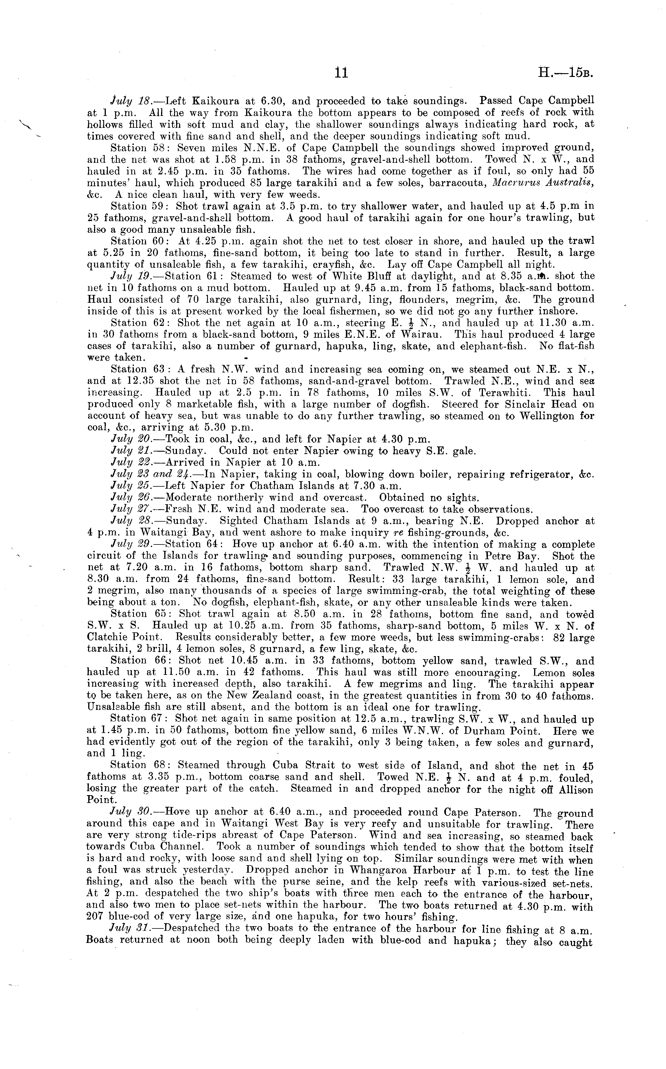 July 18. —Left Kaikoura at 6.30, and proceeded to take soundings. Passed Cape Campbell at 1 p.m. All the way from Kaikoura the bottom appears to be composed of reefs of rock with hollows filled with soft mud and clay, the shallower soundings always indicating hard rock, at times covered with fine sand and shell, and the deeper soundings indicating soft mud. Station 58: Seven miles N.N.E. of Cape Campbell the soundings showed improved ground, and the net was shot at 1.58 p.m. in 38 fathoms, gravel-and-shell bottom. Towed N. x W., and hauled in at 2.45 p.m. in 35 fathoms. The wires had come together as if foul, so only had 55 minutes' haul, which produced 85 large tarakihi and a few soles, barracouta, Macrurus Australia, &,c. A nice clean haul, with very few weeds. Station 59: Shot trawl again at 3.5 p.m. to try shallower water, and hauled up at 4.5 p.m in 25 fathoms, gravel-and-shell bottom. A good haul of tarakihi again for one hour's trawling, but also a good many unsaleable fish. Station 60: At 4.25 p.m. again shot the net to test closer in shore, and hauled up the trawl at 5.25 in 20 fathoms, fine-sand bottom, it being too late to stand in further. Result, a large quantity of unsaleable fish, a few tarakihi, crayfish, &c. Lay off Cape Campbell all night. July 19. —Station 61 : Steamed to west of White Bluff at daylight, and at 8.35 a.*, shot the net in 10 fathoms on a mud bottom. Hauled up at 9.45 a.m. from 15 fathoms, black-sand bottom. Haul consisted of 70 large tarakihi, also gurnard, ling, flounders, megrim, &c. The ground inside of this is at present worked by the local fishermen, so we did not go any further inshore. Station 62: Shot the net again at 10 a.m., steering E. J N., and hauled up at 11.30 a.m. in 30 fathoms from a black-sand bottom, 9 miles E.N.E. of Wairau. This haul produced 4 large cases of tarakihi, also a number of gurnard, hapuka, ling, skate, and elephant-fish. No flat-fish were taken. Station 63 : A fresh N.W. wind and increasing sea coming on, we steamed out N.E. x N., and at 12.35 shot the net in 58 fathoms, sand-and-gravel bottom. Trawled N.E., wind and sea increasing. Hauled up at 2.5 p.m. in 78 fathoms, 10 miles S.W. of Terawhiti. This haul produced only 8 marketable fish, with a large number of dogfish. Steered for Sinclair Head on account of heavy sea, but was unable to do any further trawling, so steamed on to Wellington for coal, &c, arriving at 5.30 p.m. July 20. —Took in coal, &c, and left for Napier at 4.30 p.m. July 21. —Sunday. Could not enter Napier owing to heavy S.E. gale. July 22. —Arrived in Napier at 10 a.m. July 23 and 2£. —In Napier, taking in coal, blowing down boiler, repairing refrigerator, &c. July 25. —Left Napier for Chatham Islands at 7.30 a.m. July 26. —Moderate northerly wind and overcast. Obtained no sights. July 27. —Fresh N.E. wind and moderate sea. Too overcast to take observations. July 28. —Sunday. Sighted Chatham Islands at 9 a.m., bearing N.E. Dropped anchor at 4 p.m. in Waitangi Bay, and went ashore to make inquiry re fishing-grounds, &c. July 29. —Station 64: Hove up anchor at 6.40 a.m. with the intention of making a complete circuit of the Islands for trawling* and sounding purposes, commencing in Petre Bay. Shot the net at 7.20 a.m. in 16 fathoms, bottom sharp sand. Trawled N.W. J? W. and hauled up at 8.30 a.m. from 24 fathoms, fine-sand bottom. Result: 33 large tarakihi, 1 lemon sole, and 2 megrim, also many thousands of a species of large swimming-crab, the total weighting of these being about a ton. No dogfish, elephant-fish, skate, or any other unsaleable kinds were taken. Station 65: Shot trawl again at 8.50 a.m. in 28 fathoms, bottom fine sand, and towed S.W. x S. Hauled up at 10.25 a.m. from 35 fathoms, sharp-sand bottom, 5 miles W. x N. of Clatchie Point. Results considerably better, a few more weeds, but less swimming-crabs: 82 large tarakihi, 2 brill, 4 lemon soles, 8 gurnard, a few ling, skate, &c. Station 66: Shot net 10.45 a.m. in 33 fathoms, bottom yellow sand, trawled S.W., and hauled up at 11.50 a.m. in 42 fathoms. This haul was still more encouraging. Lemon soles increasing with increased depth, also tarakihi. A few megrims and ling. The tarakihi appear to be taken here, as on the New Zealand coast, in the greatest quantities in from 30 to 40 fathoms. Unsaleable fish are still absent, and the bottom is an ideal one for trawling. Station 67: Shot net again in same position at 12.5 a.m., trawling S.W. x W., and hauled up at 1.45 p.m. in 50 fathoms, bottom fine yellow sand, 6 miles W\N.W. of Durham Point. Here we had evidently got out of the region of the tarakihi, only 3 being taken, a few soles and gurnard, and 1 ling. Station 68: Steamed through Cuba Strait to west side of Island, and shot the net in 45 fathoms at 3.35 p.m., bottom coarse sand and shell. Towed N.E. | N. and at 4 p.m. fouled, losing the greater part of the catch. Steamed in and dropped anchor for the night off Allison Point. July 80. —Hove up anchor at 6.40 a.m., and proceeded round Cape Paterson. The ground around this cape and in Waitangi West Bay is very reefy and unsuitable for trawling. There are very strong tide-rips abreast of Cape Paterson. Wind and sea increasing, so steamed back towards Cuba Channel. Took a number of soundings which tended to show that the bottom itself is hard and rocky, with loose sand and shell lying on top. Similar soundings were met with when a foul was struck yesterday. Dropped anchor in Whangaroa Harbour at 1 p.m. to test the line fishing, and also the beach with the purse seine, and the kelp reefs with various-sized set-nets. At 2 p.m. despatched the two ship's boats with three men each to the entrance of the harbour, and also two men to place set-nets within the harbour. The two boats returned at 4.30 p.m. with 207 blue-cod of very large size, and one hapuka, for two hours' fishing. July 31. —Despatched the two boats to the entrance of the harbour for line fishing at 8 a.m.
