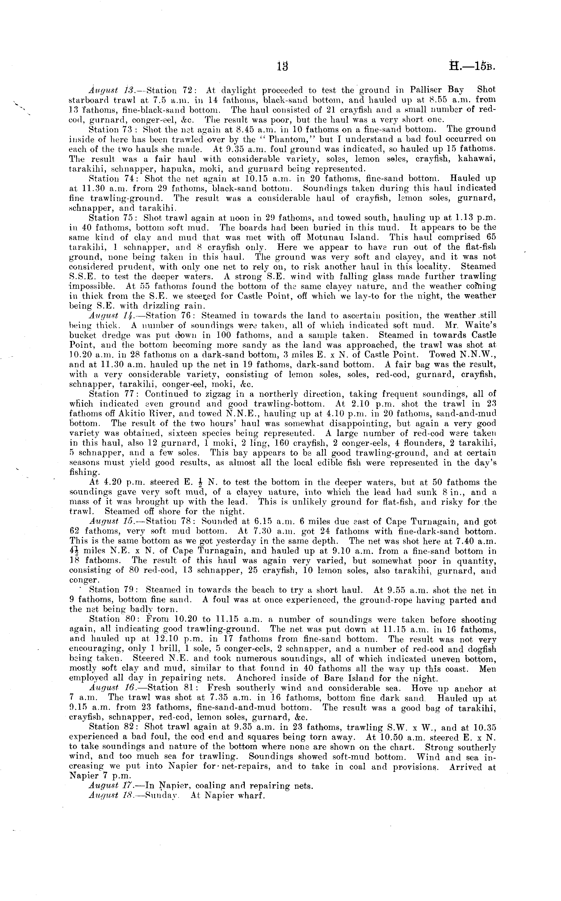 August 13. —Station 72: At daylight proceeded to test the ground in Palliser Bay Shot starboard trawl at 7.5 a.m. in 14 fathoms, black-sand bottom, and hauled up at B.r>s a.m. from 13 fathoms, fine-black-sand bottom. The haul consisted of 21 crayfish and a small number of rednod, gurnard, oonger-eel, &c. The result was poor, but the haul was a very short one. Station 7-' i : Shot the nat again at 8.45 a.m. in 10 fathoms on a fine-sand bottom. The ground inside of here has been trawled over by the " Phantom," but I understand a bad foul occurred on each of the two hauls slit' made. At 9.,55 a.m. foul ground was indicated, so hauled up 15 fathoms. The result was a fair haul with considerable variety, soles, lemon soles, crayfish, kahawai, tarakihi, schnapper, hapuka, moki, and gurnard being represented. Station 74: Shot flu , net again at 10.15 a.m. in 20 fathoms, fine-sand bottom. Hauled up at 11.30 a.m. from 29 fathoms, black-sand bottom. Soundings taken during this haul indicated fine trawling-ground. The result was a considerable haul of crayfish, lemon soles, gurnard, schnapper, and tarakihi. Station 75: Shot trawl again at noon in 29 fathoms, and towed south, hauling up at 1.13 p.m. in 40 fathoms, bottom soft mud. The boards had been buried in this mud. It appears to be the same kind of clay and mud that was met with off Motunau Island. This haul comprised 65 tarakihi, 1 schnapper, and 8 crayfish only. Here we appear to have run out of the flat-fish ground, none being taken in this haul. The ground was very soft and clayey, and it was not considered prudent, with only one net to rely on, to risk another haul in this locality. Steamed S.S.E. to test the deeper waters. A strong S.E. wind with falling glass made further trawling impossible. At 55 fathoms found the bottom of the same clayey nature, and the weather coming in thick from the S.E. we steer.cd for Castle Point, off which we lay-to for the night, the weather being S.E. with drizzling rain. August 11/.. —Station 76 : Steamed in towards the laud to ascertain position, the weather still being thick. A number of soundings were taken, all of which indicated soft mud. Mr. Waite's bucket dredge was put down in 100 fathoms, and a sample taken. Steamed in towards Castle Point, and the bottom becoming more sand}' as the land was approached, the trawl was shot at 10.20 a.m. in 28 fathoms on a dark-sand bottom, 3 miles E. xX. of Castle Point. Towed N.N.W., and at 11.30 a.m. hauled tip the net in 19 fathoms, dark-sand bottom. A fair bag was the result, with a very considerable variety, consisting of lemon soles, soles, red-cod, gurnard, crayfish, schuapper, tarakihi, conger-eel, moki, d-c. Station 77 : Continued to zigzag in a northerly direction, taking frequent soundings, all of which indicated even ground and good trawling-bottom. At 2.10 p.m. shot the trawl in 23 fathoms off Akitio River, and towed N.N.E., hauling up at 4.10 p.m. in 20 fathoms, sand-and-mud bottom. The result of the two hours' haul was somewhat disappointing, but again a very good variety was obtained, sixteen species being represented. A large number of red-cod were taken in this haul, also 12 gurnard, 1 moki, 2 ling, 160 crayfish, 2 conger-eels, 4 flounders, 2 tarakihi, 5 schnapper, and a few soles. This bay appears to bs all good trawliug-ground, and at certain seasons must yield good results, as almost all the local edible fish were represented in the day's fishing. At 4.20 p.m. steered E. i N. to test the bottom in the deeper waters, but at 50 fathoms the soundings gave very soft mud, of a clayey nature, into which the lead had sunk 8 in., and a mass of it was brought up with the lead. This is unlikely ground for flat-fish, and risky for the trawl. Steamed off shore for the night. Av</vst I~>. —Station 78: Sounded at 6.15 a.m. 6 miles due aast of Cape Turnagain, and got 62 fathoms, very soft mud bottom. At 7.30 a.m. got 24 fathoms with fine-dark-sand bottom. This is the same bottom as we got yesterday in the same depth. The net was shot here at 7.40 a.m. 4J miles N.E. x N. of Cape Turnagain, and hauled up at 9.10 a.m. from a fine-sand bottom in IS fathoms. The result of this haul was again very varied, but somewhat poor in quantity, consisting of 80 red-cod, 13 schnapper, 25 crayfish, 10 lemon soles, also tarakihi, gurnard, and conger. Station 79 : Steamed in towards the beach to try a short haul. At 9.55 a.m. shot the net in 9 fathoms, bottom fine sand. A foul was at once experienced, the ground-rope having parted and the net being badly torn. Station 80: From 10.20 to 11.15 a.m. a number of soundings were taken before shooting again, all indicating good trawling-ground. The net was put down at 11.15 a.m. in 16 fathoms, and hauled up at 12.10 p.m. in 17 fathoms from fine-sand bottom. The result was not very encouraging, only 1 brill, 1 sole, 5 conger-eels, 2 schnapper, and a number of red-cod and dogfish being taken. Steered N.E. and took numerous soundings, all of which indicated uneven bottom, mostly soft clay and mud, similar to that found in 40 fathoms all the way up this coast. Men employed all day in repairing nets. Anchored inside of Bare Island for the night. August 16. —Station 81 : Fresh southerly wind and considerable sea. Hove up anchor at 7 a.m. The trawl was shot at 7.35 a.m. in 16 fathoms, bottom fine dark sand. Hauled up at 9.15 a.m. from 23 fathoms, fine-sand-and-mud bottom. The result was a good bag of tarakihi, crayfish, schnapper, red-cod, lemon soles, gurnard, &c. Station 82: Shot trawl again at 9.35 a.m. in 23 fathoms, trawling S.W. x W., and at 10.35 experienced a bad foul, the cod end and squares being torn away. At 10.50 a.m. steered E. xN. to take soundings and nature of the bottom where none are shown on the chart. Strong southerly wind, and too much sea for trawling. Soundings showed soft-mud bottom. Wind and sea increasing we put into Napier for • net-repairs, and to take in coal and provisions. Arrived at Napier 7 p.m. Augu