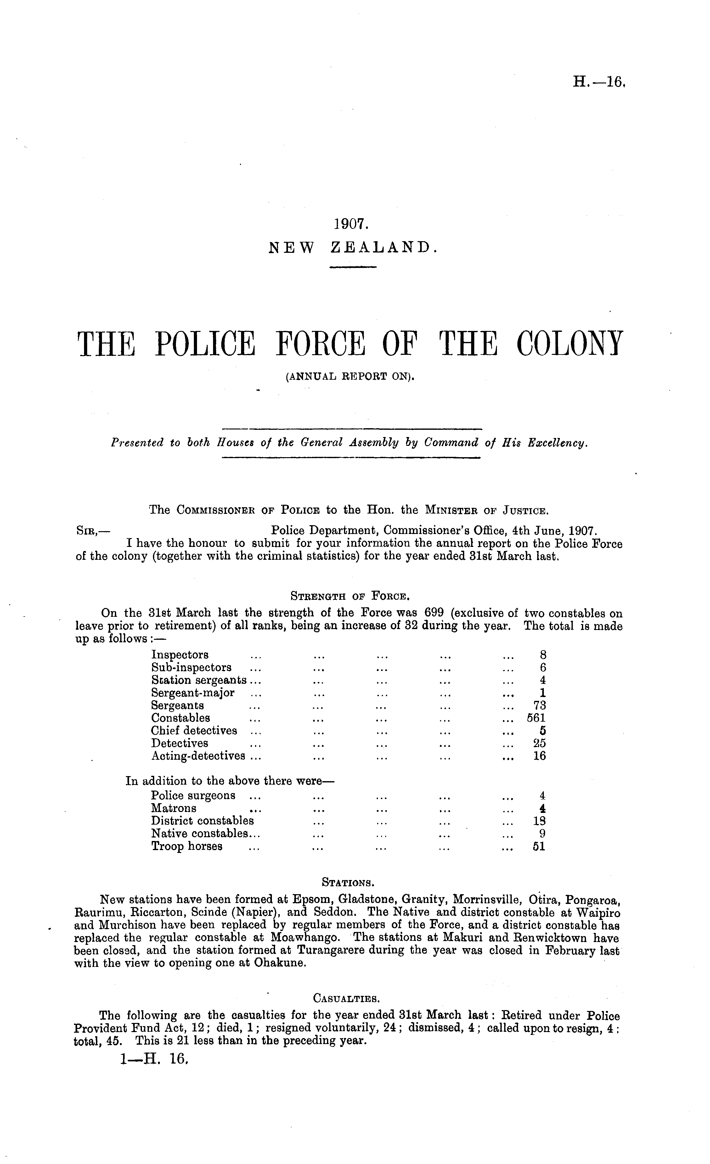 The Commissioner op Police to the Hon. the Minister op Justice. Sib, — Police Department, Commissioner's Office, 4th June, 1907. I have the honour to submit for your information the annual report on the Police Force of the colony (together with the criminal statistics) for the year ended 31st March last. Strength op Force. On the 31st March last the strength of the Force was 699 (exclusive of two constables on leave prior to retirement) of all ranks, being an increase of 32 during the year. The total is made up as follows: — Inspectors ... ... ... ... ... 8 Sub-inspectors ... ... ... ... ... 6 Scation sergeants... ... ... ... ... 4 Sergeant-major ... ... ... ... ... 1 Sergeants ... ... ... ... ... 73 Constables ... ... ... ... ... 561 Chief detectives ... ... ... ... ... 5 Detectives ... ... ... ... ... 25 Acting-detectives ... ... ... ... ... 16 In addition to the above there were— Police surgeons ... ... ... ... ... 4 Matrons ... ... ... ... ... 4 District constables ... ... ... ... 18 Native constables... ... ... ... ... 9 Troop horses ... ... ... ... ... 51 Stations. New stations have been formed at Epsom, Gladstone, Granity, Morrinsville, Otira, Pongaroa, Eaurimu, Eiccarton, Scinde (Napier), and Seddon. The Native and district constable at Waipiro and Murchison have been replaced by regular members of the Force, and a district constable has replaced the regular constable at Moawhango. The stations at Makuri and Eenwicktown have been closed, and the station formed at Turangarere during the year was closed in February last with the view to opening one at Ohakune. Casualties. The following are the casualties for the year ended 31st March last: Eetired under Police Provident Fund Act, 12; died, 1; resigned voluntarily, 24 ; dismissed, 4 ; called upon to resign, 4 : total, 45. This is 21 less than in the preceding year.