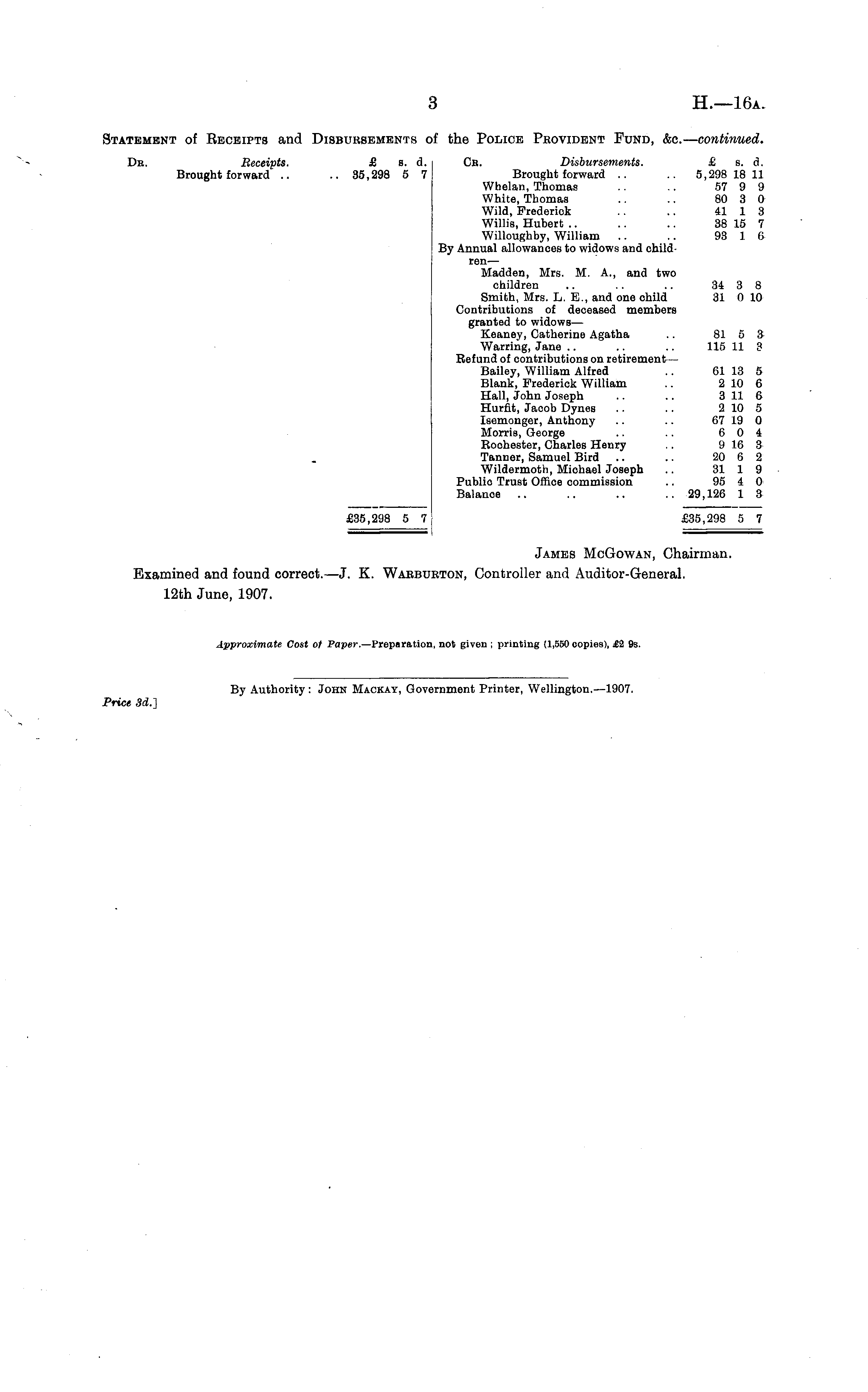 Statement of Receipts and Disbursements of the Police Provident Fund, &c.— continued. Db. Receipts. £ s. d. Cb. Disbursements. £ s. d. Brought forward .. .. 35,298 5 7 Brought forward .. .. 5,298 18 11 Whelan, Thomas .. .. 57 9 9 White, Thomas .. .. 80 3 0 Wild, Frederick .. .. 41 1 3 Willis, Hubert .. .. .. 38 15 7 Willoughby, William .. .. 93 1 6 By Annual allowances to widows and children— Madden, Mrs. M. A., and two children .. .. .. 34 3 8 Smith, Mrs. L. E., and one child 31 0 10 Contributions of deceased members granted to widows— Keaney, Catherine Agatha .. 81 5 3 Warring, Jane .. .. .. 115 11 3 Refund of contributions on retirement — Bailey, William Alfred .. 61 13 5 Blank, Frederick William .. 2 10 6 Hall, John Joseph .. .. 311 6 Hurfit, Jacob Dynes .. .. 210 5 Isemonger, Anthony .. .. 67 19 0 Morris, George .. .. 6 0 4 Rochester, Charles Henry .. 9 16 3 Tanner, Samuel Bird .. .. 20 6 2 Wildermoth, Miohael Joseph .. 31 1 9 Publio Trust Office commission .. 95 4 0 Balance .. .. .. .. 29,126 1 3 £35,298 5 7 £35,298 5 7 James McGowan, Chairman. Examined and found correct.—J. K. Warburton, Controller and Auditor-General. 12th June, 1907. Approximate Cost of Paper. —Preparation, not given ; printing (1,550 copies), £2 9s.