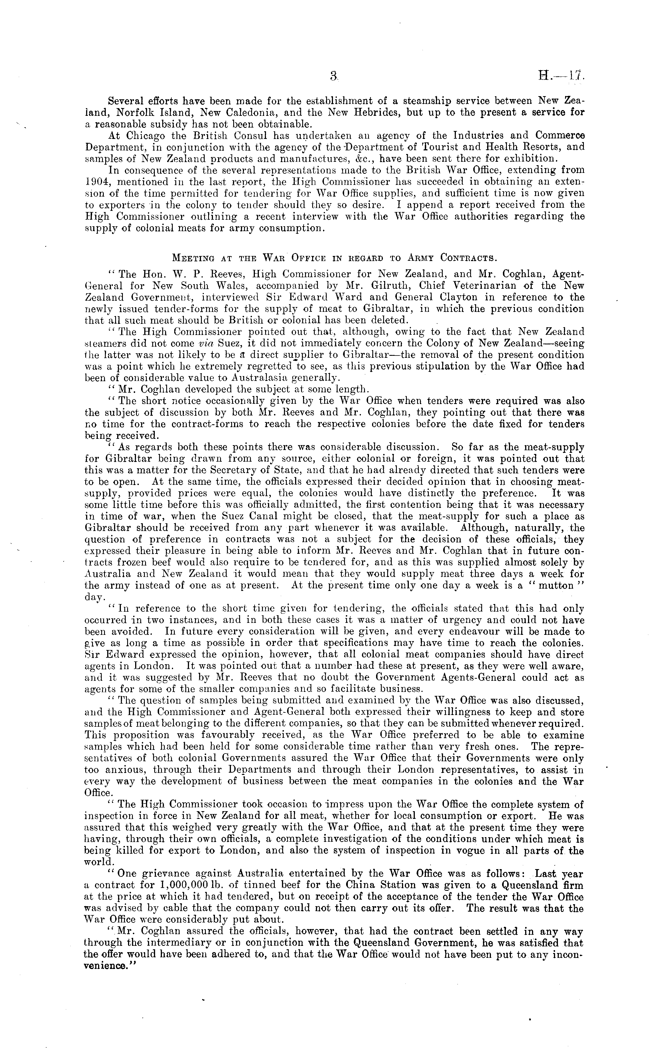 Several efforts have been made for the establishment of a steamship service between New Zealand, Norfolk Island, New Caledonia, and the New Hebrides, but up to the present a service for a reasonable subsidy has not been obtainable. At Chicago the British Consul has undertaken an agency of the Industries and Commerce Department, in conjunction with the agency of the Department of Tourist and Health Resorts, and samples of New Zealand products and manufactures, &c, have been sent there for exhibition. In consequence of the several representations made to the British War Office, extending from 1904, mentioned in the last report, the High Commissioner has succeeded in obtaining an extension of the time permitted for tendering for War Office supplies, and sufficient time is now given to exporters in the colony to tender should they so desire. I append a report received from the High Commissioner outlining a recent interview with the War Office authorities regarding the supply of colonial meats for army consumption. Meeting at the War Office in regard to Army Contracts. " The Hon. W. P. Reeves, High Commissioner for New Zealand, and Mr. Coghlan, AgentGeneral for New South Wales, accompanied by Mr. Gilruth, Chief Veterinarian of the New Zealand Government, interviewed Sir Edward Ward and General Clayton in reference to the newly issued tender-forms for the supply of meat to Gibraltar, in which the previous condition that all such meat should be British or colonial has been deleted. " The High Commissioner pointed out that, although, owing to the fact that New Zealand steamers did not come via Suez, it did not immediately concern the Colony of New Zealand —seeing the latter was not likely to be a direct supplier to Gibraltar —the removal of the present condition was a point which he extremely regretted to see, as this previous stipulation by the War Office had been of considerable value to Australasia generally. " Mr. Coghlan developed the subject at some length. " The short notice occasionally given by the War Office when tenders were required was also the subject of discussion by both Mr. Reeves and Mr. Coghlan, they pointing out that there was no time for the contract-forms to reach the respective colonies before the date fixed for tenders being received. "As regards both these points there was considerable discussion. So far as the meat-supply for Gibraltar being drawn from any source, either colonial or foreign, it was pointed out that this was a matter for the Secretary of State, and that he had already directed that such tenders were to be open. At the same time, the officials expressed their decided opinion that in choosing meatsupply, provided prices were equal, the colonies would have distinctly the preference. It was some little time before this was officially admitted, the first contention being that it was necessary in time of war, when the Suez Canal might be closed, that the meat-supply for such a place as Gibraltar should be received from any part whenever it was available. Although, naturally, the question of preference in contracts was not a subject for the decision of these officials, they expressed their pleasure in being able to inform Mr. Reeves and Mr. Coghlan that in future contracts frozen beef would also require to be tendered for, and as this was supplied almost solely by Australia and New Zealand it would mean that they would supply meat three days a week for the army instead of one as at present. At the present time only one day a week is a " mutton " day. " In reference to the short time given for tendering, the officials stated that this had only occurred in two instances, and in both these cases it was a matter of urgency and could not have been avoided. In future every consideration will be given, and every endeavour will be made to give as long a time as possible in order that specifications may have time to reach the colonies. Sir Edward expressed the opinion, however, that all colonial meat companies should have direct agents in London. It was pointed out that a number had these at present, as they were well aware, and it was suggested by Mr. Reeves that no doubt the Government Agents-General could act as agents for some of the smaller companies and so facilitate business. " The question of samples being submitted and examined by the War Office was also discussed, and the High Commissioner and Agent-General both expressed their willingness to keep and store samplesof meat belonging to the different companies, so that they can be submitted whenever required. This proposition was favourably received, as the War Office preferred to be able to examine samples which had been held for some considerable time rather than very fresh ones. The representatives of both colonial Governments assured the War Office that their Governments were only too anxious, through their Departments and through their London representatives, to assist in every way the development of business between the meat companies in the colonies and the War Office. " The High Commissioner took occasion to impress upon the War Office the complete system of inspection in force in New Zealand for all meat, whether for local consumption or export. He was assured that this weighed very greatly with the War Office, and that at the present time they were having, through their own officials, a complete investigation of the conditions under which meat is being killed for export to London, and also the system of inspection in vogue in all parts of the world. "One grievance against Australia entertained by the War Office was as follows: Last year a contract for 1,000,0001b. of tinned beef for the China Station was given to a Queensland firm at the price at which it had tendered, but on receipt of the acceptance of the tender the War Office was advised by cable that the company could not then carry out its offer. The result was that the War Office were considerably put about. "Mr. Coghlan assured the official