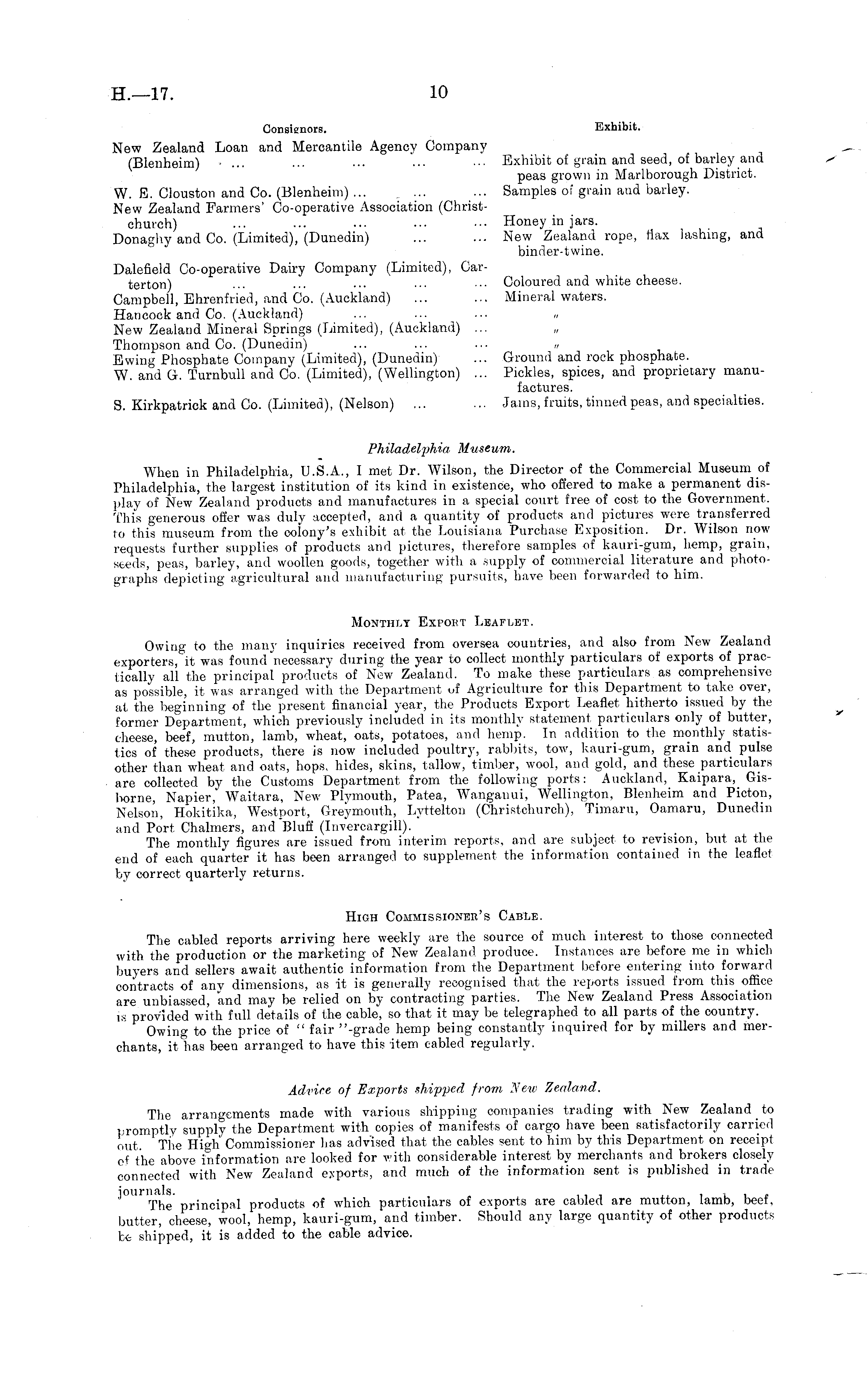 Consignors. Exhibit. New Zealand Loan and Mercantile Agency Company (Blenheim) ... ... ... ••• ••■ Exhibit of grain and seed, of barley and peas grown in Marlborough District. W. E. Clouston and Co. (Blenheim) ... ... ... Samples of grain and barley. New Zealand Farmers' Co-operative Association (Christchurch) ... ... ... ... ••• Honey in jars. Donaghy and Co. (Limited), (Dunedin) ... ... New Zealand rope, tiax lashing, and binder-twine. Dalefield Co-operative Dairy Company (Limited), Carterton) ... ... ... ••• ••• Coloured and white cheese. Campbell, Ehrenfried, and Co. (Auckland) ... ... Mineral waters. Hancock and Co. (Auckland) New Zealand Mineral Springs (Limited), (Auckland) ... Thompson and Co. (Dunedin) ... ... ... „ Ewing Phosphate Company (Limited), (Dunedin) ... Ground and rock phosphate. W. and G. Turnbull and Co. (Limited), (Wellington) ... Pickles, spices, and proprietary manufactures. S. Kirkpatrick and Co. (Limited), (Nelson) ... ... Jains, fruits, tinned peas, and specialties. Philadelphia Museum. When in Philadelphia, U.S.A., I met Dr. Wilson, the Director of the Commercial Museum of Philadelphia, the largest institution of its kind in existence, who offered to make a permanent display of New Zealand products and manufactures in a special court free of cost to the Government. This generous offer was duly accepted, and a quantity of products and pictures were transferred to this museum from the colony's exhibit at the Louisiana Purchase Exposition. Dr. Wilson now requests further supplies of products and pictures, therefore samples of kauri-gum, hemp, grain, seeds, peas, barley, and woollen goods, together with a supply of commercial literature and photographs depicting agricultural and manufacturing pursuits, have been forwarded to him. Monthly Export Leaflet. Owing to the many inquiries received from oversea countries, and also from New Zealand exporters, it was found'necessary during the year to collect monthly particulars of exports of practically all the principal products of New Zealand. To make these particulars as comprehensive as possible, it was arranged with the Department of Agriculture for this Department to take over, at the beginning of the present financial year, the Products Export Leaflet hitherto issued by the former Department, which previously included in its monthly statement particulars only of butter, cheese, beef, mutton, lamb, wheat, oats, potatoes, and hemp. In addition to the monthly statistics of these products, there is now included poultry, rabbits, tow, kauri-gum, grain and pulse other than wheat and oats, hops, hides, skins, tallow, timber, wool, and gold, and these particulars are collected by the Customs Department from the following ports: Auckland, Kaipara, Gisborne, Napier, Waitara, New Plymouth, Patea, Wanganui, Wellington, Blenheim and Picton, Nelson, Hokitika, Westport, Greymouth, Lyttelton (Christchurch), Timaru, Oamaru, Dunedin and Port Chalmers, and Bluff (Invercargill). The monthly figures are issued from interim reports, and are subject to revision, but at the end of each quarter it has been arranged to supplement the information contained in the leaflet by correct quarterly returns. High Commissioner's Cable. The cabled reports arriving here weekly are the source of much interest to those connected with the production or the marketing of New Zealand produce. Instances are before me in which buyers and sellers await authentic information from the Department before entering into forward contracts of any dimensions, as it is generally recognised that the reports issued from this office are unbiassed, and may be relied on by contracting parties. The New Zealand Press Association is provided with full details of the cable, so that it may be telegraphed to all parts of the country. Owing to the price of " fair "-grade hemp being constantly inquired for by millers and merchants, it has been arranged to have this item cabled regularly. Advice of Exports shipped from New Zealand. The arrangements made with various shipping companies trading with New Zealand to promptly supply the Department with copies of manifests of cargo have been satisfactorily carried out The High Commissioner has advised that the cables sent to him by this Department on receipt of the above information are looked for with considerable interest by merchants and brokers closely connected with New Zealand exports, and much of the information sent is published in trade journals. . , , , The principal products of which particulars of exports are cabled are mutton, lamb, beet, butter, cheese, wool, hemp, kauri-gum, and timber. Should any large quantity of other products be shipped, it is added to the cable advice.