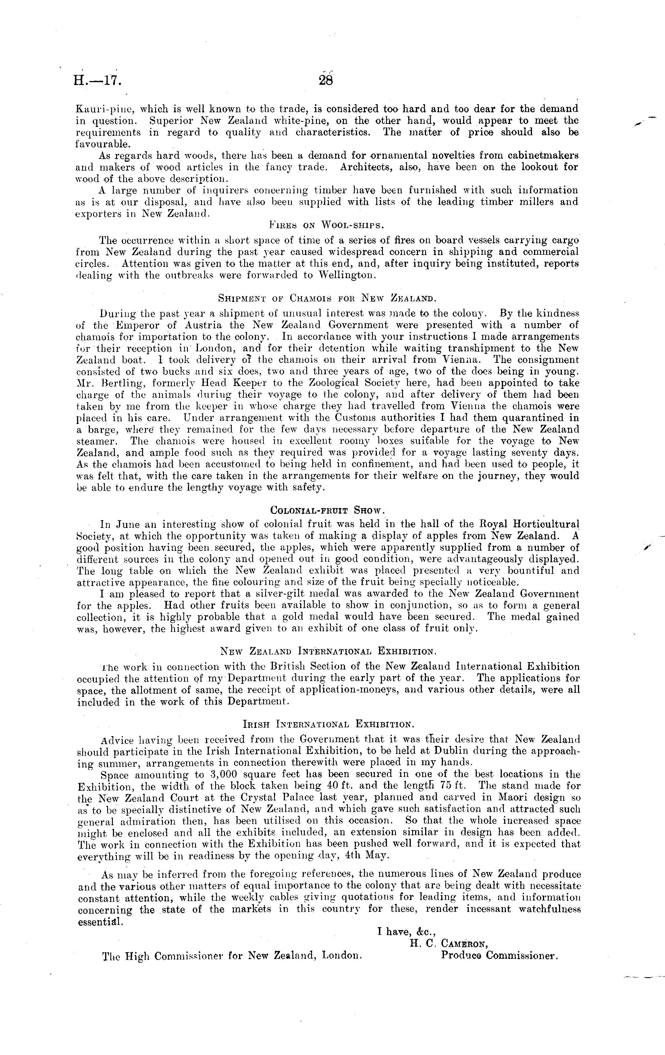 Kauri-pine, which is well known to the trade, is considered too hard and too dear for the demand in question. Superior New Zealand white-pine, on the other hand, would appear to meet the requirements in regard to quality and characteristics. The matter of price should also be favourable. As regards hard woods, there has been a demand for ornamental novelties from cabinetmakers and makers of wood articles in the fancy trade. Architects, also, have been on the lookout for wood of the above description. A large number of inquirers concerning timber have been furnished with such information as is at our disposal, and have also been supplied with lists of the leading timber millers and exporters in New Zealand. Fires on Wool-ships. The occurrence within a short space of time of a series of fires on board vessels carrying cargo from New Zealand during the past jear caused widespread concern in shipping and commercial circles. Attention was given to the matter at this end, and, after inquiry being instituted, reports dealing with the outbreaks were forwarded to Wellington. Shipment of Chamois for New Zealand. During the past year a shipment of unusual interest was made to the colony. By the kindness of the Emperor of Austria the New Zealand Government were presented with a number of chamois fe>r importation to the colony. In accordance with your instructions I made arrangements for their reception in' London, and for their detention while waiting transhipment to the New Zealand boat. I took delivery oi the chamois on their arrival from Vienna. The consignment consisted of two bucks and six does, two and three years of age, two of the does being in young. Mr. Bertling, formerly Head Keeper to the Zoological Society here, had been appointed to take charge of the animals during their voyage to the colony, and after delivery of them had been taken by me from the keeper in whose charge they had travelled from Vienna the chamois were placed in his care. Under arrangement with the Customs authorities I had them quarantined in a barge, where they remained for the few days necessary before departure of the New Zealand steamer. The chamois were housed in excellent roomy boxes suitable for the voyage to New r Zealand, and ample food such as they required was provided for a voyage lasting seventy days. As the chamois had been accustomed to being held in confinement, and had been used to people, it was felt that, with the care taken in the arrangements for their welfare on the journey, they would be able to endure the lengthy voyage with safety. COLONIAL-FEUIT SHOW. In June an interesting show of colonial fruit was held in the hall of the Royal Horticultural Society, at which the opportunity was taken of making a display of apples from New Zealand. A good position having been, secured, the apples, which were apparently supplied from a number of different sources in the colony and opened out in good condition, were advantageously displayed. The long table on which the New Zealand exhibit was placed presented a very bountiful and attractive appearance, the fine colouring and size of the fruit being specially noticeable. I am pleased to report that a silver-gilt medal was awarded to the New Zealand Government for the apples. Had other fruits been available to show in conjunction, so as to form a general collection, it is highly probable that a gold medal would have been secured. The medal gained was, however, the highest award given to an exhibit of one class of fruit only. New Zealand International Exhibition. the work in connection with the British Section of the New Zealand International Exhibition occupied the attention of my Department during the early part of the year. The applications for space, the allotment of same, the receipt of application-moneys, and various other details, were all included in the work of this Department. Irish International Exhibition. Advice having been received from the Government that it was their desire that New Zealand should participate in the Irish International Exhibition, to be held at Dublin during the approaching summer, arrangements in connection therewith were placed in my hands. Space amounting to 3,000 square feet has been secured in one of the best locations in the Exhibition, the width of the block taken being 40 ft. and the length 75 ft. The stand made for the New Zealand Court at the Crystal Palace last year, planned and carved in Maori design so a*s* to be specially distinctive of New Zealand, and which gave such satisfaction and attracted such general admiration then, has been utilised on this occasion. So that the whole increased space might be enclosed and all the exhibits included, an extension similar in design has been added. The work in connection with the Exhibition has been pushed well forward, and it is expected that everything will be in readiness by the opening day, 4th May. As may be inferred from the foregoing references, the numerous lines of New Zealand produce and the various other matters of equal importance to the colony that are being dealt with necessitate constant attention, while the weekly cables giving quotations for leading items, and information concerning the state of the markets in this country for these, render incessant watchfulness essential. I have, &c, H. C. Cameron, The High Commissioner for New Zealand, London. Produce Commissioner.