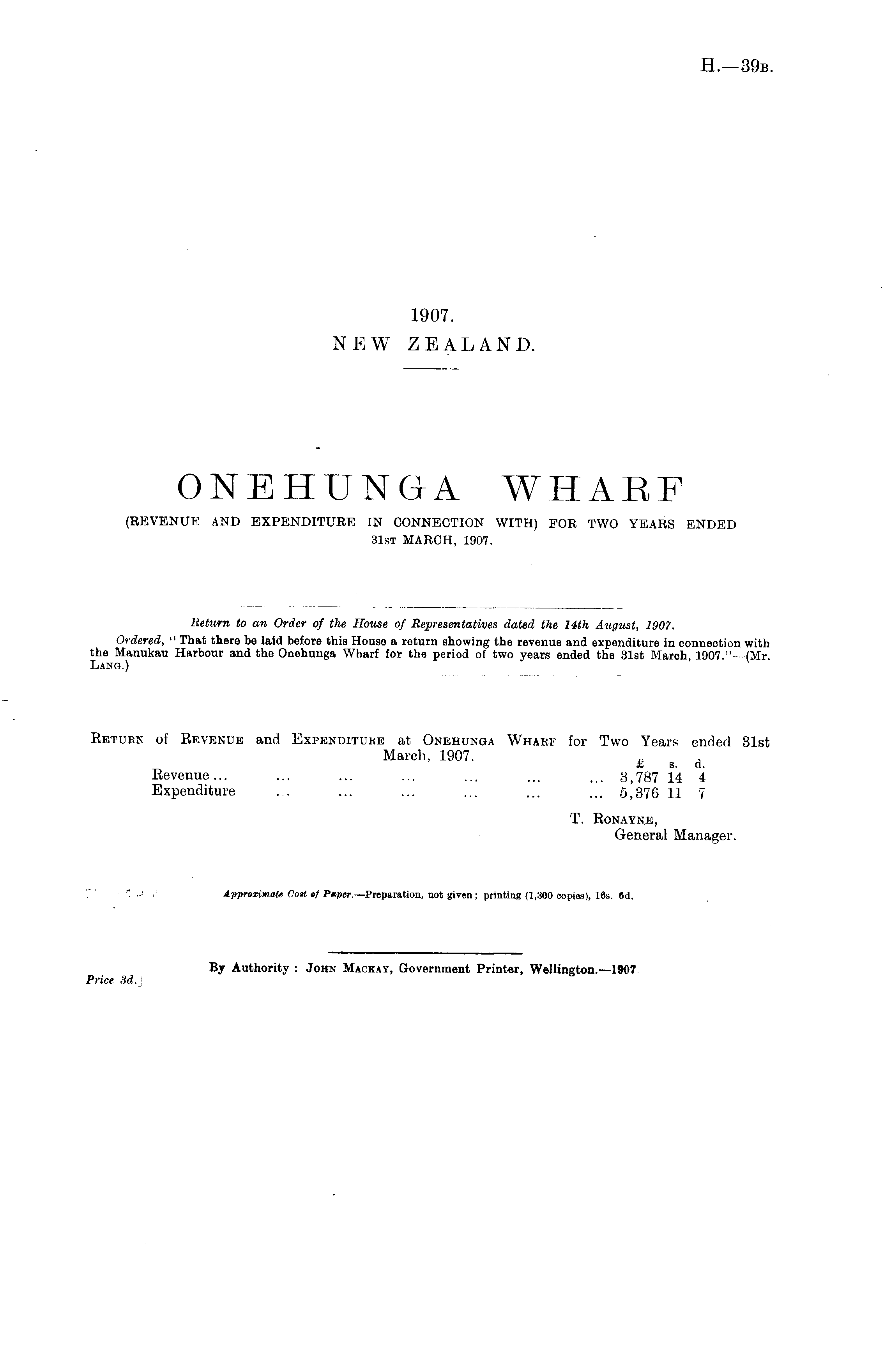 Return to an Order of the House of Representatives dated the 14th August, 1907. Ordered, " That there be laid before this House a return showing the revenue and expenditure in connection with the Manukau Harbour and the Onehunga Wharf for the period of two years ended the 31st Maroh, 1907."—(Mr. Lang.) Return of Revenue and Expenditure at Onehunga Wharf for Two Years ended 81st March, 1907. £ s. d. Revenue... ... ... ... ... ... ... 3,787 14 4 Expenditure ... ... ... ... ... ... 5,376 11 7 T. Ronayne, General Manager.