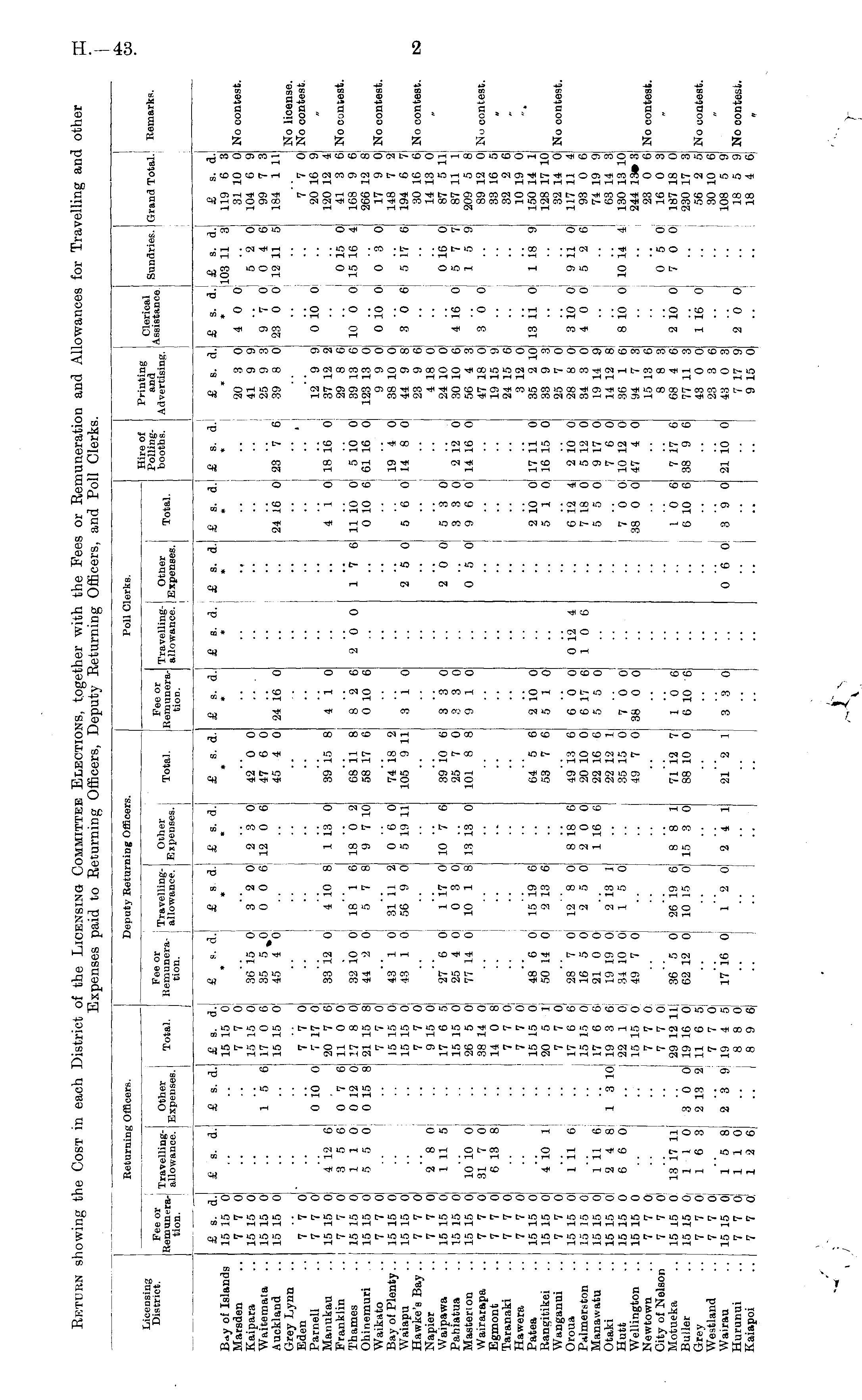 Licensing District. Rem e un°e r ra- Travelling- Other tion allowance. Expenses. Returning Officers. Deputy Returning Officers. Travelling- Other allowance. Expenses. Poll Clerks. Hire of Printing Polling- and booths. Advertising. Clerical Assistance. 1 Sundries. Grand Total. 1 Remarks. Total. •SHSKStt Other Expenses. Total. J Fee or Remuneration. Total. B*y of Islands Marsden Kaipara Waitemata Auckland Grey Lynn Eden Parnell Manukau Franklin Thames Ohinemuri Waikato Bay of Plenty.. Waiapu Hawke'e Bay .. Napier Waipawa Pahiatua Mastert on Wairarapa Egmont Taranaki Hawera Patea Rangitikei Wanganui Oroua Palmerston Manawatu Otaki Hutt Wellington Newtown City of Nelson Motueka Buller Grey Westland Wairau Huranui Kaiapoi £ s. d. 15 15 0 7 7 0 15 15 0 15 15 0 15 15 0 7 7 0 7 7 0 15 15 0 7 7 0 15 15 0 15 15 0 7 7 0 15 15 0 15 15 0 7 7 0 7 7 0 15 15 0 15 15 0 15 15 0 7 7 0 7 7 0 7 7 0 7 7 0 15 15 0 15 15 0 7 7 0 15 15 0! 15 15 0 15 15 0 15 15 0 15 15 0 15 15 0 7 7 0, 7 7 0' 15 15 0 15 15 0 7 7 0| 7 7 01 15 15 0l 7 7 0^ 7 7O! £ s. a. 4 19 6 3 5 6 110 5 5 0 2"8 0 1 11 5 10 10 0 31 7 0 6 13 8 £ s. d. £ a. A. 15 15 0 7 7 0 15 15 0 1 5 6 17 0 6 15 15 0 7 7 0 0 10 0 7 17 0 20 7 6 0 7 6 11 0 0 0 12 0 17 8 0 0 15 8 21 15 8 7 7 0 15 15 0 15 15 0 7 7 0 9 15 0 17 6 5 15 15 0 26 5 0 38 14 0 14 0 8 7 7 0 7 7 0 15 15 0| 20 5 1 7 7 0 17 6 6 15 15 0 17 6 6! 1 3 10 19 3 6 22 1 0 15 15 0 7 7 0 7 7 0! 29 12 11 3 0 0' 19 16 0 2 13 2l 11 6 5 .. 7 7 0 2 3 9 : 19 4 5 8 8 0: 8 9 6 £ p. d. £ s. d. 36*i5 0 3 2 0 35 5 0 0 0 6 45 4 0 33 12 0 ; 4 10 8 32 10 0 18 1 6 44 2 0| 5 7 8 43 'l 0 1 31 11 2 43 1 0| 56 9 0 27 6 O] 1 17 0 25 4 0i 0 3 0 77 14 0{ 10 1 8 48 6 0 15 19 6 50 14 0 2 13 6 28 7 0, 12 8 0 16 5 0 2 5 0 Jl 0 0: 19 19 0: 2 13 1 34 10 0: 15 0 49 7 0 36"5 0 2619 61 62 12 0 10 15 0 , 17 16 0 12 01 £ s. d. * 2 3 0 12 0 6 1 13 0 18 0 2 9 7 10 0 6 ol 5 19 11 10 7 6 13 13 0 £ 8. d. * 42 0 0 47 6 0 45 4 0 39 15 8 68 11 8 58 17 6 74 18 2 105 9 11 39 10 6 25 7 0 101 8 8 £ s. d. 24 16 0 4 10 8 2 6 0 10 6 3 1 0 3 3 0 3 3 0 9 10 £ s. d. £ s. d. •■ 2 0 0 17 6 '.'. 2 5 0 '.'. 2 '6 0 '.'. o '5 ol £ s. d. 24 16 0 4 10 11 10 0 0 10 6 •• 5 6 0 5 3 0 3 3 0 9 6 0 £ s. d. * •• 23 7 6! t 18 16 0 5 10 0 61 16 0 19 4 0 14 8 0 •• 2 12 0| 14 16 0 £ s. d. • 20 3 0 41 9 9 25 9 3 39 8 0 12 9 9 37 12 2 29 8 6 39 13 6 123 13 0 9 9 0 38 10 0 44 9 8 23 9 6 4 18 0 24 10 0 30 10 6 56 4 3 47 18 0 19 15 9 24 15 6 3 12 0 35 2 10 33 9 3 25 7 0 28 8 0 34 3 0 19 14 9 14 12 8 36 1 6 94 7 3 15 13 6 8 8 3 68 4 6 77 11 3 43 0 0 23 3 6 43 0 3 7 17 9 9 15 0 £ s. d. £ s. d. £ s. d.j * J103 11 3 119 6 3 4 0 0 .. 31 10 0 5 2 0 104 6 9 970046 99 73 23 0 0 12 11 5 184 1 11 7 7 0 0 10 0i .. 20 16 9 120 12 4 0 15 0 41 3 6 10 0 0 1 15 16 4 168 9 6 266 12 8 0 10 0 030 17 90 148 7 2 3 0 6 5 17 6 194 6 7 30 16 6 14 13 0 0 16 0 87 5 11 4 16 0 5 7 7 87 11 1 1 5 9 209 5 8 3 0 0 .. 89 12 0 33 16 5 32 2 6 10 19 0 13 11 0 1 18 9 150 14 1 128 17 10 32 14 0 3 10 0 9 11 0 117 11 4 400526 93 06 74 19 9 63 14 3 8 10 0i 10 14 4 130 13 10 244 13»3 23 0 6 0 5 0 16 0 3 2 10 0 7 0 0 187 18 0 .. 230 17 3 1 16 0 .. 56 2 5 30 10 6 108 5 9 2 0 0 .. 18 5 9 18 4 6 No contest. No license. No contest. No contest. No contest. No contest. No contest. - 4 10 1 64 5 6 53 7 6 2 10 0 5 10 2 10 0 5 10 17 ii 0, 16 15 0 No oontest. 1 11 6 8 18 6 2 0 0 1 16 6 49 13 6 20 10 0 22 16 6 22 12 1 35 15 0 49 7 0 6 0 0 6 17 6 5 5 0 0 12 4 10 6 6 12 4 7 18 0 5 5 0; 2 10 0 5 12 0 9 17 0 7 6 0 10 12 0 47 4 0 1 11 6| 2 4 8 6 6 0 7 0 0 38 0 0 1 7 0 01 38 0 0| I No contest. 13 17 11 1 1 0 16 3 8 8 1 15 3 0 71 12 7 88 10 0 10 6 6 10 6 1 6 6 6 10 6 7 17 6 38 9 6 No contest, 15 8 110 1 i 6 2 4 1 21 2 1 3 3 0 0 6 ol 3 9 0 21 10 0 No contest. •• I .. • • •• rf