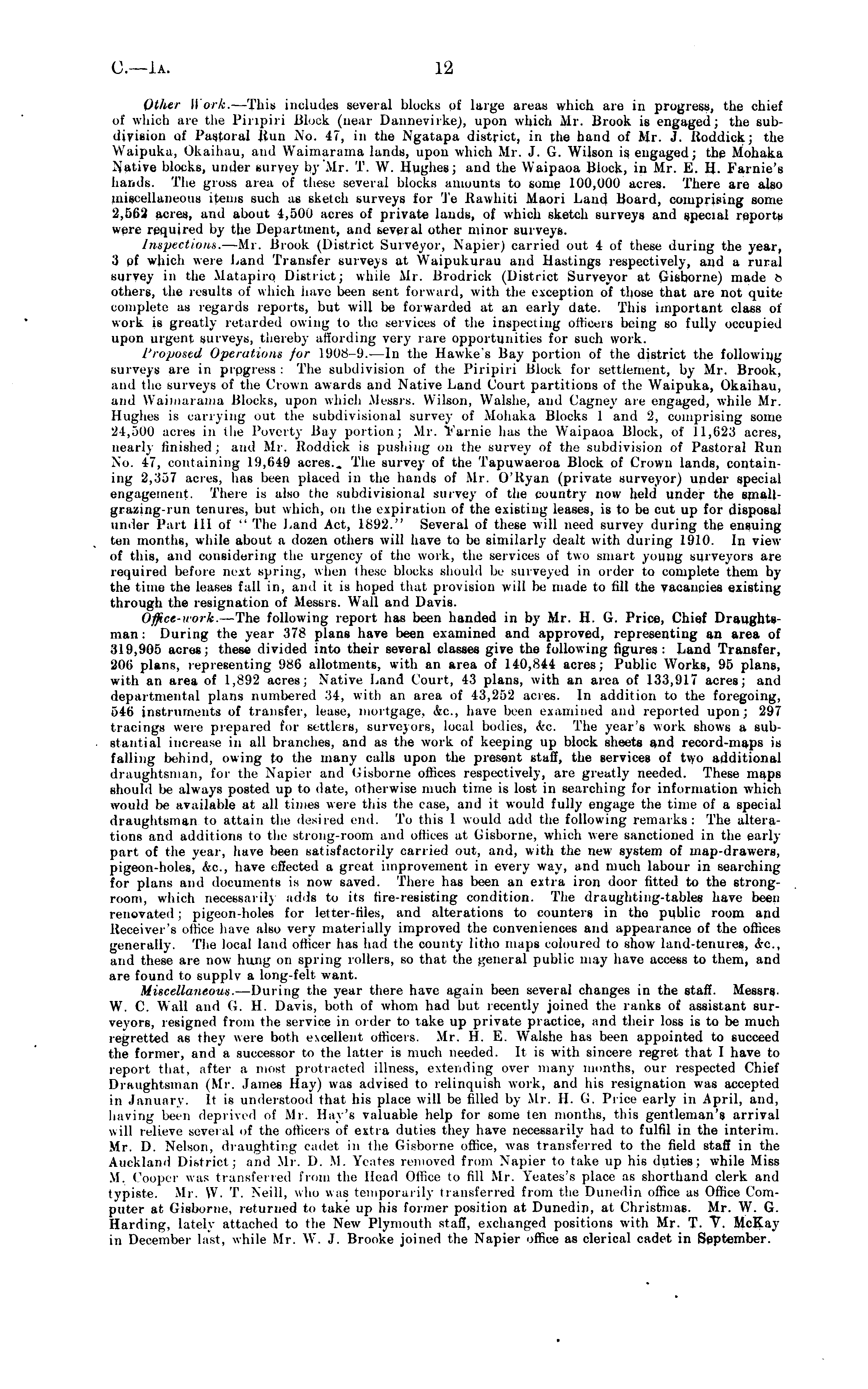 Other Work. —This includes several blocks of large areas which arc in progress, the chief of which are the Piripiri Block (near Dannevirke), upon which Air. Brook is engaged; the subdivision ol Pastoral Run No. 17, in tlie Ngatapa district, in ihe hainl of Air. J. Roddick; the Waipuka, Okaihau, and Waimarama lands, upon which Mi , . .). G. Wilson is engaged; the Mohaka Native blocks, under survey by' Air. T. W. Hughes; and the \\ aipaoa, Block, in Air. E. 11. Sarnie's haiids. The gross area of these several blocks amounts to some 100,000 acres. There are also miscellaneous items such as sketch surveys for Te Rawhiti Maori I.and Board, comprising some -. .~j<>li acres, auo alioul 1,500 acres of private lands, of which sketch surveys and special reports were required by the Department, and several qther minor surveys. Inspection*. Mr. Brook (District Surveyor, Napier) carried out 4of these during the year, •'i of which wore Land Transfer surveys at Waipukurau and Hastings respectively, and a rural survey in the Alatapiro District; while .\lr. lirodrick (District Surveyor at Gisbornej made < s others, the results of which have been sent forward, with the exception of those that are not quite complete as regards reports, but will be forwarded ai an early date. This important class of work is greatlj retarded owing to the services of the inspecting officers being so fully occupied upon llfgenj surveys, thereby affording very rare opportunities for such work. Propotfd opt rut tun* fur 1908—9. — In the llawke s Hay portion of the district the following surveys are in progress: The subdivision of the Piripiri Block for settlement, by Air. Brook, and i lie surveys of the Crown awards am! Native Land Court partitions of the Waipuka, Okaihau, ami Waiiiiarama Blocks, upon which Messrs. Wilson, Walslie, am! Cagnev are engaged, while Mr. Hughes is carrying out tin- eubdivieional survey of Mohaka Blocks I and 2, comprising some 24,500 Hires in the Poverty Bay portion; Air. Varnie has the Waipaoa Block, of 11,623 acres, nearh finished; and Mr. Roddick is pushing on the survey of the subdivision of Pastoral Run No. 17, containing 1!),(i49 acres.. The survey of the Tapuwaeroa Block of Crown lands, containing 2, '■'>')! acres, lias been placed m the bands of Mr. (I l!\an (private surveyor) under special engagement There is also liie SubdivisionaJ survey of the country now held under the smallgra/ing run teiiuies, but which, on the expiration of the existing leases, is to be cut up for disposal under I , art 111 of " The Land Act, 1893." Several of tliese will need survey during the ensuing ien months, while about a dozen others will have to be similarly dealt with during 1910. In view of this, ami considering the urgency of the work, the services of two smart young surveyors are required before next spring, when these blocks should be surveyed in order to complete them by the time the leases fall in, and it is hoped thai provision will he made to lill the vacancies existing through the resignation of Messrs. Wall and Davis. Ojfiee-worlt. The following report has been handed in by Air. 11. G. Price, Chief Draughtsman: During the pear "nr* plans have been examined and approved, representing an area of 819,966 acres; these divided into their several classes give the following figures: Land Transfer, 806 plans, representing 986 allotments, with an area of 140,844 acres; Public Works, 9i) plans, with an area of acres; Native Land Court, 13 plans, with an area of 133,917 acres; and departmental plans numbered 34, with an area of 43,852 acres. In addition to the foregoing, ."ilti instruments of transfer, lease, mortgage, ivc, have been examined and reported upon; 297 tracings were prepared for settlers, surveyors, local bodies, to. The year's work shows a sub stantial increase in all brandies, and as the work of keeping up block sheets and record-maps is falling behind, owing to the man} c:dlx upon the | taff, the service's of two additional draughtsman, for the Napier and Gisborne offices respectively, arc greatly needed. These maps should lie always posted up to date, otherwise much time is lost in searching for information which would be available at all times were this the ease, anil it would fully engage the time of a special draughtsman to attain the desired end. To this I would add the following remarks: The alt tions ami additions to the strong-room and offioes at Gisborne, which were sanctioned in the early part of the year, have lit en satisfactorily (tarried out, and, with the new system of map-drawers, pigeon-holes, &.0., have effected a great improvement in every way, and much labour in searching for plans and documents is now saved. There has been an extra iron door fitted to the strongroom, which neeessai ih adds to its tire-resisting condition. The draught ing-tables have been renovated: pigeon-holes for letter-files, and alterations to counters in the public room and Receiver's office have also very materially improved the conveniences and appearance of the offices generally. The local land officer has had the county litho maps coloured to show Land-tenure*., &c, and tliese are now hung on spring rollers, so that the general public may have' access to them, and are found to supply a long-felt want. M/.<{■>//a/irons. —During the year there have again been several changes in the staff. Messrs. W. C. Wall and G. H. Davis, both of whom had but recently joined the ranks of assistant surveyors, resigned from the service in order to take up private practice, and their loss is to be much regretted as they were both excellent offioers. Air. H. E. Walslie has been appointed to succeed the former, and a successor to the latter is much needed. It is with sincere regret that I have to report that, after a most protracted illness, extending over main months, our respected Chief Draughtsman (Mr. James Hay) was advised to relinquish work, and his resignation was accepted in January. It is understoo