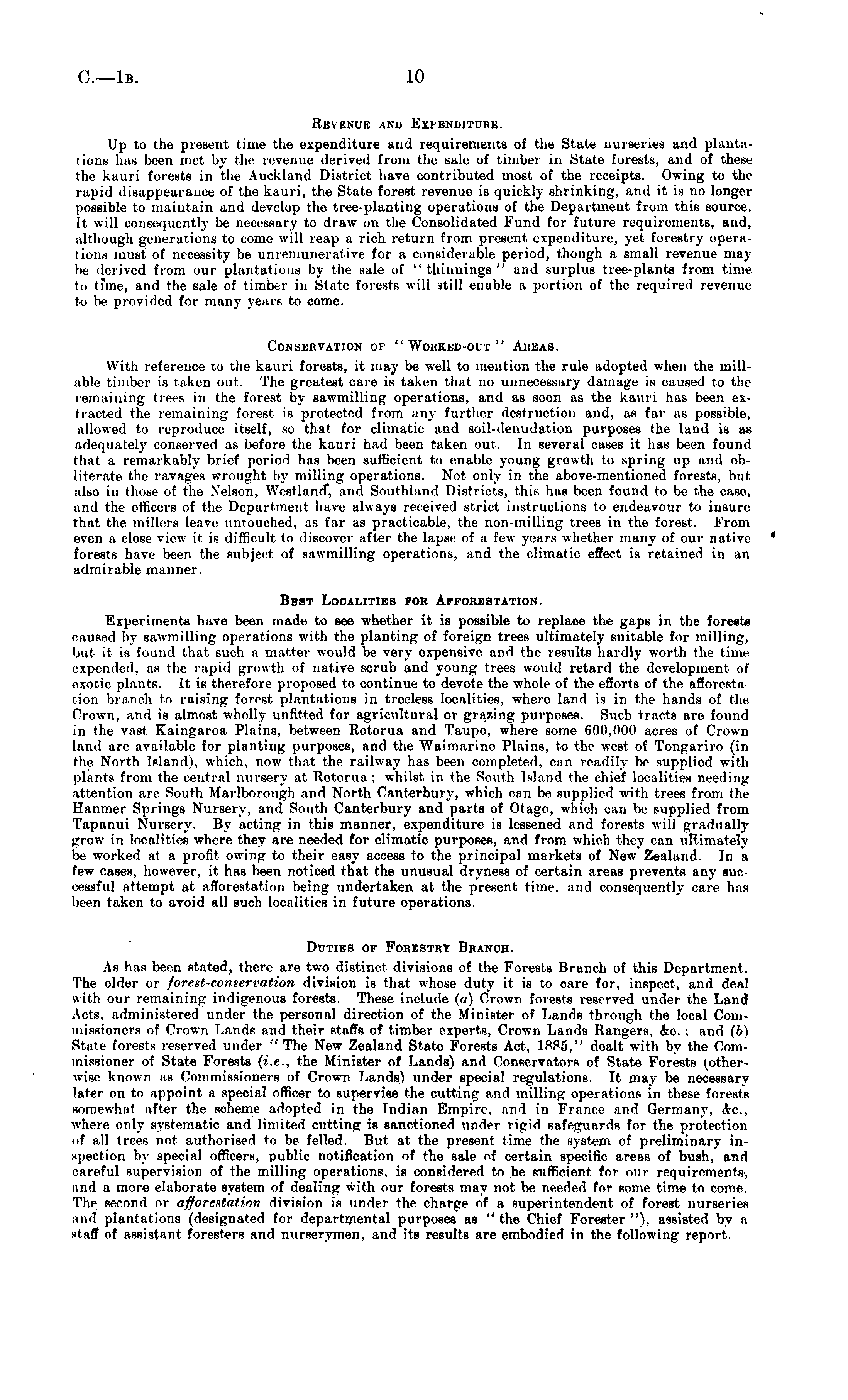 RIVIKDI \XD ExPENDITUHK. Up to the present time the expenditure and requirements of the State nurseries and plantations has been met by the revenue derived from the sale of timber in State forests, and of these the kauri forests in the Auckland District have contributed most of the receipts. Owing to the rapid disappearance of the kauri, the State forest revenue is quickly shrinking, and it is no longer possible to maintain and develop the tree-planting operations of the Department from this source. It will consequently be necessary to draw on the Consolidated Fund for future requirements, and, although generations to come will reap a rich return from present expenditure, yet forestry operations must of necessity be unremunerative for a considerable period, though a small revenue may lie derived from our plantations by the sale of "thinnings" and surplus tree-plants from time to time, and the sale of timber in State forests will still enable a portion of the required revenue to Ik> provided for many years to come. Conservation of " Wokked-out " Areas. With reference to the kauri forests, it may be well to mention the rule adopted when the millable timber is taken out. The greatest care is taken that no unnecessary damage is caused to the remaining tiers in the forest by sawniilling operations, and as soon as the kauri has been extracted the remaining forest is protected from any further destruction and, as far as possible, allowed to reproduce itself, so that for climatic and soil-denudation purposes the land is as adequately conserved as before the kauri had been taken out. In several cases it has been found that a remarkably brief period has been sufficient to enable young growth to spring up and obliterate the ravages wrought by milling operations. Not only in the above-mentioned forests, but also in those of the Nelson, Westland*, and Southland Districts, this has been found to be the case, and the officers of the Department have always received strict instructions to endeavour to insure that the millers leave untouched, as far as practicable, the non-milling trees in the forest. From even a close view it is difficult to discover after the lapse of a few years whether many of our native ' forests have been the subject of sawmilling operations, and the climatic effect is retained in an admirable manner. Best Localities for Afforestation. Experiments have been made to see whether it is possible to replace the gups in the forests caused by sawmilling operations with the planting of foreign trees ultimately suitable for milling, but it is found that such a matter would be very expensive and the results hardly worth the time expended, as the rapid growth "f native scrub and young trees would retard the development of exotic plants. It is therefore proposed to continue to devote the whole of the efforts of the afforest a tion branch to raising forest plantations in treeless localities, where land is in the hands of the Crown, and is almost wholly unfitted for agricultural or grazing purposes. Such tracts are found in the vast Kaingaroa Plains, between Rotorua and Taupo, where some 600,000 acres of Crown land are available for planting purposes, and the Waimarino Plains, to the west of Tongariro (in the North Island), which, now that the railway has been completed, can readily lie supplied witli plants from the central nursery at Rotorua; whilst in the South Island the chief localities needing attention are South Marlborough and North Canterbury, which can be supplied with trees from the Hanmer Springs Nursery, and South Canterbury and parts of Otago, which can be supplied from Tapanui Nursery. By acting in this manner, expenditure is lessened and forests will gradually grow in localities where they are needed for climatic purposes, and from which they can ultimately be worked at a profit owing to their easy access to the principal markets of New Zealand. In a few cases, however, it has been noticed that the unusual dryness of certain areas prevents any successful attempt at afforestation being undertaken at the present time, and consequently care has been taken to avoid all such localities in future operations. Duties of Forestry Branch. As has been stated, there are two distinct divisions of the Forests Branch of this Department. The older or forest-conservation division is that whose duty it is to care for, inspect, and deal with our remaining indigenous forests. These include (a) Crown forests reserved under the Land Acts, administered under the personal direction of the Minister of Lands through the local Commissioners of Crown Lands and their staffs of timber experts. Crown Lands Rangers, &o. : and (b) State forests reserved under " The New Zealand State Forests Act, 1585," dealt with by the Commissioner of State Forests (i.e., the Minister of Lands) and Conservators of State Forests (otherwise known as Commissioners of Crown Lands) under special regulations. It may be necessary later on to appoint a special officer to supervise the cutting and milling operations in these forests somewhat after the scheme adopted in the Indian Empire, and in France and Germany, <Vc where only systematic and limited cutting is sanctioned under rigid safeguards for the protection <>f all trees not authorised to be felled. But at the present time the system of preliminary inspection by special officers, public notification of the sale of certain specific areaß of bush, and careful supervision of the milling operations, is considered to be sufficient for our requirements, and a more elaborate system of dealing with our forests may not be needed for some time to come. The second or afforestation division is under the charge of a superintendent of forest nurseries and plantations (designated for departmental purposes as " the Chief Forester "), assisted by a staff of assistant foresters and nurserymen, and its results are embodied in the following report.
