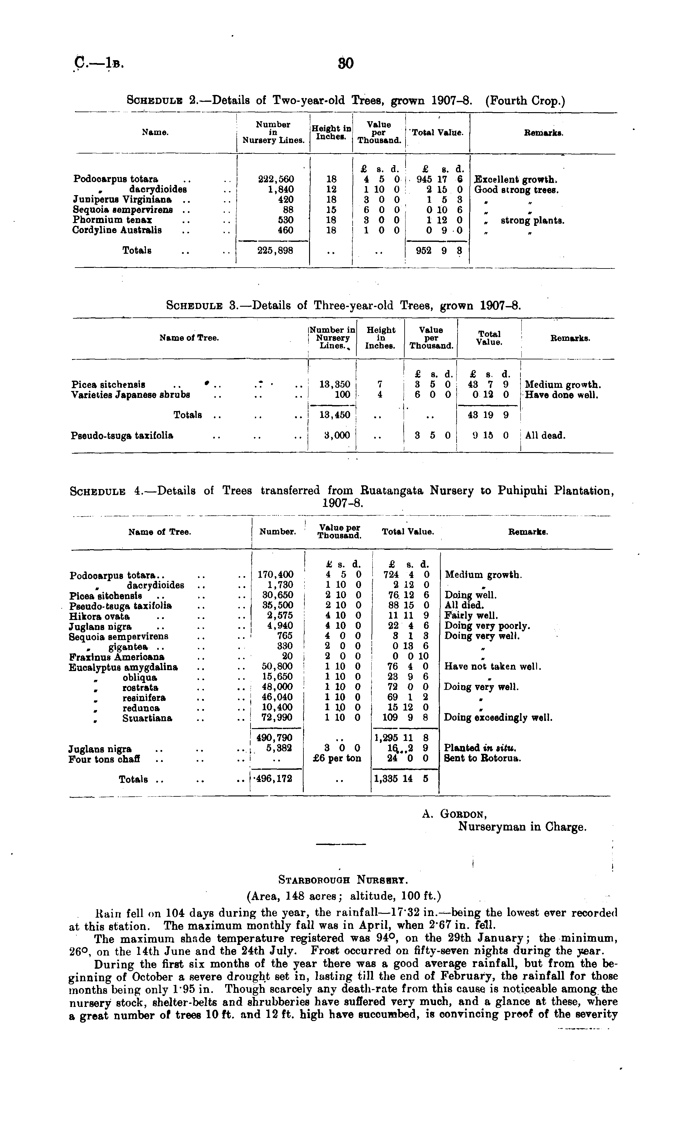 Name of Tree. Number. Value per Thousand. Total Value. Remarks. Podooarpus totara.. dacrydioides Picea eitchensU Pseudo-tsuga taxifolia Hikora ovata Juglans nigra Sequoia sempervirens , gigantea .. Fraxinus Americana Eucalyptus amygdalina obliqua , rostrata resinifera redunca Stuartiana Juglans nigra Four tons chafl Totals .. .. 170,400 1,730 .. 30,650 .. 35,500 .. I 2,575 .. J 4,940 .. I 765 330 20 .. 50,800 15,650 .. 48,000 .. I 46,040 10,400 .. ! 72,990 490,790 5,382 .. -496,172 H s. d. 4 5 0 1 10 0 2 10 0 2 10 0 4 10 0 4 10 0 4 0 0 2 0 0 2 0 0 1 10 0 1 10 0 1 10 0 1 10 0 1 10 0 1 10 0 £ s. d. 724 4 0 2 12 0 7(5 12 6 88 15 0 11 11 9 22 4 6 3 13 0 13 6 0 0 10 76 4 0 23 9 6 72 0 0 69 1 2 15 12 0 109 9 8 Medium growth. Doing well. All died. Fairly well. Doing very poorly. Doing very well. Have not taken well. Doing very well. Doing exceedingly well. 3 0 0 £G per ton 1,295 11 8 16...2 9 24 0 0 Planted in situ. Sent to Botorua. 1,335 14 5 A. GOBDON, Nurseryman in Charge.