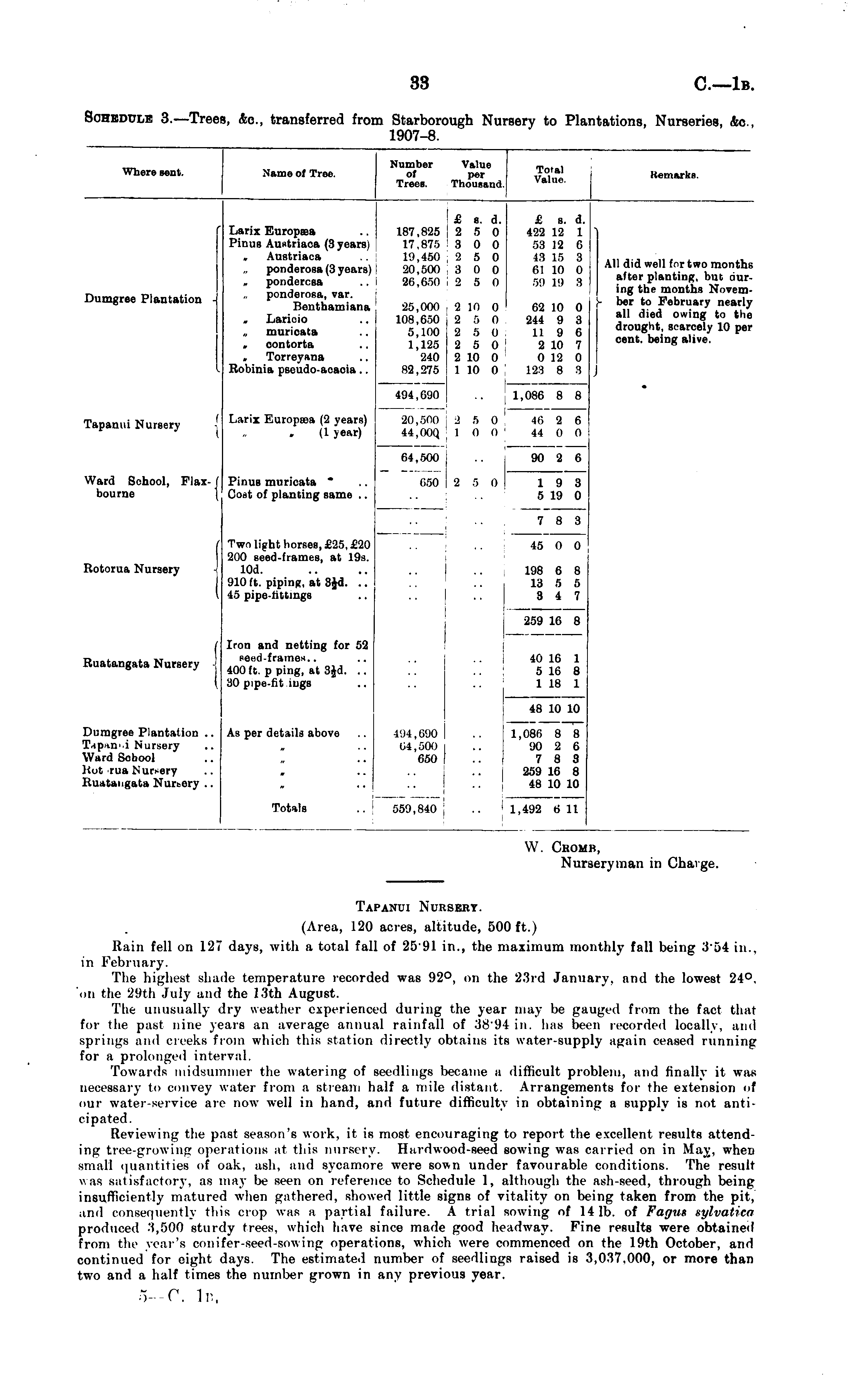 Where sent. Name of Tree. Jumber of Trees. Value per Thousand. Total Valne. Remarks. Larix Europsea Pinue Auntriaca (3 years) . Austriaca ponderosa (3 years) , pondercsa ponderosa, var. Benthamiana » Larii'io muricata „ contorta » Torreyana Robinia pseudo-acacia.. 187,825 17,875 19,450 20,500 86,650 £ s. d. £ g. d. 2 5 0 422 12 1 3 0 0 58 18 G 2 8 0 43 15 3 3 0 0 61 10 0 •1 5 0 59 19 8 £ s. d. 422 12 1 58 IS 6 43 15 3 61 10 0 59 L9 8 Dumgree Plantation i I 25,000 108,650 5,100 1,125 240 82,275 2 10 0 62 10 0 a 5 o 244 ii a 3 5 0 11 9 6 2 5 () 2 10 7 2 10 0 0 12 0 1 10 0 133 8 3 62 10 0 244 8 8 119 6 2 10 7 0 12 0 133 8 3 All did well for two months after planting, but during the months November to February nearly all died owing to tuc drought, scarcely 10 per cent, being alive. I Tapanui Nursery Larix Europcea (2 years) (1 year) 494,690 20,500 1 44,00Q 64,500 1,086 8 8 2 ft 0 46 2 6 1 0 II 44 (i n 1,086 8 8 46 2 6 44 (i li • 90 2 6 90 2 6 Ward School, Flax- f bourne Pinue muricata * Cost of planting same .. 650 2 5 0 19 3 5 19 0 7 8 3 Rotorua Nursery -I Two light horses, £25, £20 200 seed-frames, at 19s. 10d. 910 ft. piping, at 3£d. .. 45 pipe-iittinge 43 0 0 198 6 8 13 5 5 3 4 7 259 16 8 Buatangata Nursery J Iron and netting for 52 seed-frame*.. 400 ft. p ping, at 3Jd. .. 30 pipe-fit iijgs 40 16 1 5 16 8 1 18 1 48 10 10 Dumgree Plantation .. Tip mi i Nursery Ward School Hut rua Nursery HuAtangata Nursery .. As per details above 494, 690 u4,")0n 650 f 1,086 8 8 'JO 2 6 7 8 3 259 16 8 48 10 10 • • - Totals 559,840 ; 1,492 t> 11 W. Choj Nui IB, ser man in Chaii :<■■