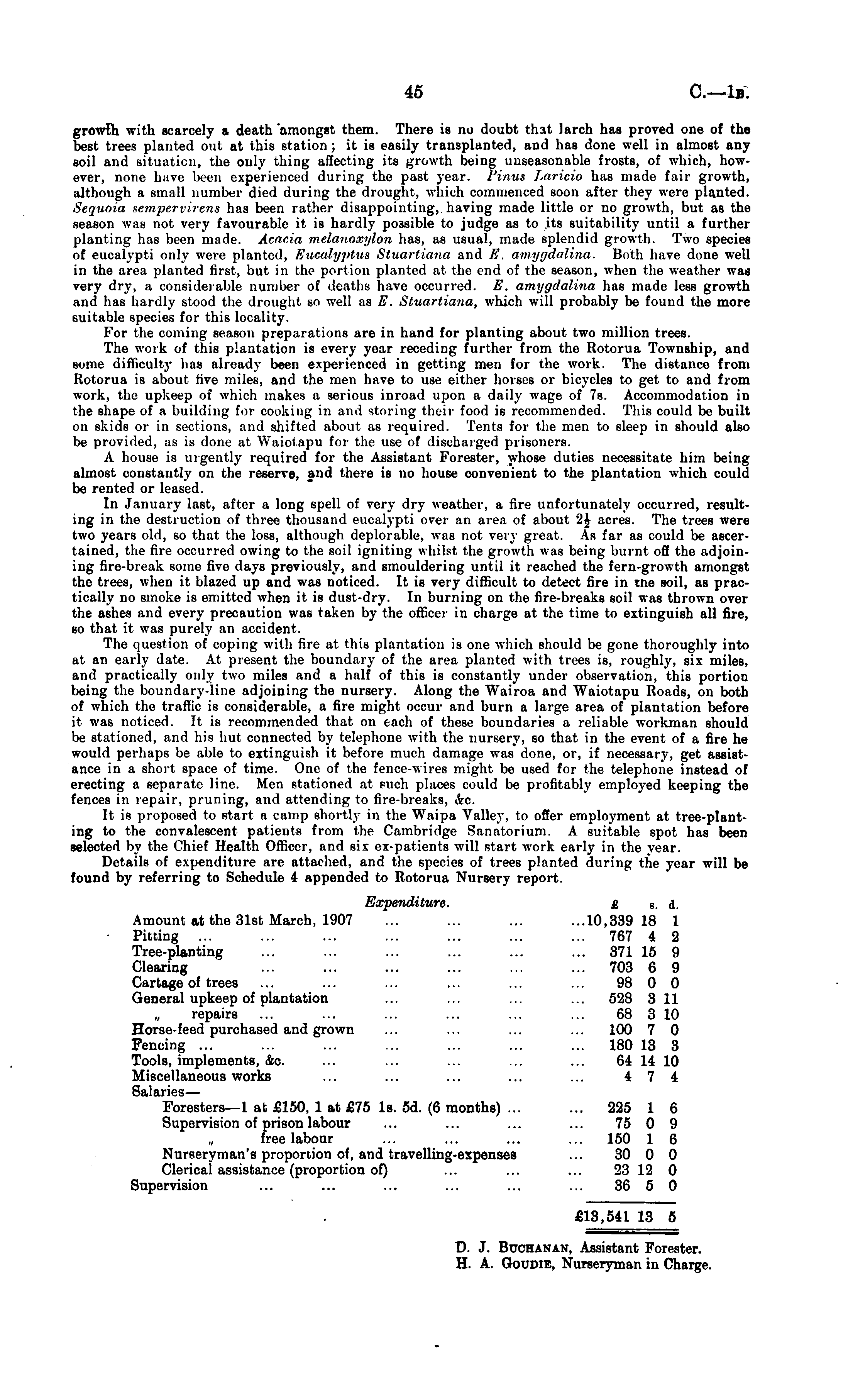 growlh with scarcely a death 'amongst them. There is no doubt that larch has proved one of the best trees planted out at this station; it is easily transplanted, and has done well in almost any soil and situation, the only thing affecting its growth being unseasonable frosts, of which, however, none have been experienced during the past year. I'inus Laricio has made fair growth, although a small number died during the drought, which commenced soon after they were planted. Sequoia sempervirent has been rather disappointing, having made little or no growth, but as the season was not very favourable it is hardly possible to judge as to its suitability until a further planting lias been made. Acacia wtlanoxylon has, as usual, made splendid growth. Two species of eucalypti only were planted, Eucalyptus Stuartiana and E. amygdalina. Both have done well in the area planted first, but in the portion planted at the end of the season, when the weather was very dry, a considerable number of deaths have occurred. E. amygdalina has made less growth and has hardly stood the drought so well as E. Stuartiana, which will probably be found the more suitable species for this locality. For the coming season preparations are in hand for planting about two million trees. The work of this plantation is every year receding further from the Rotorua Township, and some difficulty has already been experienced in getting men for the work. The distance from Rotorua is about five miles, and the men have to use either horses or bicycles to get to and from work, the upkeep of which makes a serious inroad upon a daily wage of 7s. Accommodation in the shape of a building for cooking in and storing their food is recommended. This could be built on skids or in sections, and shifted about as required. Tents for the men to sleep in should also be provided, as is done at Waiolapu for the use of discharged prisoners. A house is urgently required for the Assistant Forester, whose duties necessitate him being almost constantly on the reserve, and there is no house convenient to the plantation which could be rented or leased. In January last, after a long spell of very dry weather, a fire unfortunately occurred, resulting in the destruction of three thousand eucalypti over an area of about 2| acres. The trees were two years old, so that the loss, although deplorable, was not very great. Ar far as could be ascertained, the fire occurred owing to the soil igniting whilst the growth was being burnt off the adjoining fire-break some five days previously, and smouldering until it reached the fern-growth amongst the trees, when it blazed up and was noticed. It is very difficult to detect fire in the soil, as practically no smoke is emitted when it is dust-dry. In burning on the fire-breaks soil was thrown over the ashes and every precaution was taken by the officer in charge at the time to extinguish all fire, so that it was purely an accident. The question of coping with fire at this plantation is one which should be gone thoroughly into at an early date. At present the boundary of the area planted with trees is, roughly, six miles, and practically only two miles and a half of this is constantly under observation, this portion being the boundary-line adjoining the nursery. Along the Wairoa and Waiotapu Roads, on both of which the traffic is considerable, a fire might occur and burn a large area of plantation before it was noticed. It is recommended that on each of these boundaries a reliable workman should be stationed, and his hut connected by telephone with the nursery, so that in the event of a fire he would perhaps be able to extinguish it before much damage was done, or, if necessary, get assistance in a short space of time. One of the fence-wires might be used for the telephone instead of erecting a separate line. Men stationed at such places could be profitably employed keeping the fences in repair, pruning, and attending to fire-breaks, tfeo. It is proposed to start a camp shortly in the Waipa Valley, to offer employment at tree-plant-ing to the convalescent patients from the Cambridge Sanatorium. A suitable spot has been selected by the Chief Health Officer, and six ex-patients will start work early in the year. Details of expenditure are attached, and the species of trees planted during the year will be found by referring to Schedule 4 appended to Rotorua Nursery report. Expenditure. £ 8 . d. Amount at the 31st March, 1907 ... ... ... ...10,339 18 1 ■ Pitting ... ... ... ... ... ... ... 767 4 2 Tree-planting ... ... ... ... ... ... 371 15 9 Clearing ... ... ... ... ... ... 703 6 9 Cartage of trees ... ... ... ... ... ... 98 0 0 General upkeep of plantation ... ... ... ... 528 311 „ repairs ... ... ... ... ... ... 68 310 Horse-feed purchased and grown ... ... ... ... 100 7 0 Fencing ... ... ... ... ... ... ... 180 13 3 Tools, implements, &c. ... ... ... ... ... 64 14 10 Miscellaneous works ... ... ... ... ... 4 7 4 Salaries— Foresters—l at £150, lat £75 Is. sd. (6 months) ... ... 225 1 6 Supervision of prison labour ... ... ... ... 75 0 9 „ free labour ... ... ... ... 150 1 6 Nurseryman's proportion of, and travelling-expenses ... 30 0 0 Clerical assistance (proportion of) ... ... ... 23 12 0 Supervision ... ... ... ... ... ... 36 5 0 £13,541 13 5 D. J. Buchanan, Assistant Forester. H. A. Goudie, Nurseryman in Charge.