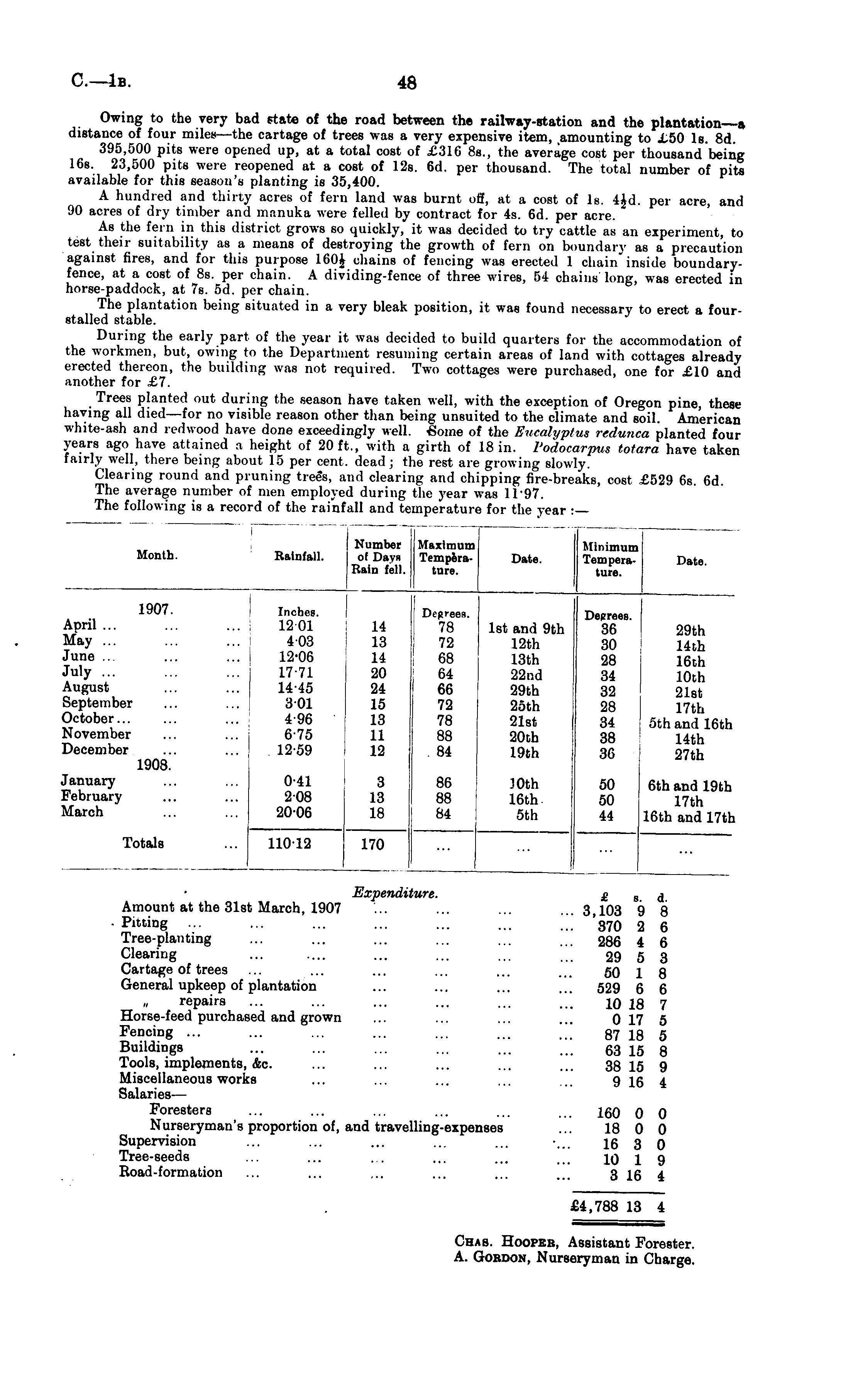 • Expenditure. f s d Amount at the 31st March, 1907 ... ... ... ... 3,103 9 8 • Pitting ... ... ... ... ... ... ... '370 2 6 Tree-planting ... ... ... ... ... ... 286 4 6 Clearing ... ... ... ... ... 29 5 3 Cartage of trees ... ... ... ... ... ... 50 1 8 General upkeep of plantation ... ... ... ... 529 6 6 repairs ... ... ... ... ... ... 10 18 7 Horse-feed purchased and grown ... ... ... ... 0 17 5 Fencing ... ... ... ... ... ... ... 8 7 18 5 Buildings ... ... ... ... ... ... 63 15 8 Tools, implements, &c. ... ... ... ... ... 38 15 9 Miscellaneous works ... ... ... ... .. 9 16 4 Salaries— Foresters ... ... ... ... ... ... 160 0 0 Nurseryman's proportion of, and travelling-expenses ... 18 0 0 Supervision ... ... ... ... ... ... 16 3 0 Tree-seeds ... ... . . ... ... 10 1 9 Road-formation ... ... ... ... ... ... 316 4 £4,788 13 4 Chas. Hooper, Assistant Forester. A. Gordon, Nurseryman in Charge.