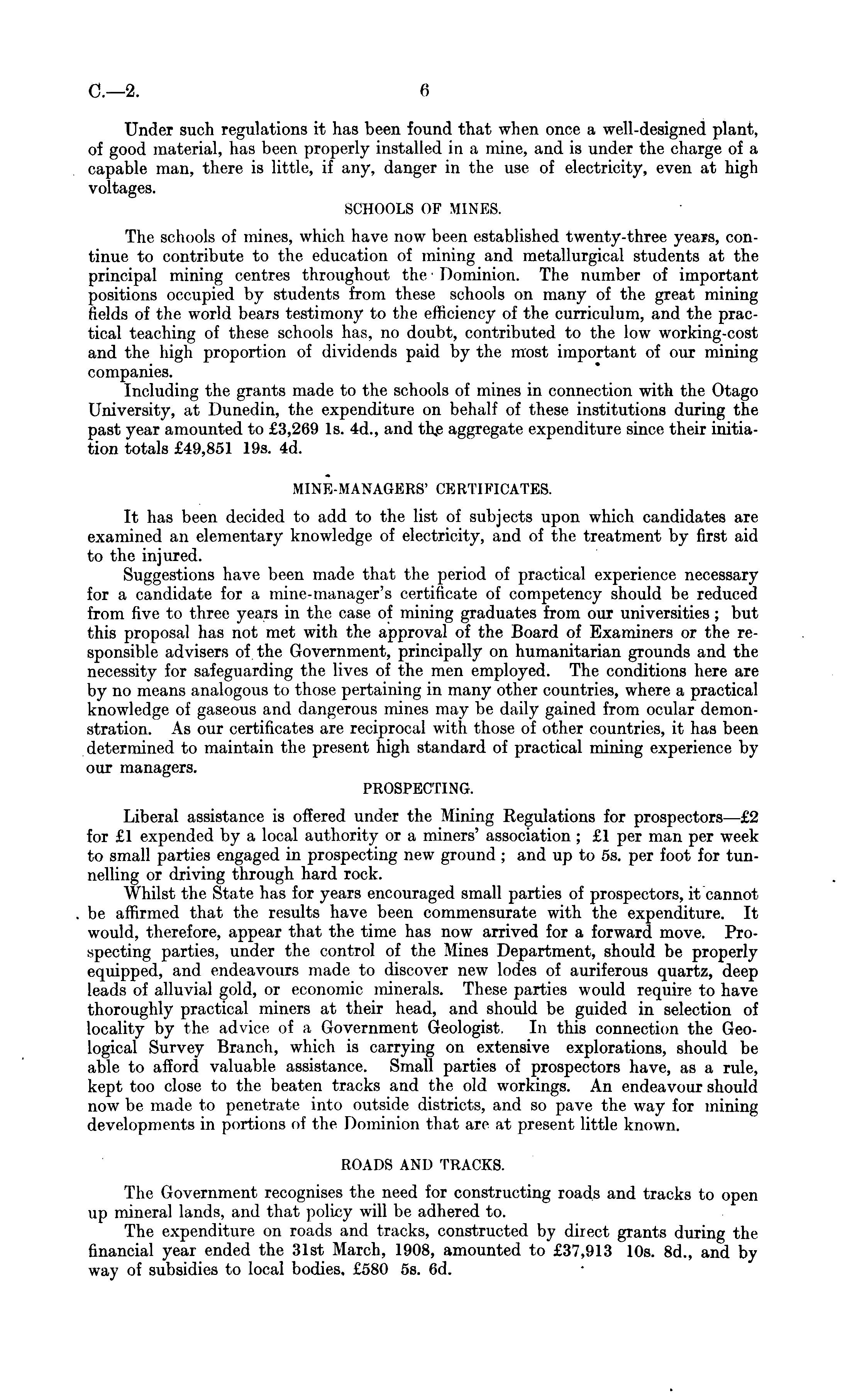 Under such regulations it has been found that when once a well-designed plant, of good material, has been properly installed in a mine, and is under the charge of a capable man, there is little, if any, danger in the use of electricity, even at high voltages. SCHOOLS OF MINES. The schools of mines, which have now been established twenty-three years, continue to contribute to the education of mining and metallurgical students at the principal mining centres throughout the ■ Dominion. The number of important positions occupied by students from these schools on many of the great mining fields of the world bears testimony to the efficiency of the curriculum, and the practical teaching of these schools has, no doubt, contributed to the low working-cost and the high proportion of dividends paid by the most important of our mining companies. Including the grants made to the schools of mines in connection with the Otago University, at Dunedin, the expenditure on behalf of these institutions during the past year amounted to £3,269 Is. 4d., and the aggregate expenditure since their initiation totals £49,851 19s. 4d. MINE-MANAGERS' CERTIFICATES. It has been decided to add to the list of subjects upon which candidates are examined an elementary knowledge of electricity, and of the treatment by first aid to the injured. Suggestions have been made that the period of practical experience necessary for a candidate for a mine-manager's certificate of competency should be reduced from five to three years in the case of mining graduates from our universities; but this proposal has not met with the approval of the Board of Examiners or the responsible advisers of the Government, principally on humanitarian grounds and the necessity for safeguarding the lives of the men employed. The conditions here are by no means analogous to those pertaining in many other countries, where a practical knowledge of gaseous and dangerous mines may be daily gained from ocular demonstration. As our certificates are reciprocal with those of other countries, it has been determined to maintain the present high standard of practical mining experience by our managers. PROSPECTING. Liberal assistance is offered under the Mining Regulations for prospectors —£2 for £1 expended by a local authority or a miners' association ; £1 per man per week to small parties engaged in prospecting new ground ; and up to ss. per foot for tunnelling or driving through hard rock. Whilst the State has for years encouraged small parties of prospectors, it cannot be affirmed that the results have been commensurate with the expenditure. It would, therefore, appear that the time has now arrived for a forward move. Prospecting parties, under the control of the Mines Department, should be properly equipped, and endeavours made to discover new lodes of auriferous quartz, deep leads of alluvial gold, or economic minerals. These parties would require to have thoroughly practical miners at their head, and should be guided in selection of locality by the advice of a Government Geologist. In this connection the Geological Survey Branch, which is carrying on extensive explorations, should be able to afford valuable, assistance. Small parties of prospectors have, as a rule, kept too close to the beaten tracks and the old workings. An endeavour should now be made to penetrate into outside districts, and so pave the way for mining developments in portions of the Dominion that are at present little known. ROADS AND TRACKS. The Government recognises the need for constructing roads and tracks to open up mineral lands, and that policy will be adhered to. The expenditure on roads and tracks, constructed by direct grants during the financial year ended the 31st March, 1908, amounted to £37,913 10s. Bd., and by way of subsidies to local bodies, £580 ss. 6d.